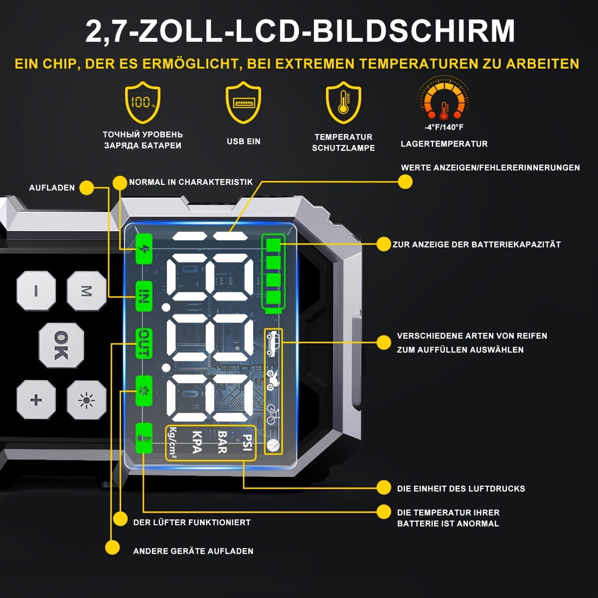 Avviatore di emergenza per auto con compressore d'aria e gonfiatore per pneumatici senza fili, booster per batteria da 7000 A con power bank e torce a LED, avviatore di emergenza da 12 V per tutti i veicoli a benzina o diesel da 10.0 L con custodia per il