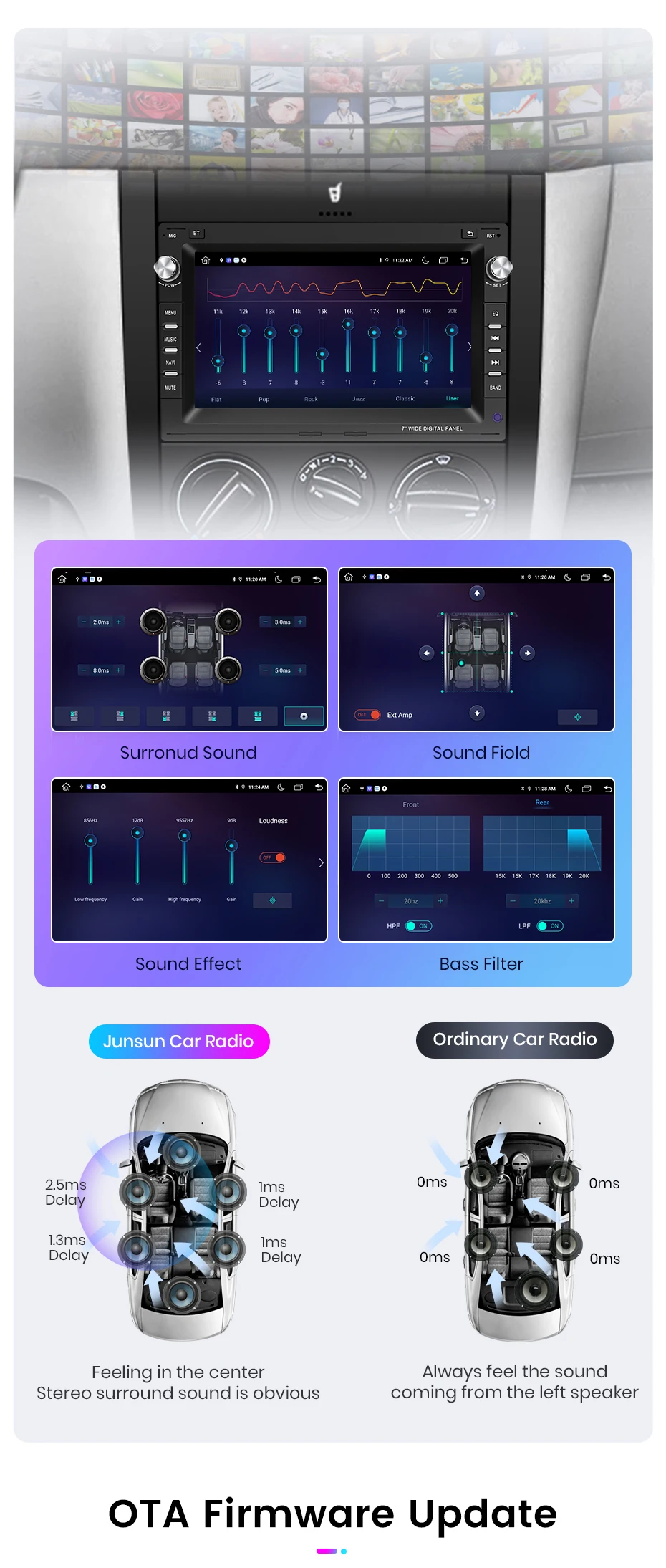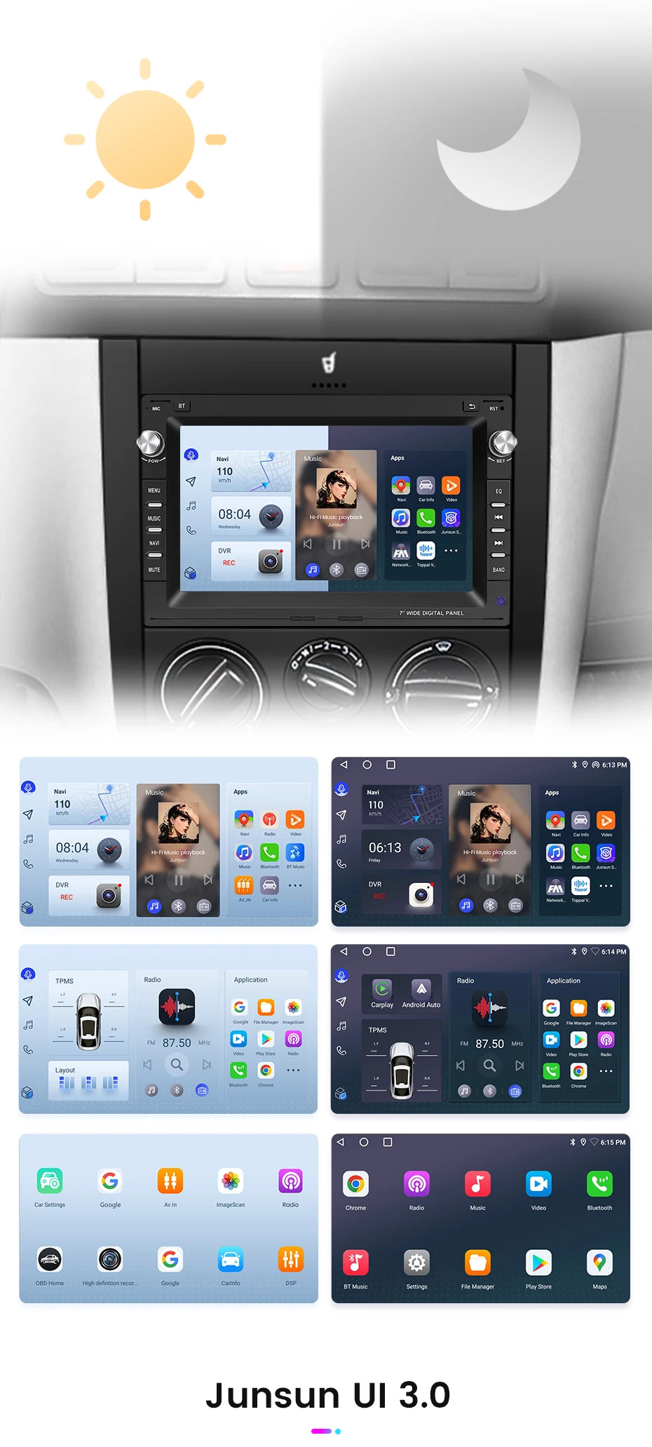 【IPS Display Car Head Unit】The screen is upgraded to IPS with resolution of 1024*600, which brings better color concern, contrast,and brightiness. Enjoy immersive visual experience and Easy operation on the 9/10 Inch big screen. Comes with Junsun UI themes that you can choose from, support day and night model, provide you a safe & comfortable drive experience is special at night.