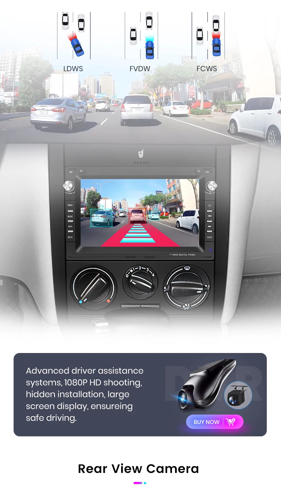 Stay protected on the road with our innovative dual dash camera. It monitors your environment for risks like lane departures and cars, providing timely alerts. Enjoy high-definition recordings from the 1080P front camera and extended reverse support from the 720P rear camera. (Separate purchase required.)