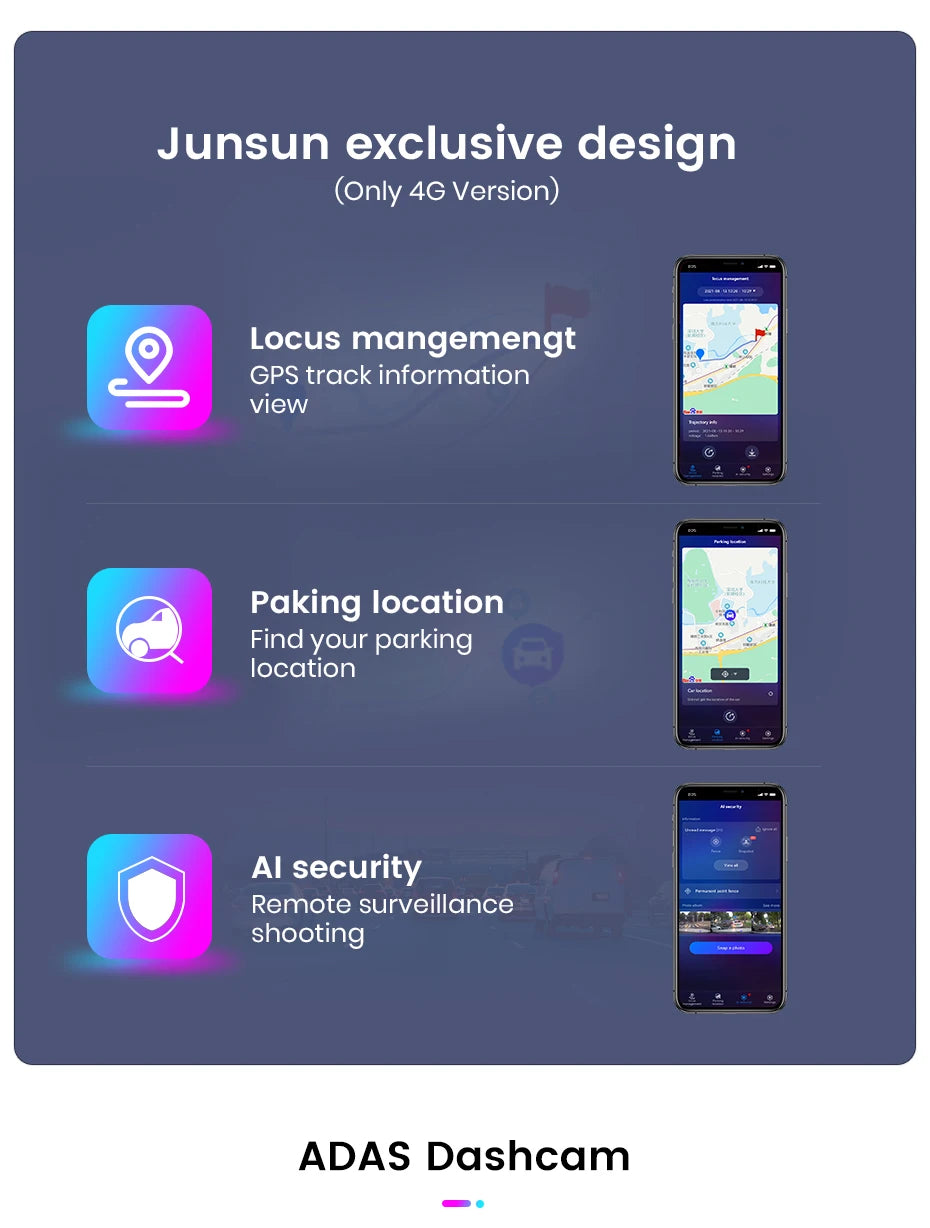 Experience the exclusive "Junsun online" app, designed by Junsun, where you can effortly track your vehicle's real-time rental, replay historical roads, and remotely monitor. This feature not only empty views into your driving performance but also improvement overdriving safety and experience.(Only 4G support version)