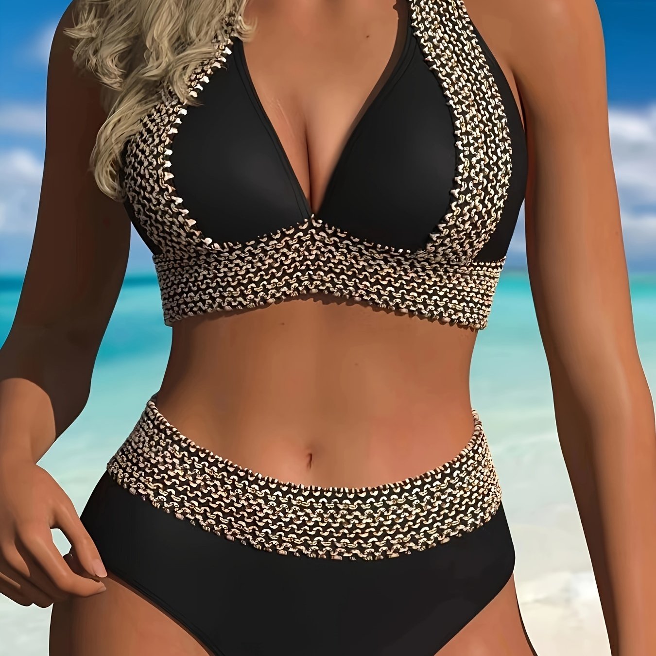 Bikini sexy da donna in taglie plus con scollo a catena dorata - Nero e bianco, costume da bagno in poliestere elasticizzato per spiaggia e piscina, costume da bagno per spiaggia|Bikini con catena|Tessuto elasticizzato