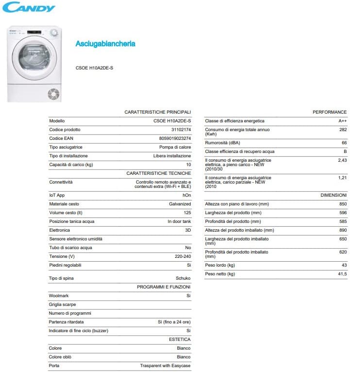 Candy Smart Pro Asciugatrice 10 Kg a Pompa di Calore, Libera Installazione, Classe A++, Connessione Wi-Fi, Controllo da App, Avvio Programmabile, 59,6 x 58,5 x 85 cm, Bianca - CSOE H10A2DE-S