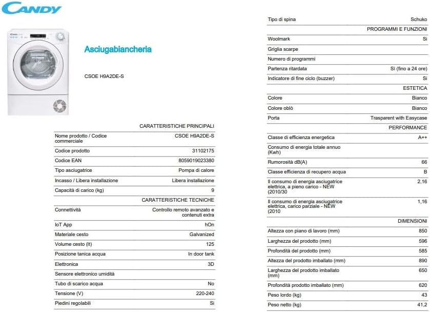 Candy Smart Pro Asciugatrice 9 Kg a Pompa di Calore, Libera Installazione, Classe A++, Connessione Wi-Fi + BLE, Controllo da... Per saperne di più