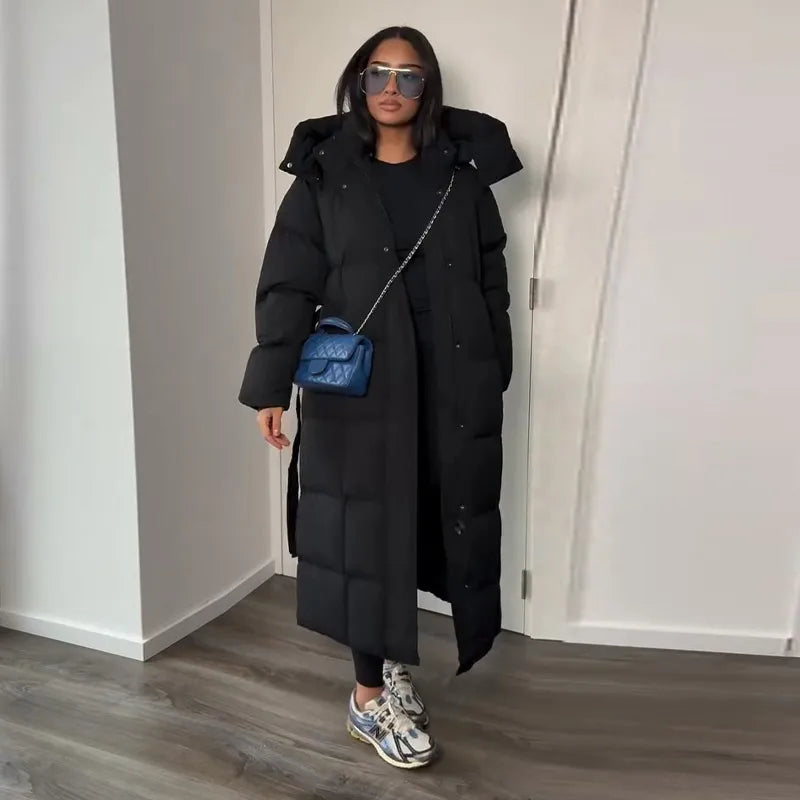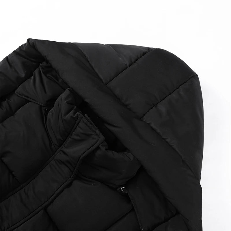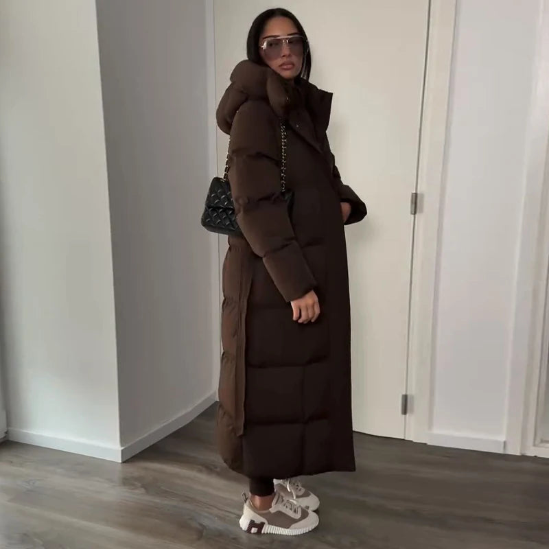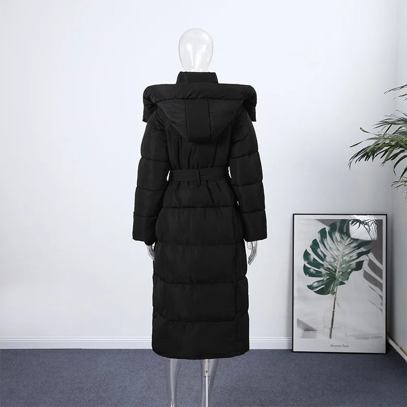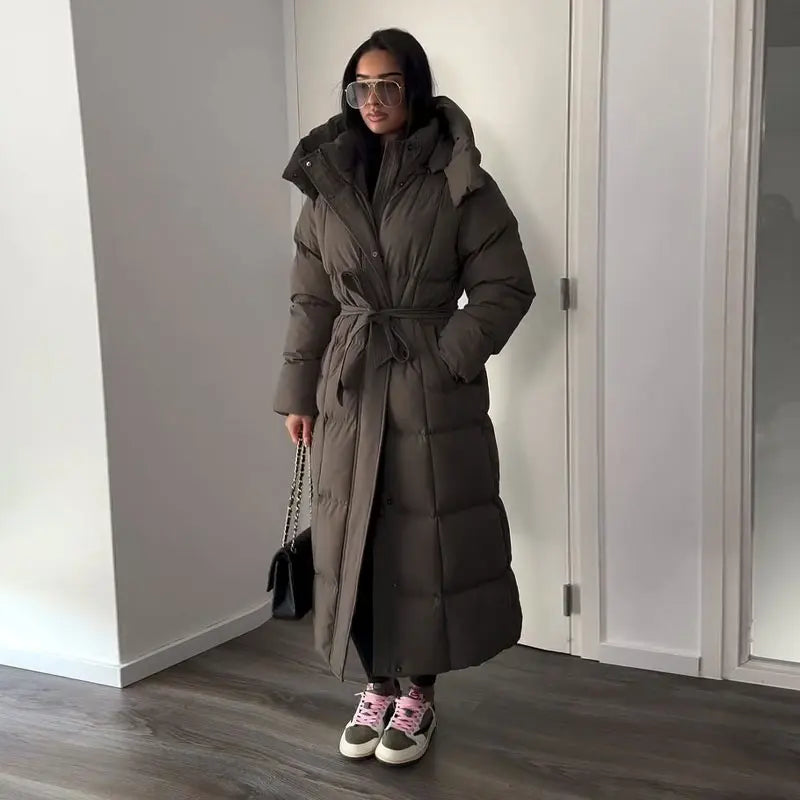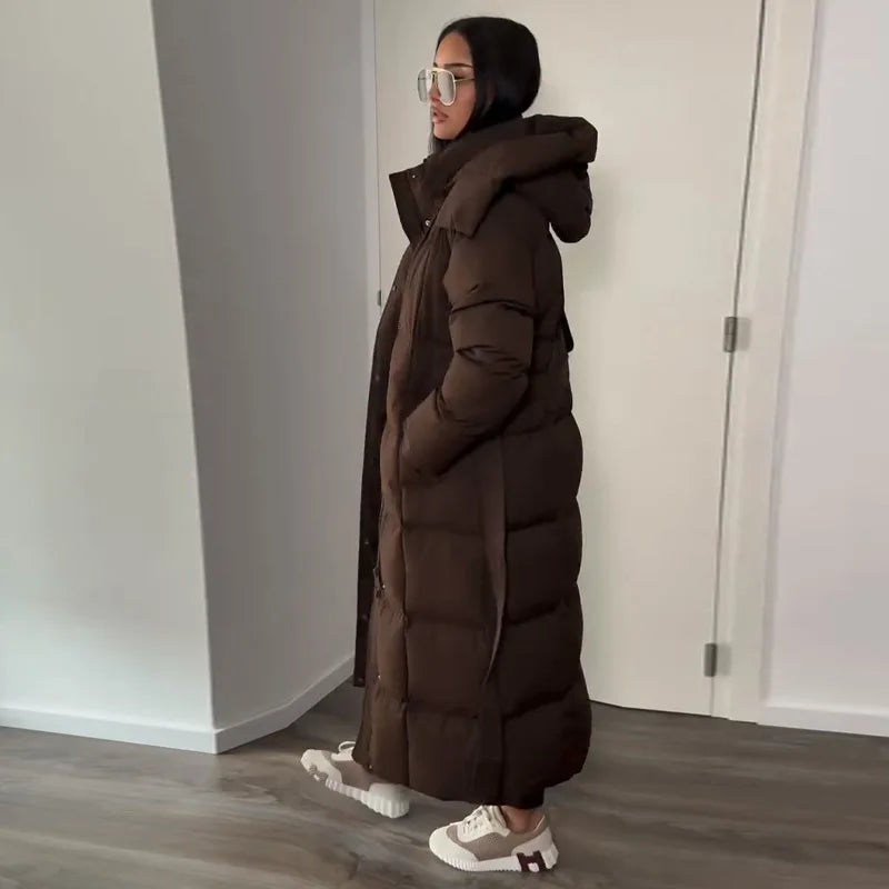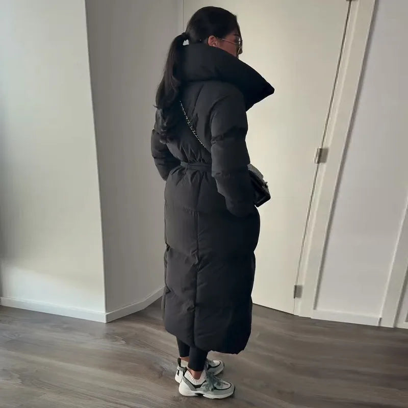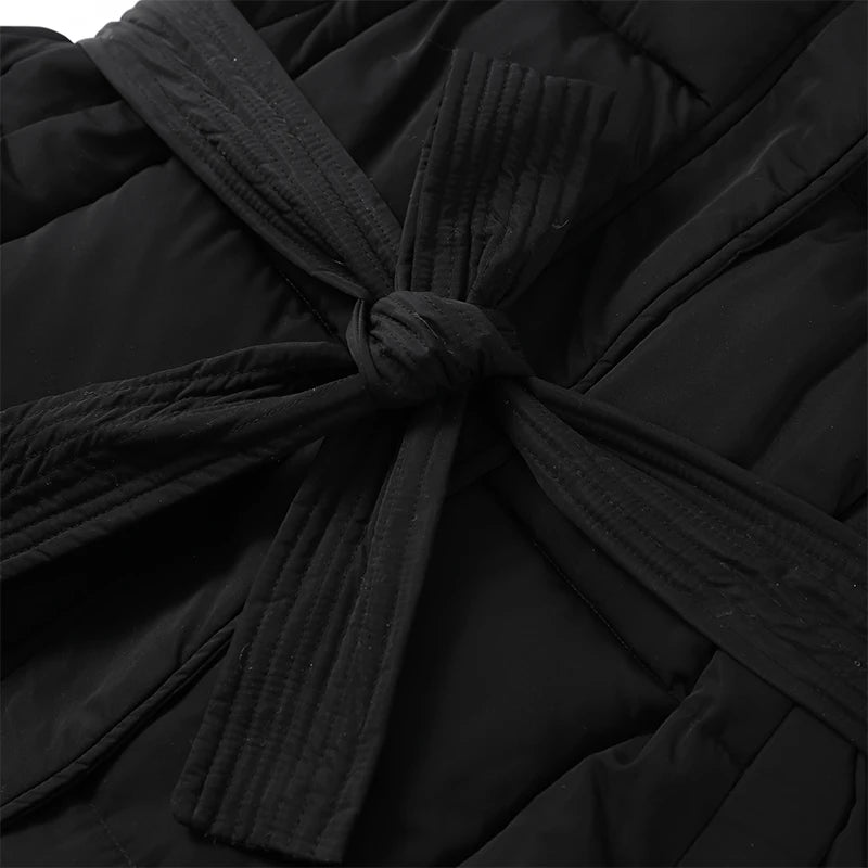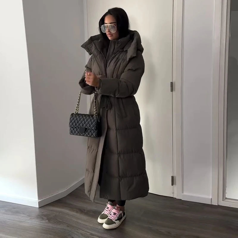 Cappotto lungo in cotone con cappuccio trapuntato imbottito da donna caldo Colletto alla coreana solido allentato Cappotti con cerniera con lacci 2025 Capispalla invernale da donna