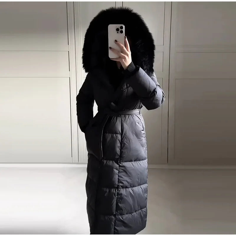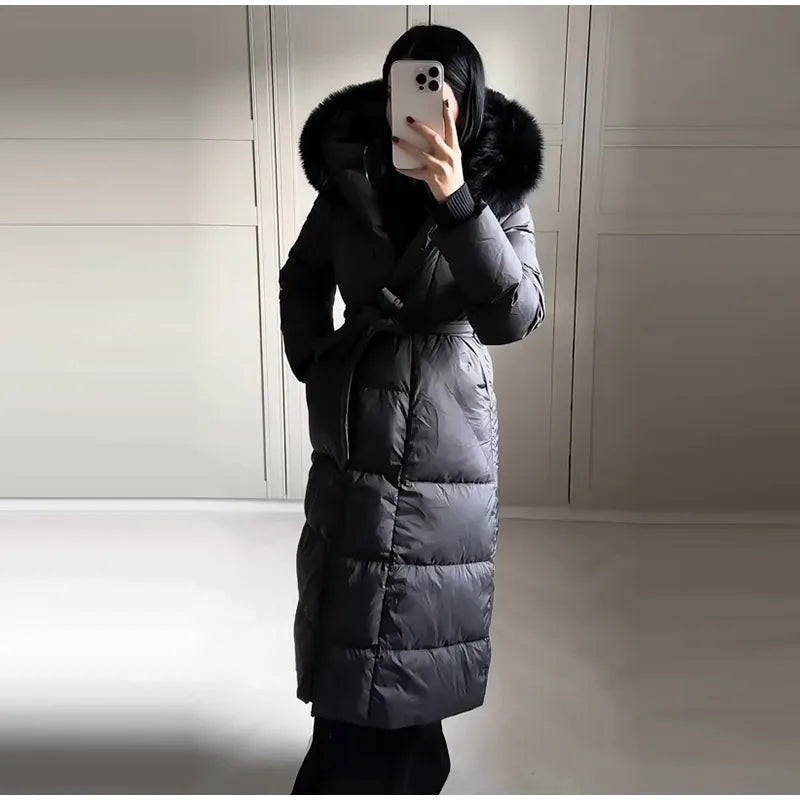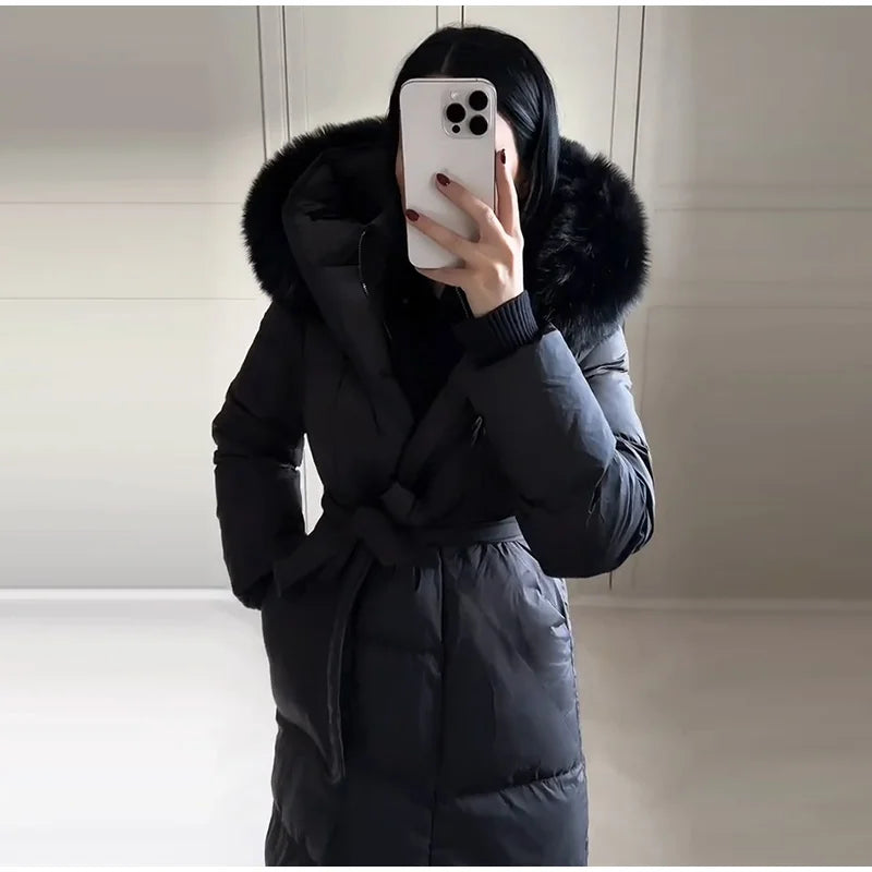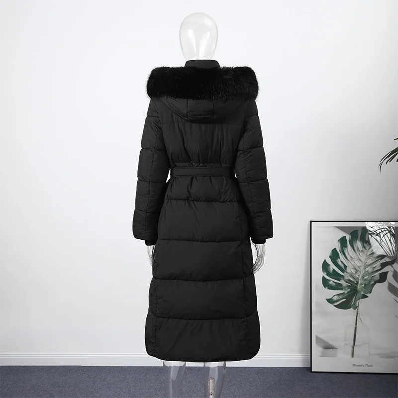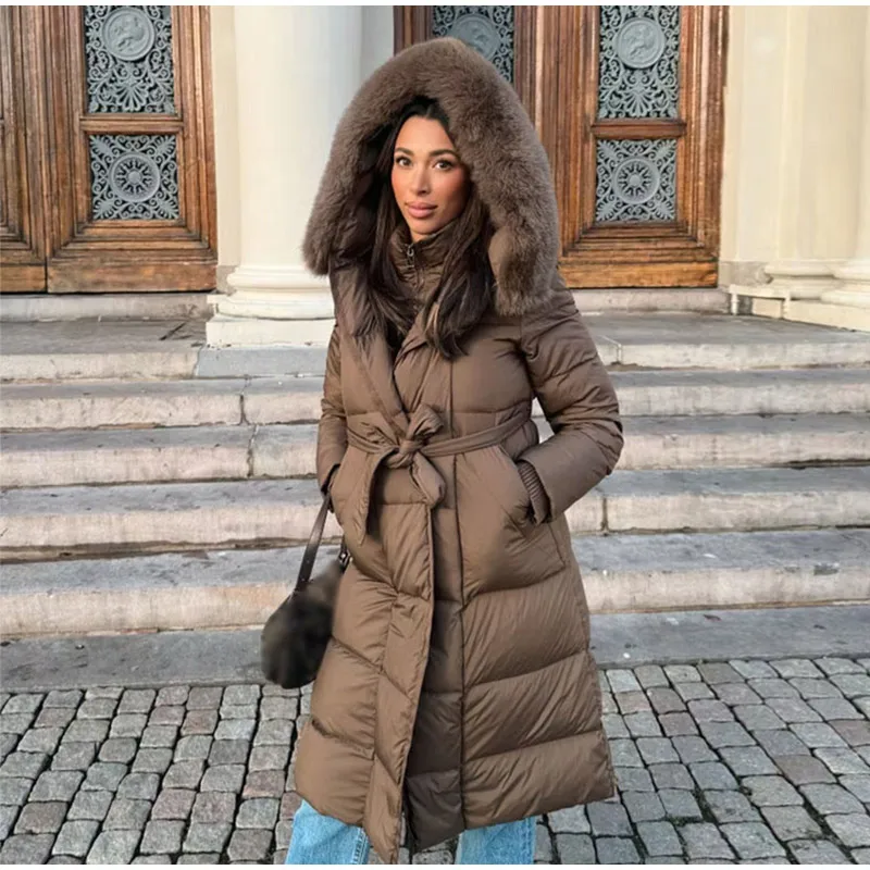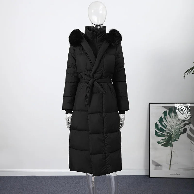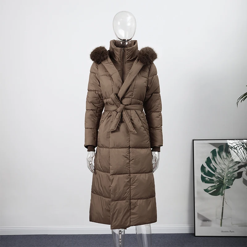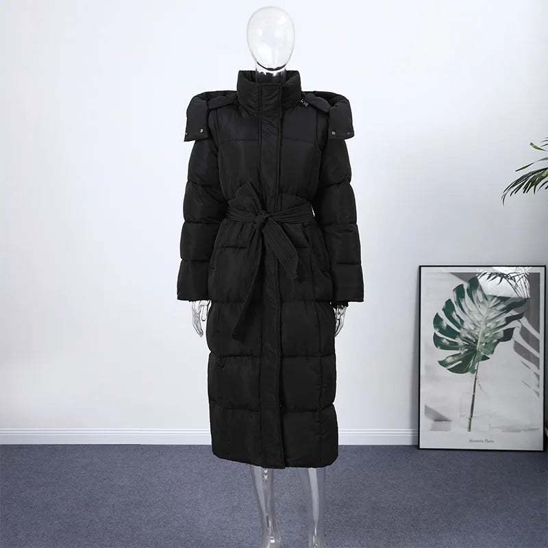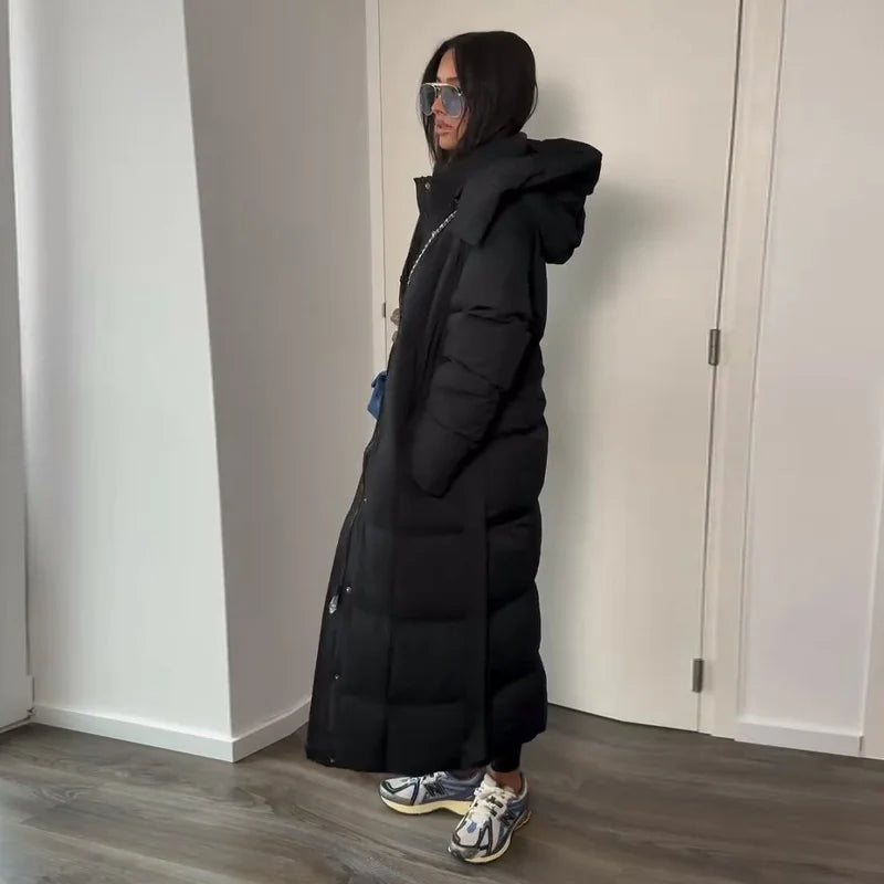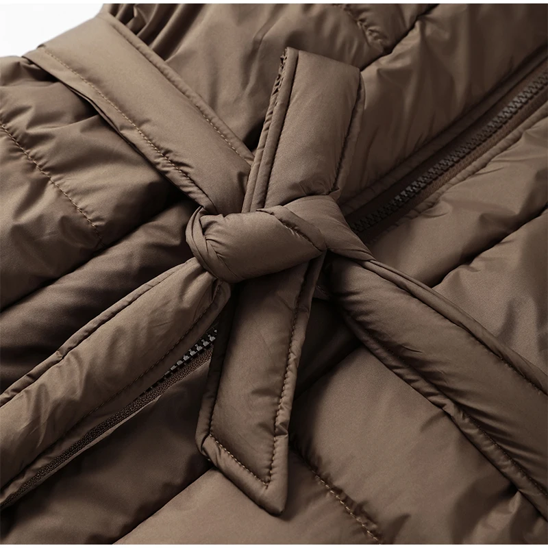 Cappotto lungo in cotone con cappuccio trapuntato imbottito da donna caldo Colletto alla coreana solido allentato Cappotti con cerniera con lacci 2025 Capispalla invernale da donna