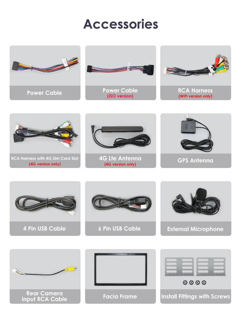 1G RAM 16G ROM NOCarplay & 1G RAM 32G ROM NOCarplay : AD7001with 1*Wire Harness Cable,1*RCA Cable with 4 wires(not supports Video Output),1*CAM-VIN wire,Not includes External Mic,2*USB wire,1*GPS Antenna,1 sets Metal Bracket,1*Front plastic frame.