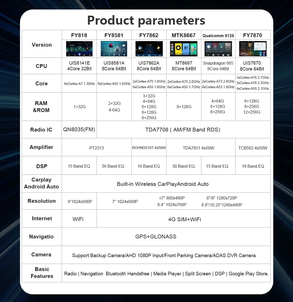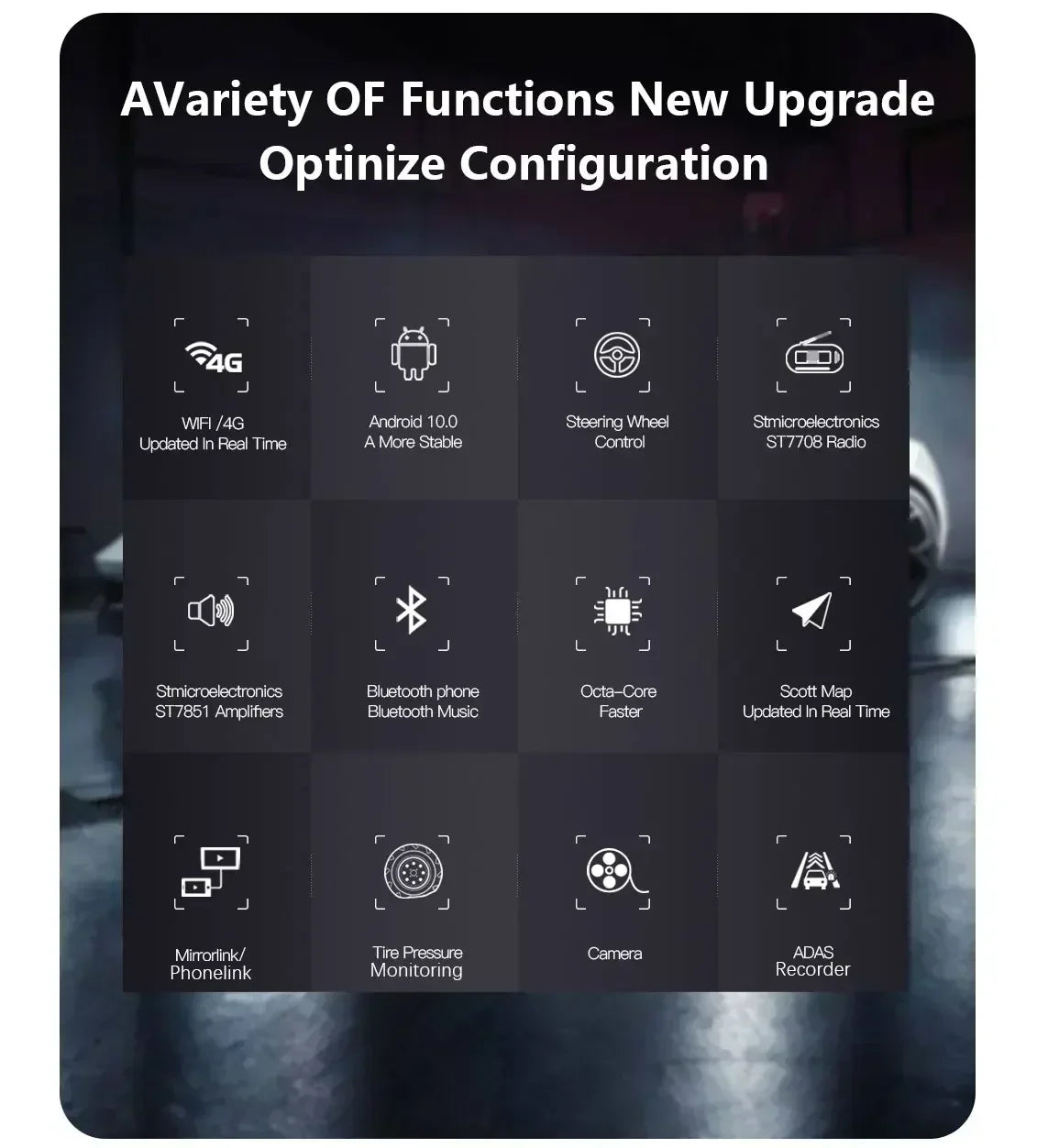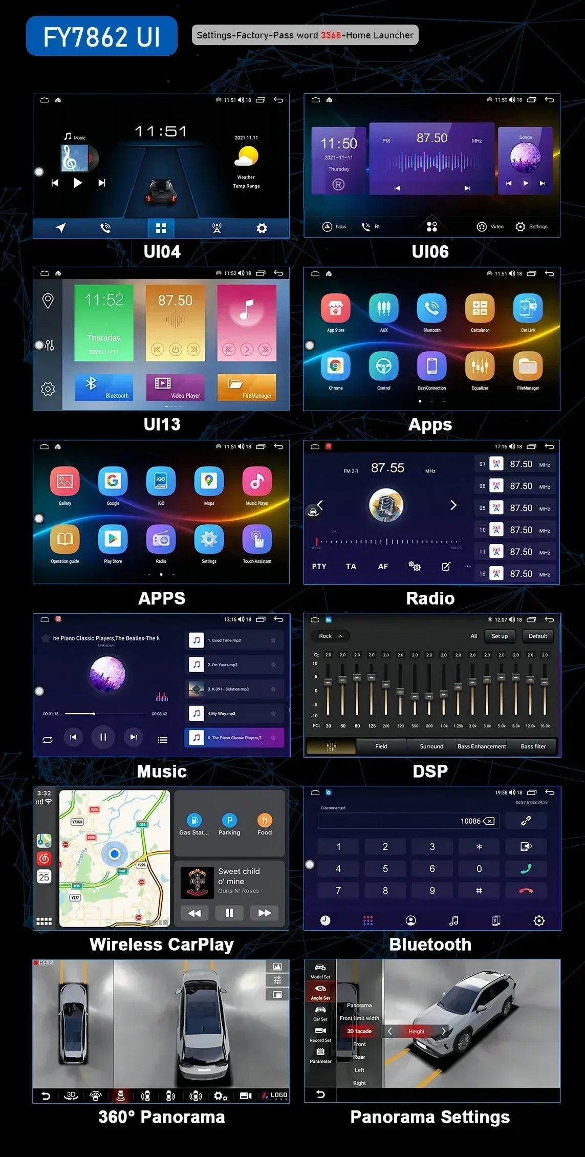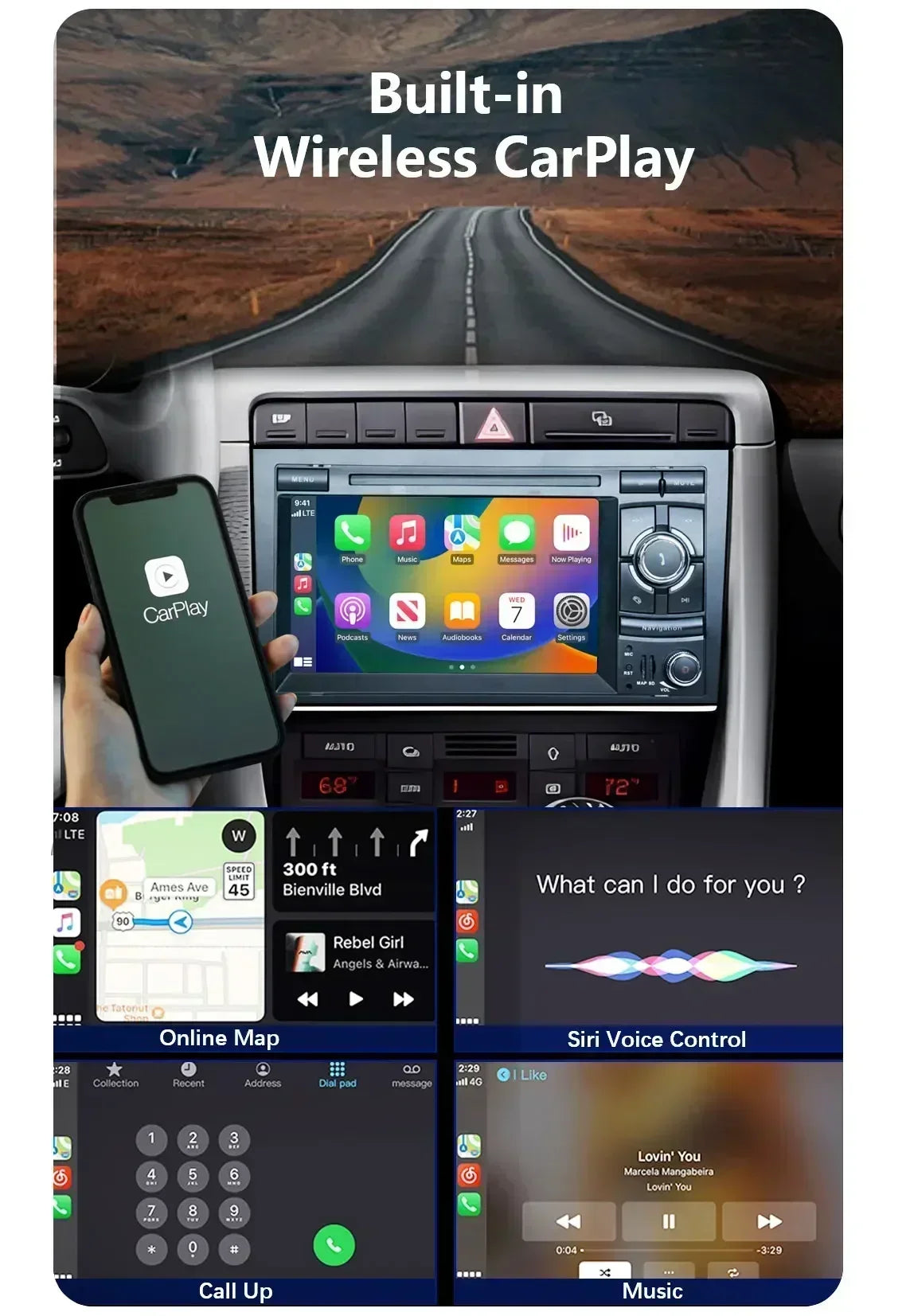 Special Features: wifi function,Support 4G Network,Support Can-Bus,Built-in GPS,Charger,Mobile Phone,MP3 players,dsp,CarPlay,android auto,Reversing Input,Split Screen