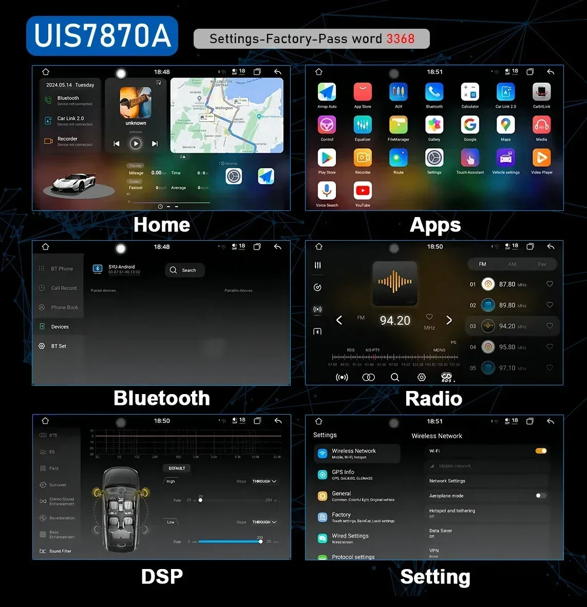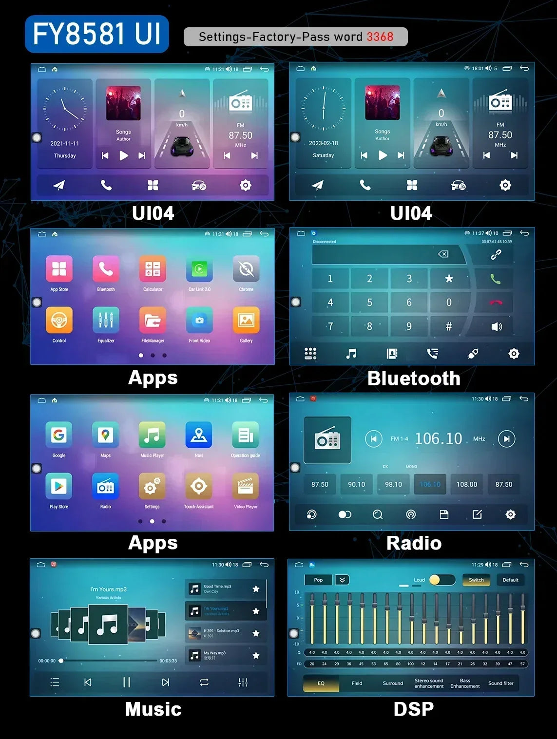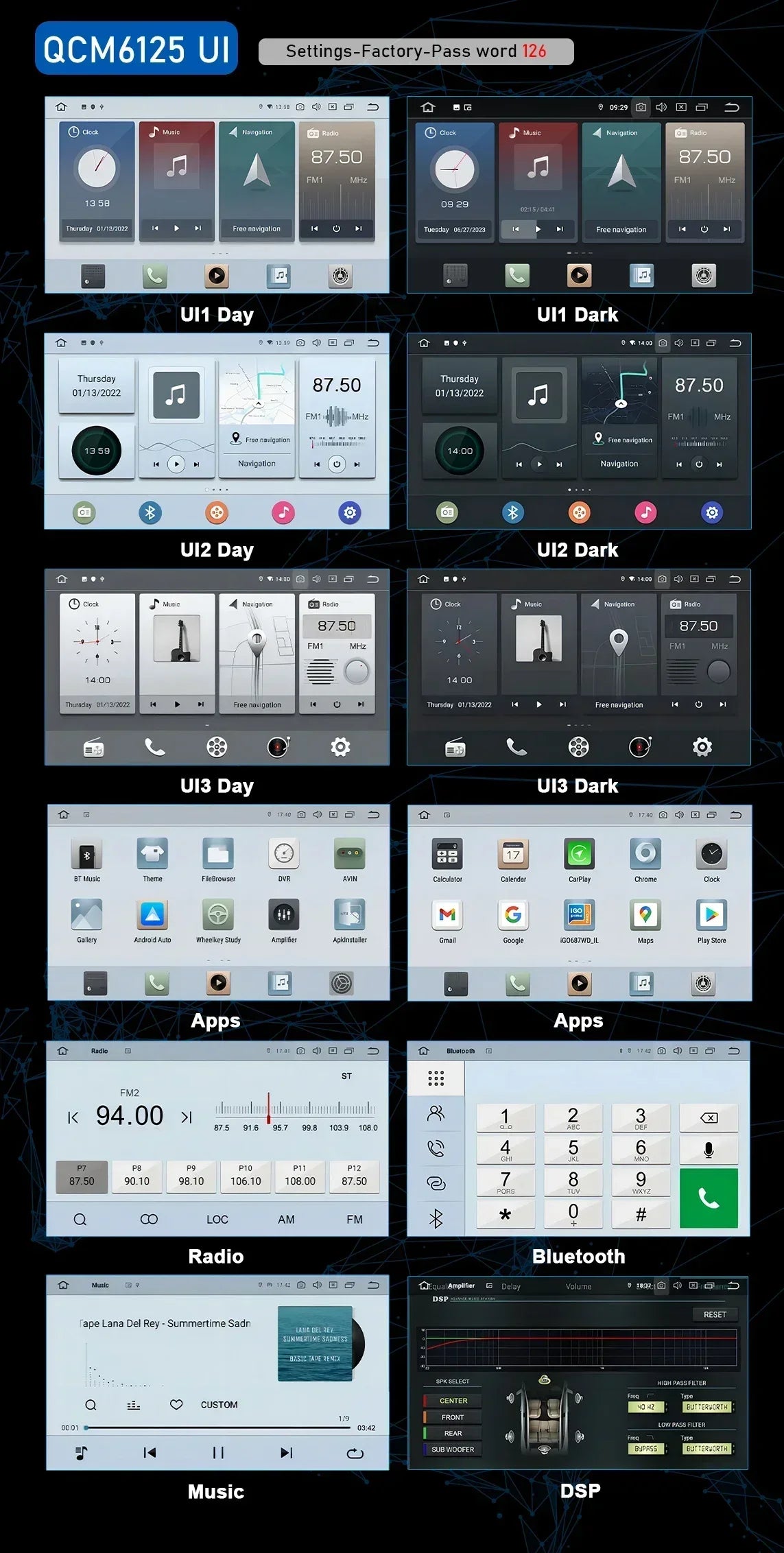 SPECIFICATIONSAmplifier Chip: TDA7850Bluetooth: Bluetooth 5.0Brand Name: CHSTEKBuilt-in CD player: NoBuilt-in DVD Player: NoBuilt-in Screen: YesCPU: Qualcomm 8 Core QCM6125 PX5... Per saperne di più