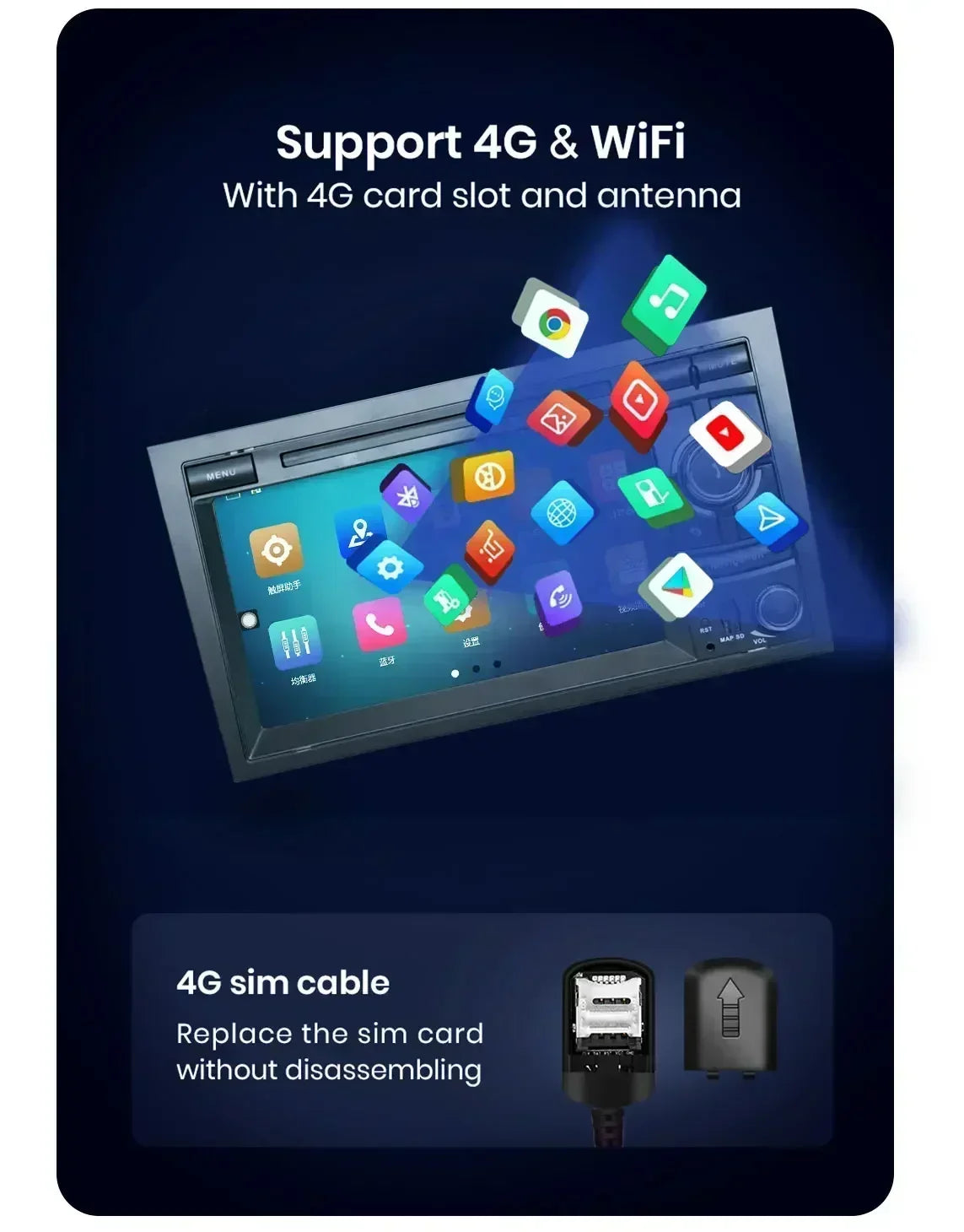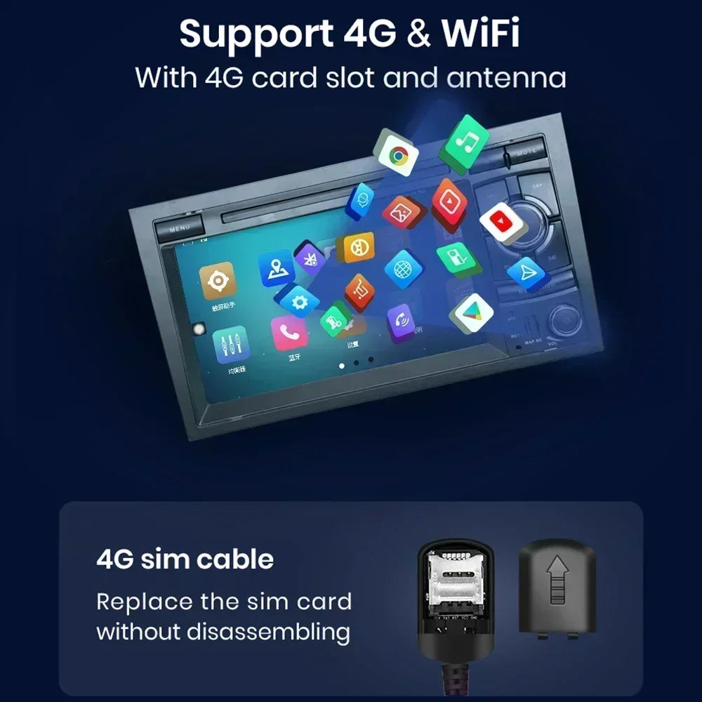 Built-in WiFi,Support 4G SIM Card Read,Support to connect to any network hotspot via WiFi or 4G, you can use the online navigation, online video online music, you can use google play store to download any APP you need.