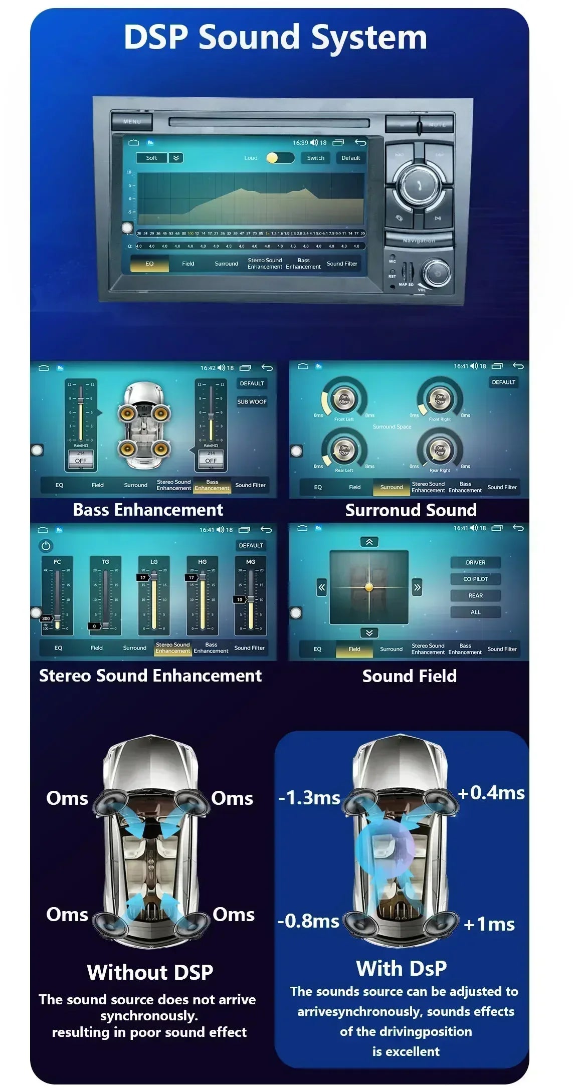 Without changing the position of the 4 speakers of the car, by adjusting thespeed of the sound from the 4 speakers