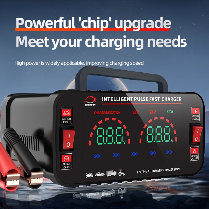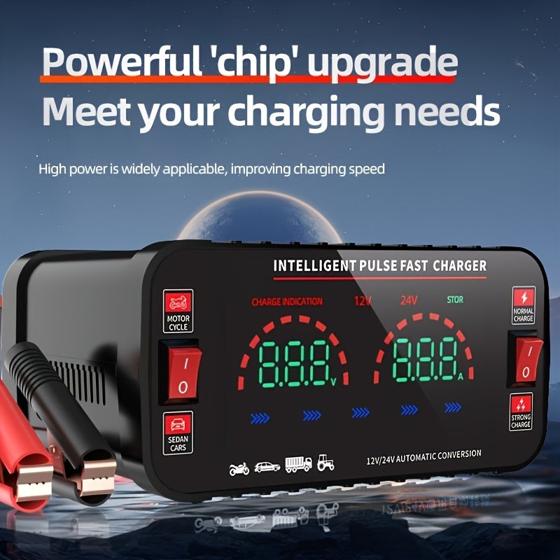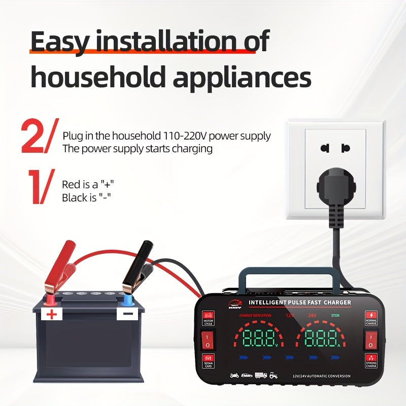 Caricatore per auto ad alta potenza da 12V/24V per la ricarica della batteria dell'auto, con funzione di manutenzione, identificazione automatica intelligente 110/220V e riparazione a impulsi