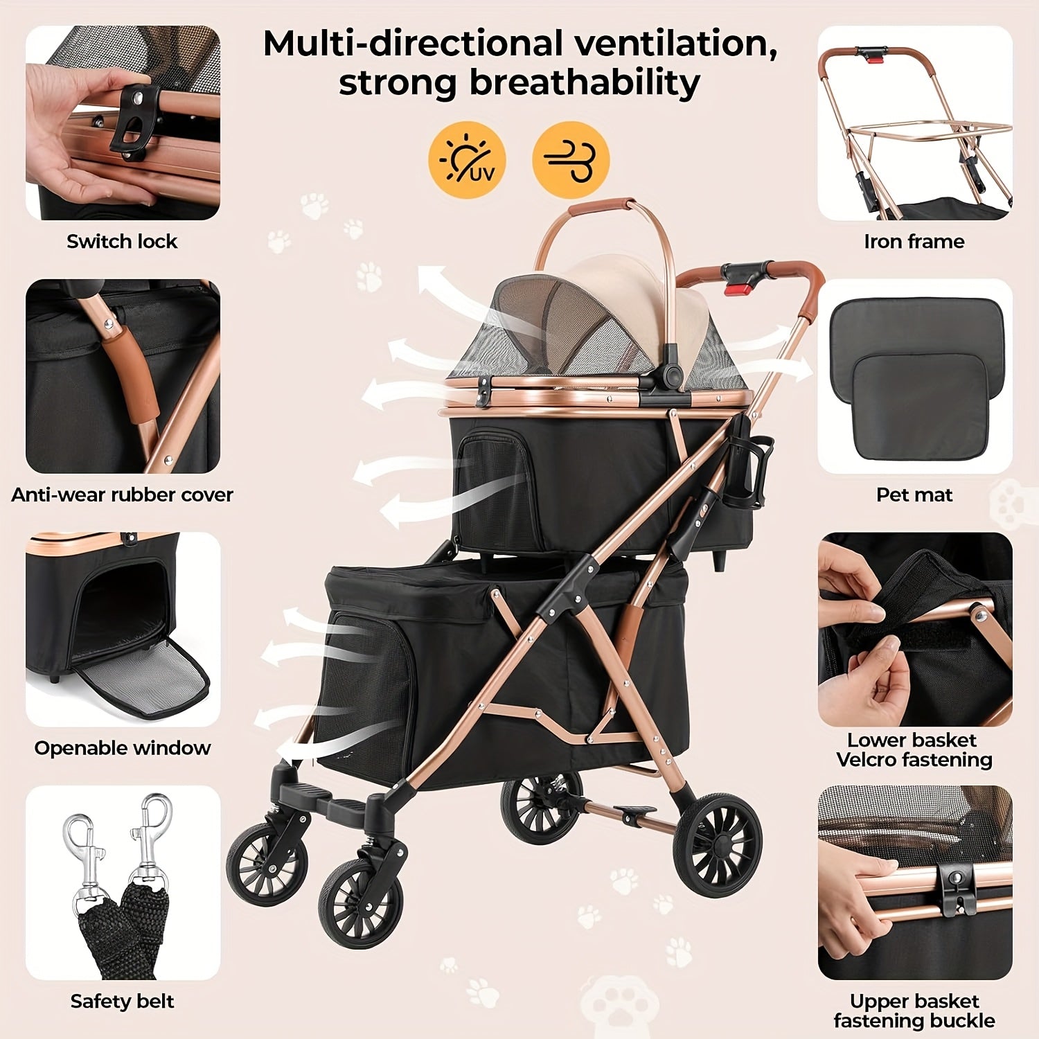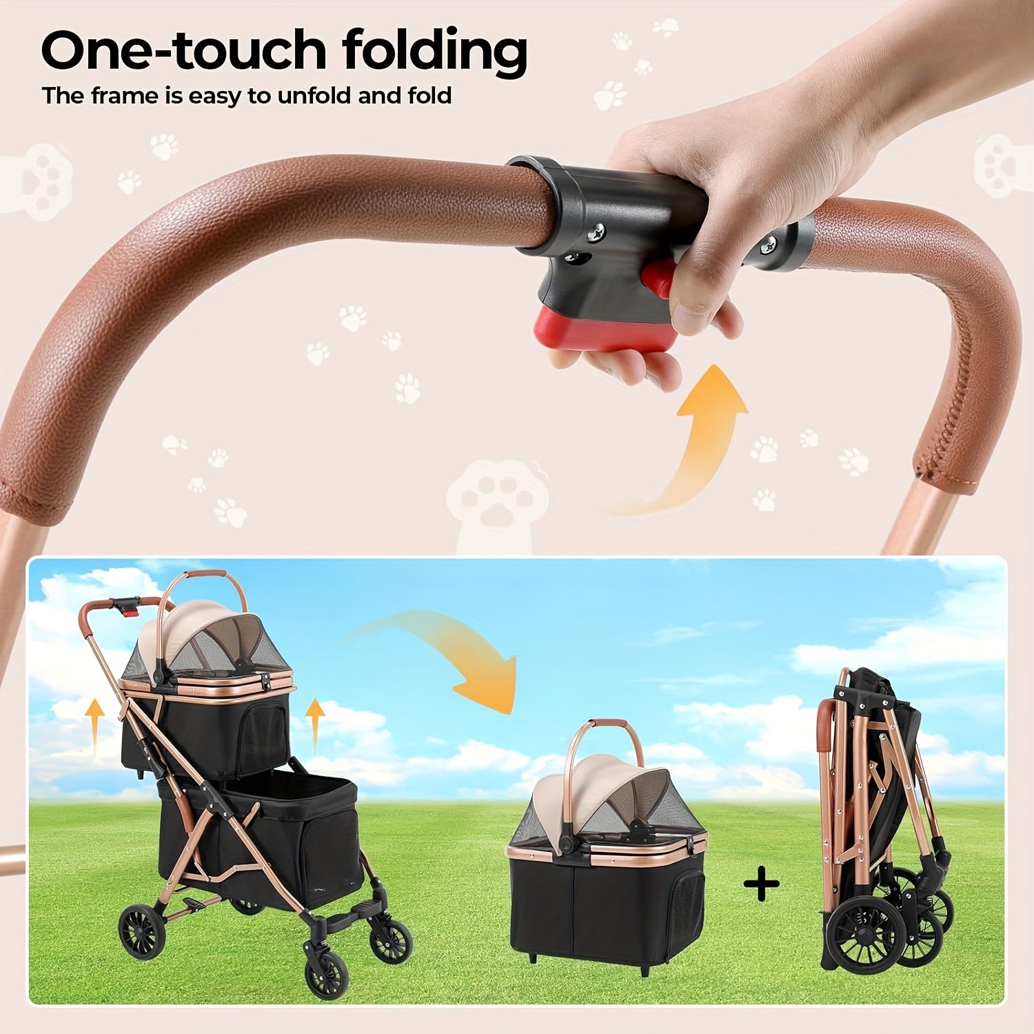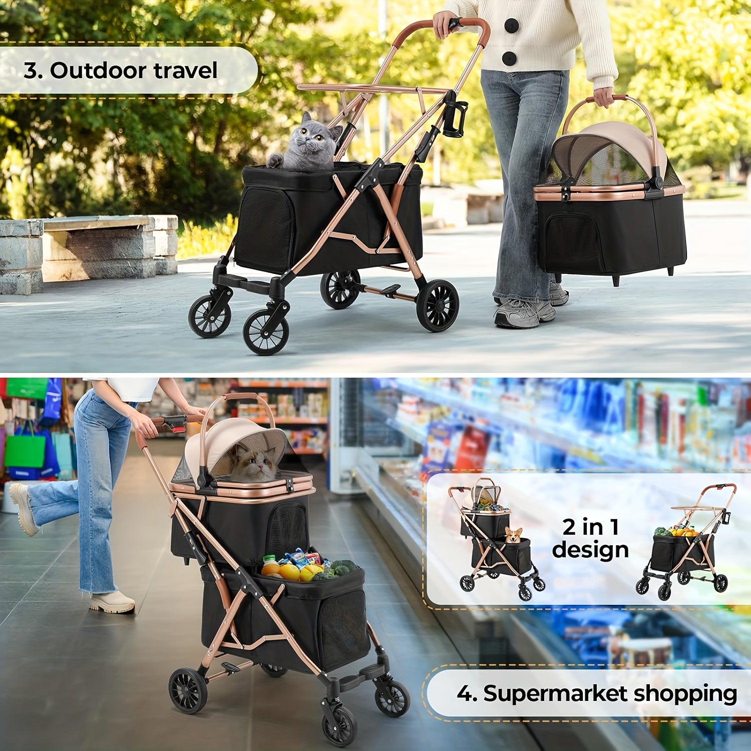 Carrello per animali domestici pieghevole con due cestelli e carrello utilità, crollo con 1 pulsante, ruote girevoli a 360°, freno a pedale, capacità 25 kg, finestre in rete traspirante, trasportatore per cani e animali domestici, carrello per il trasport