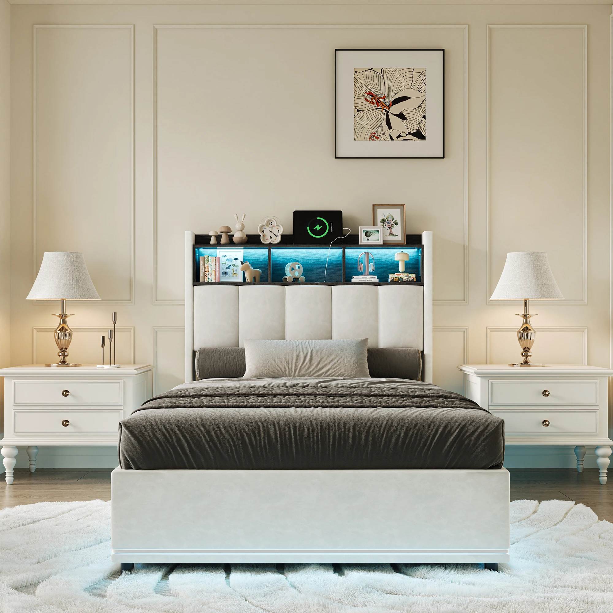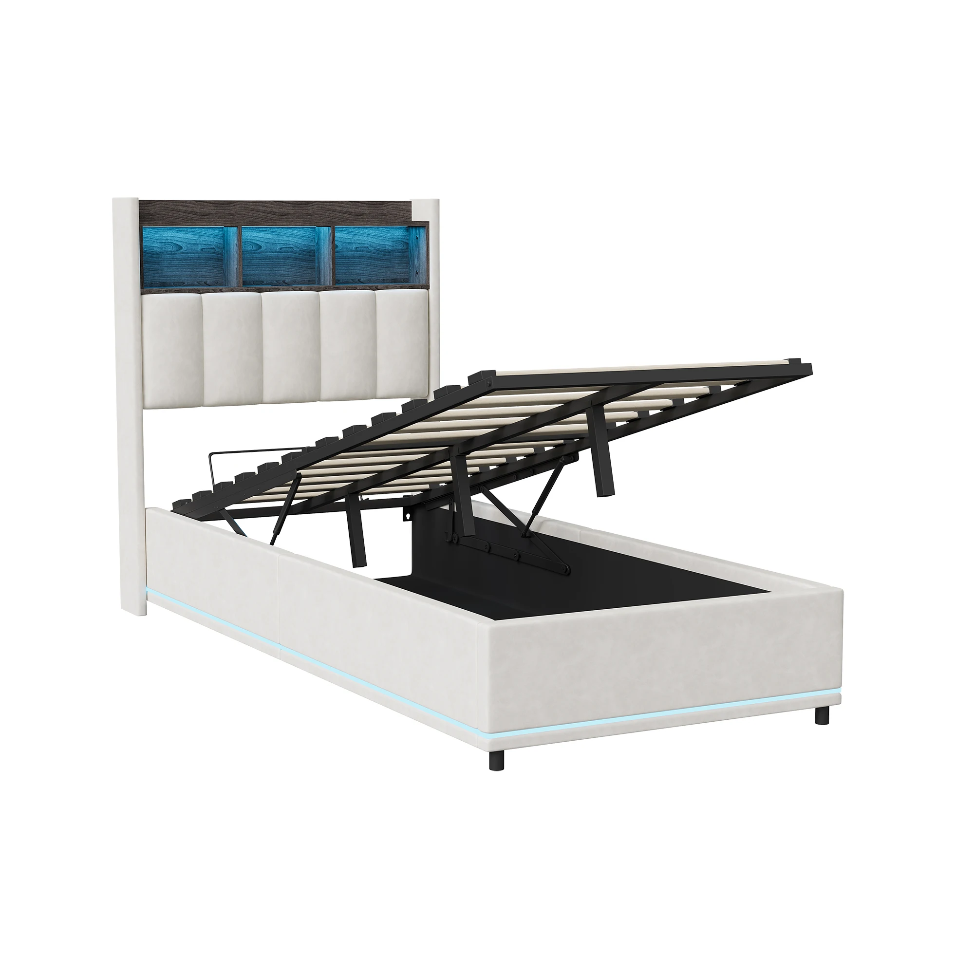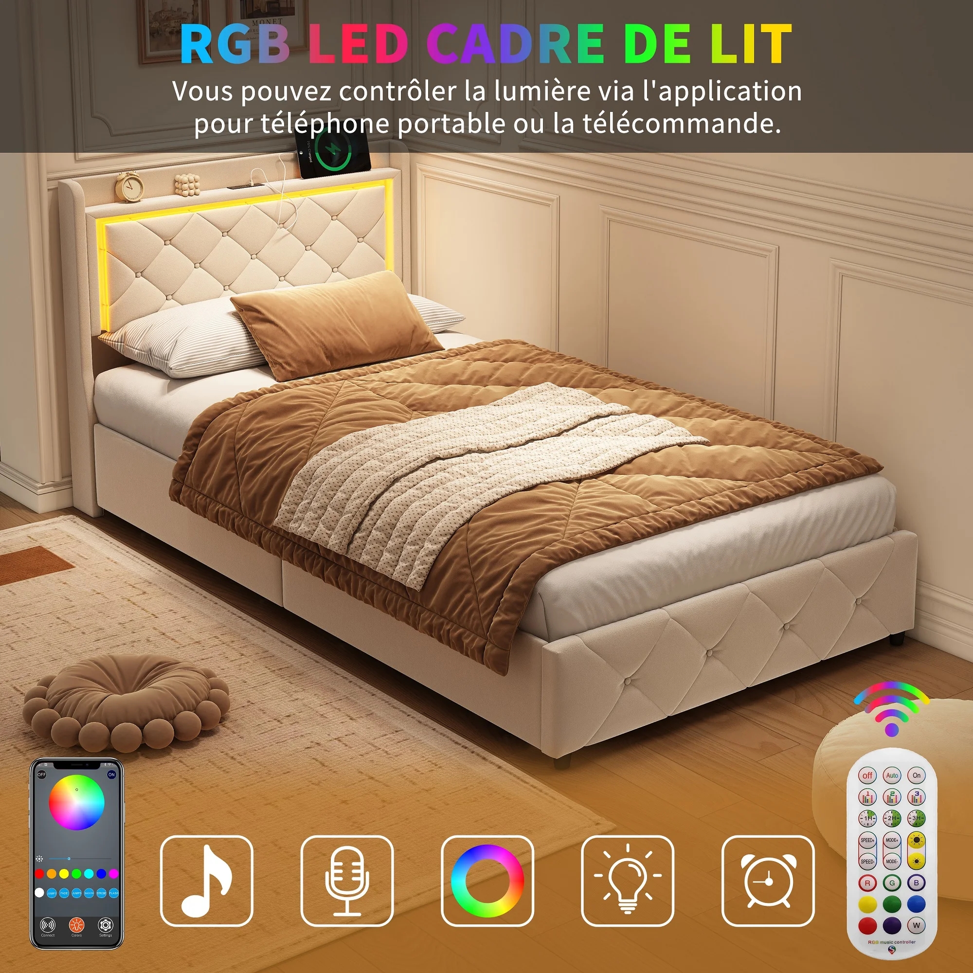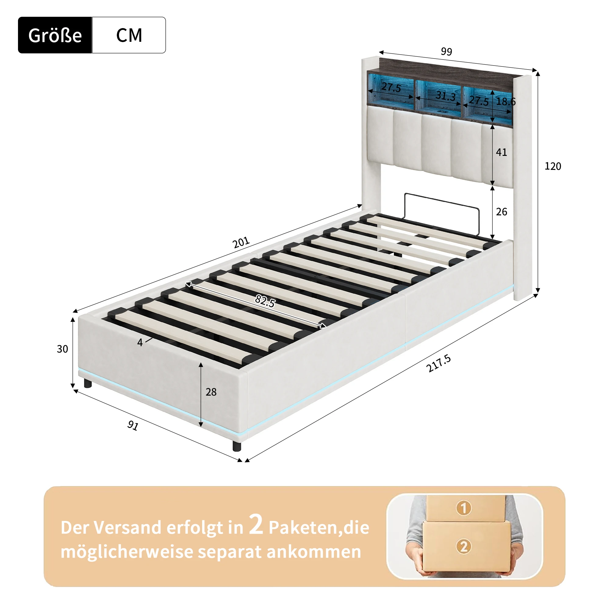 Comanlai Letto per bambini a LED 90x200 cm, letto singolo, letto contenitore idraulico, struttura letto imbottita con vani portaoggetti, letto per ragazzi