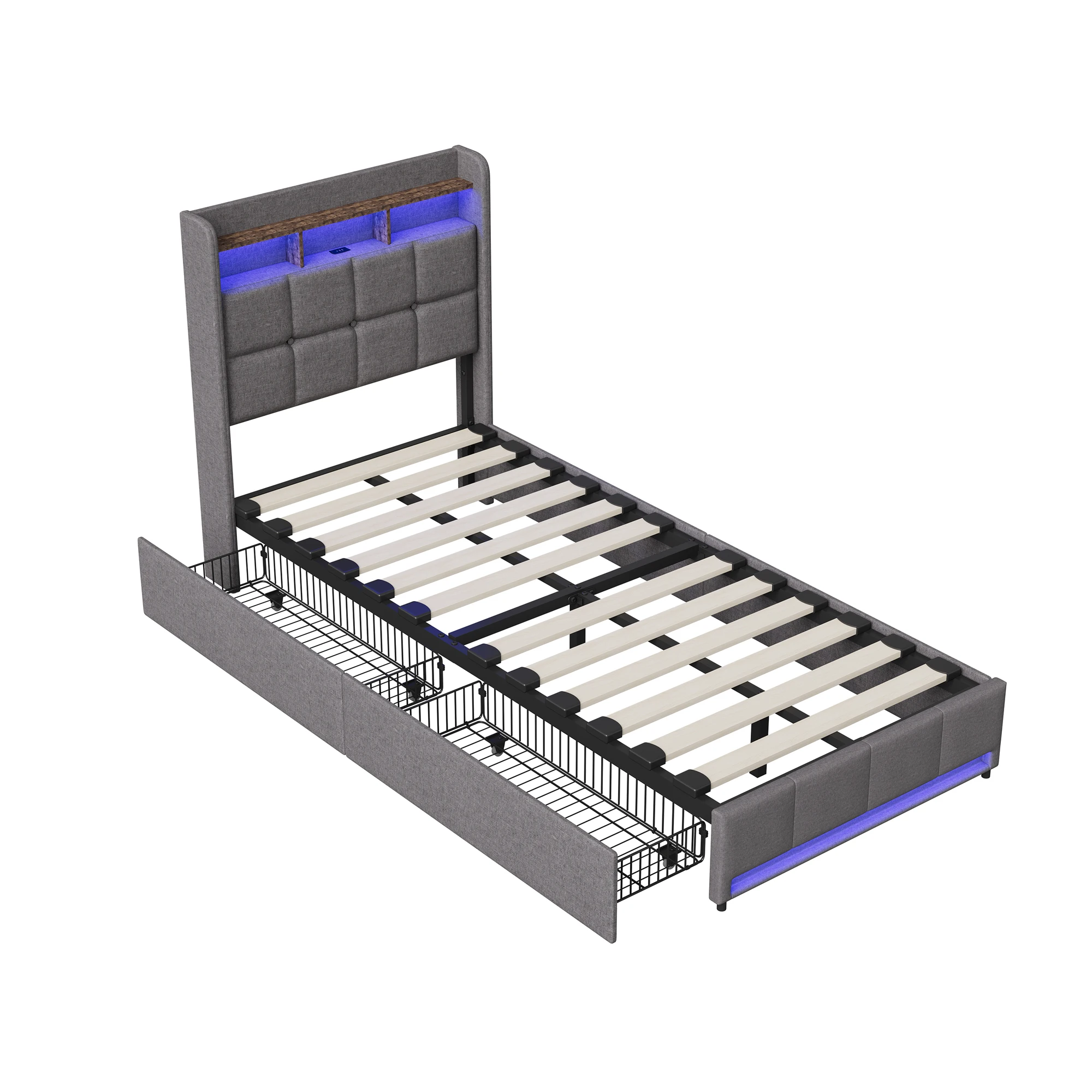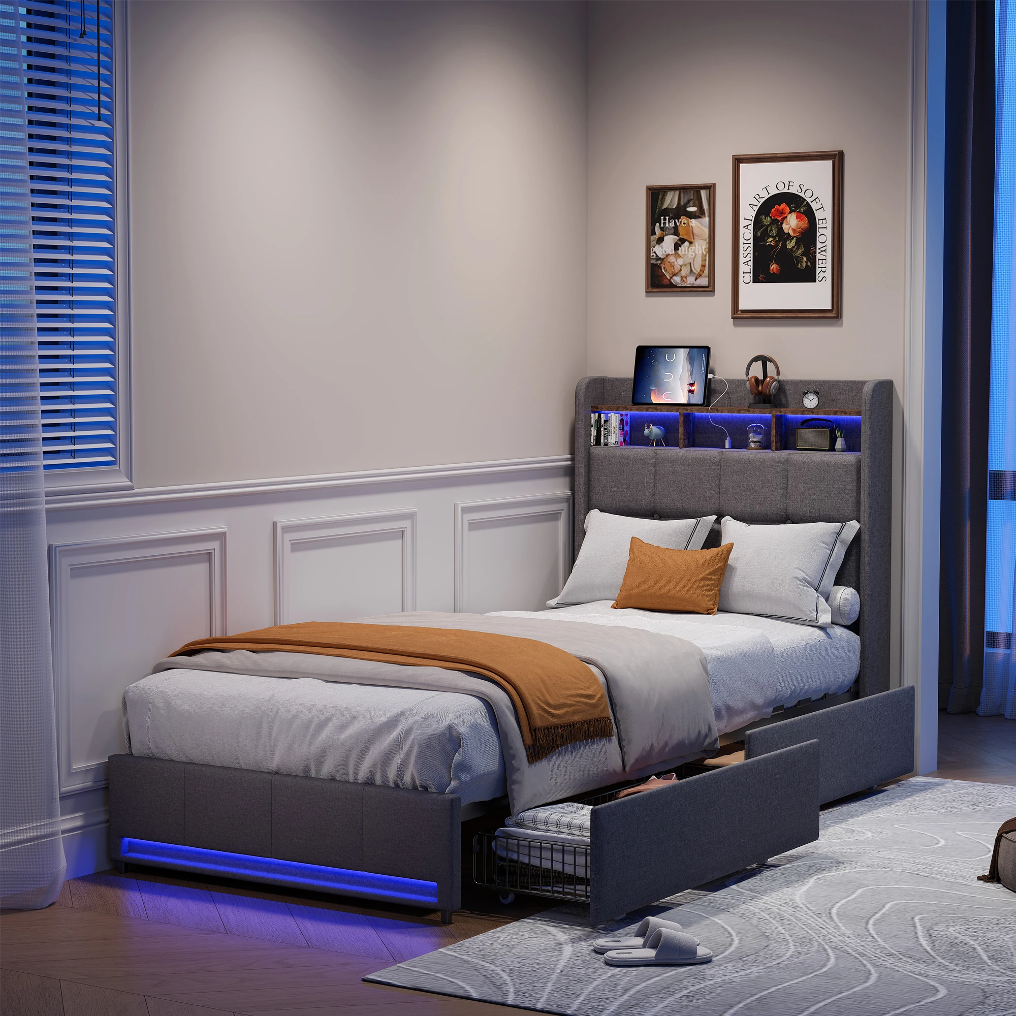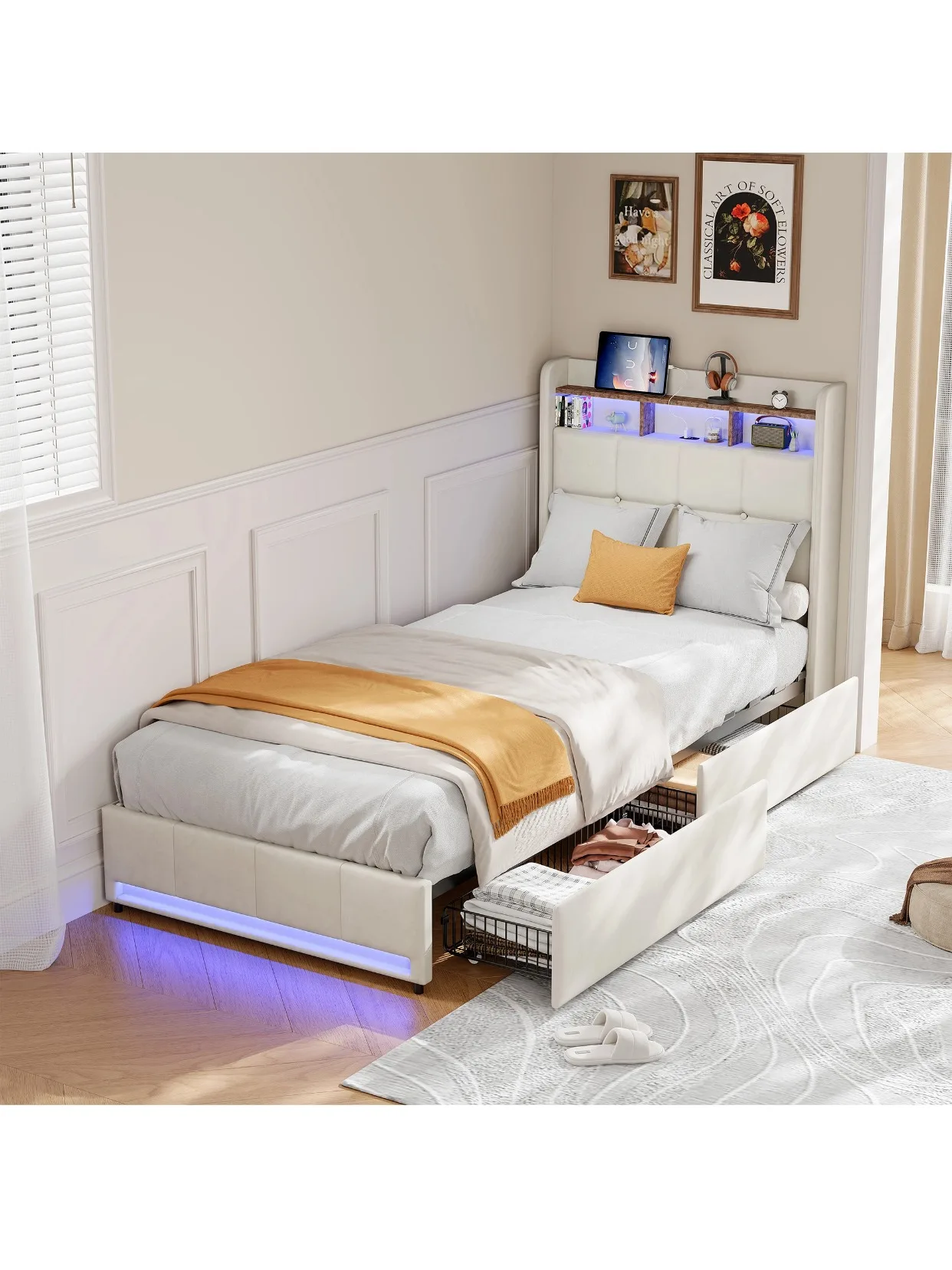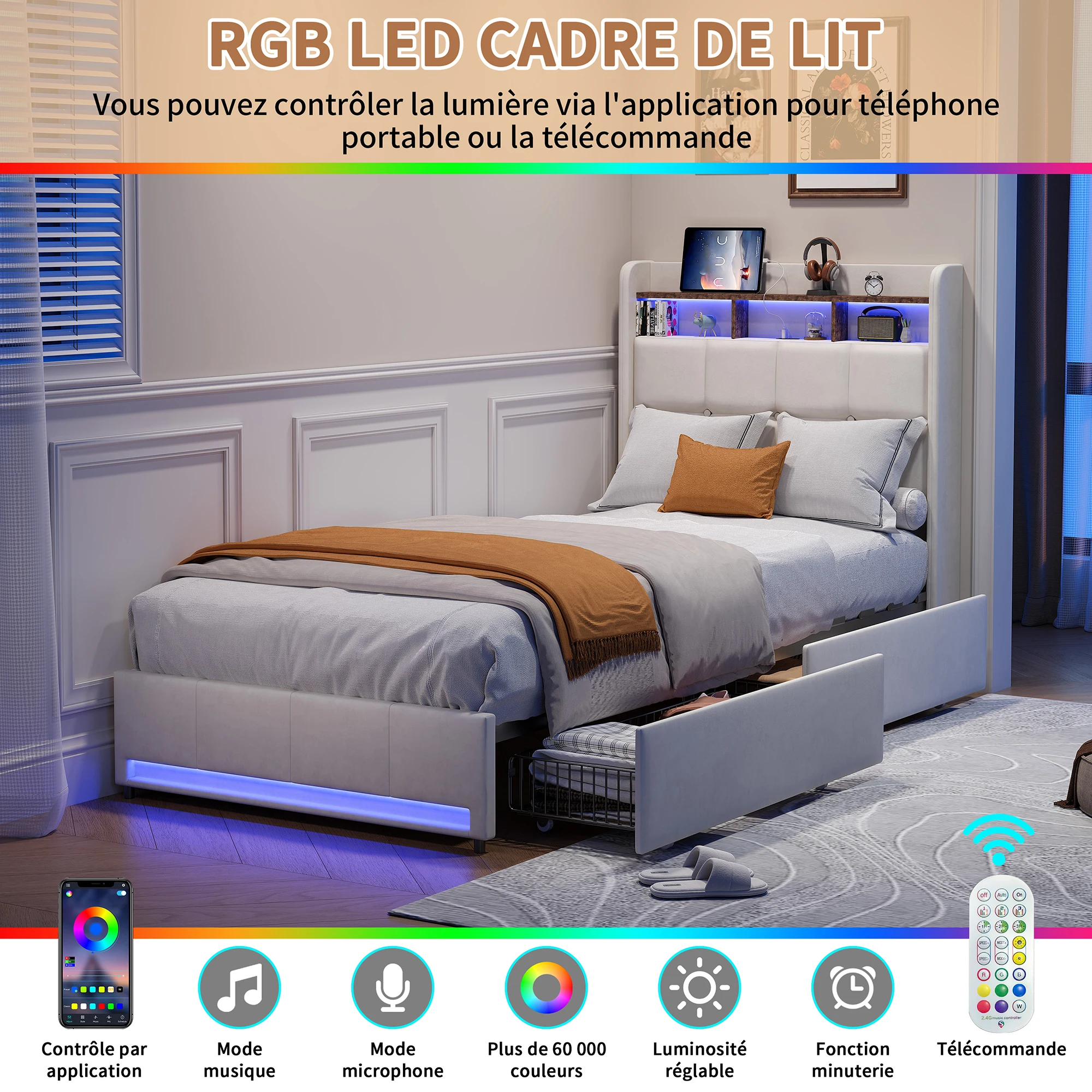 Comanlai Letto singolo a LED 90x200 cm, letto per bambini con 2 cassetti, struttura letto imbottita con vani portaoggetti nella testiera