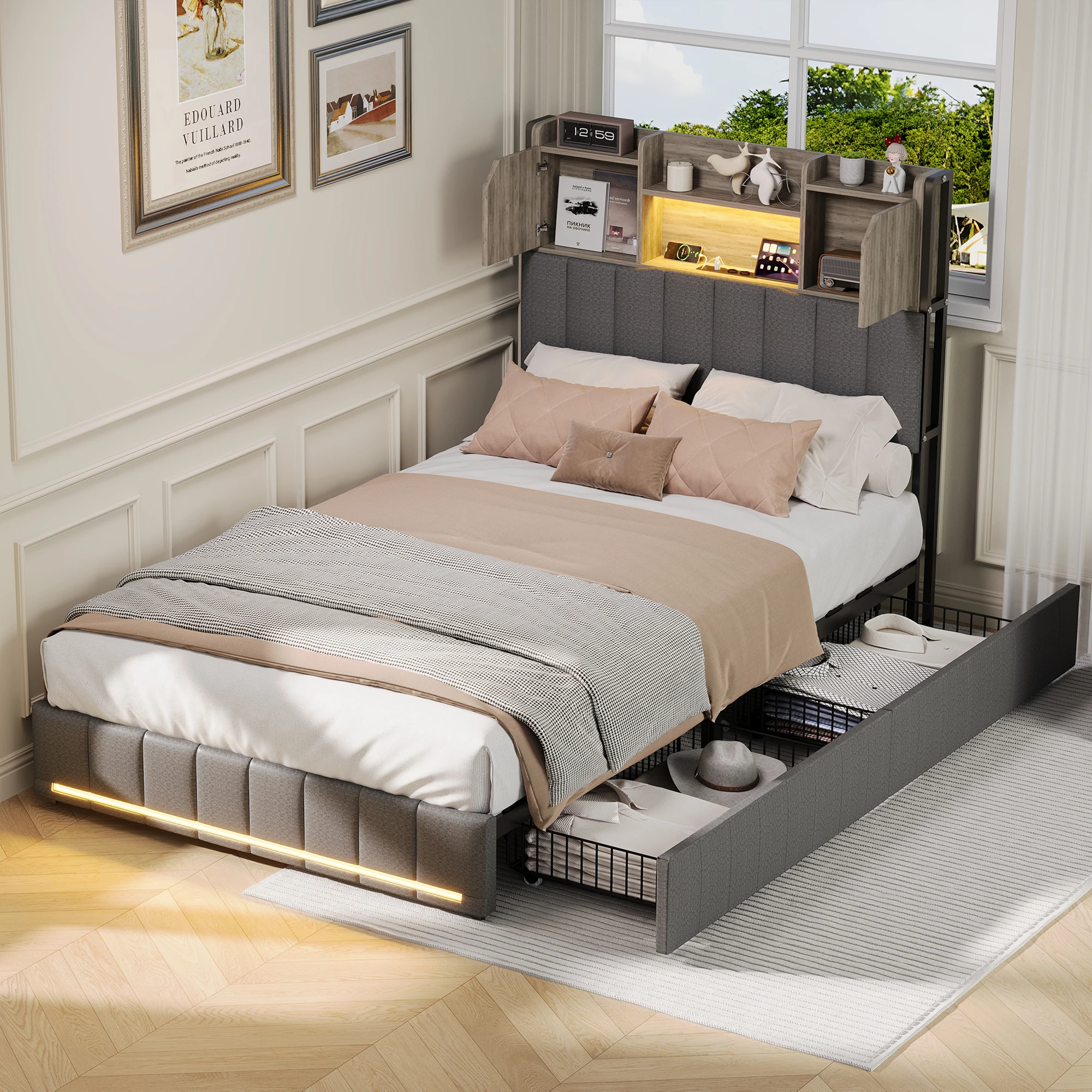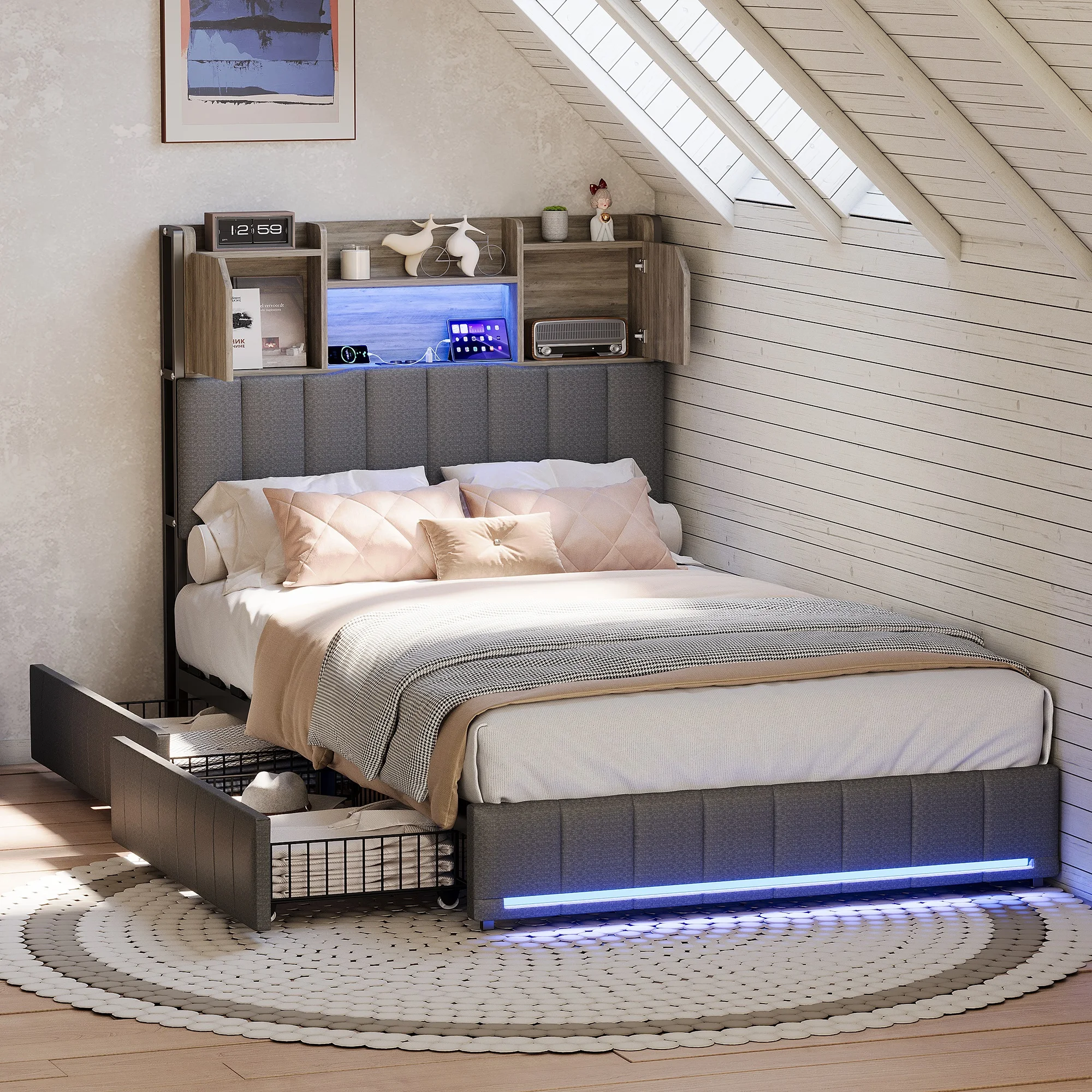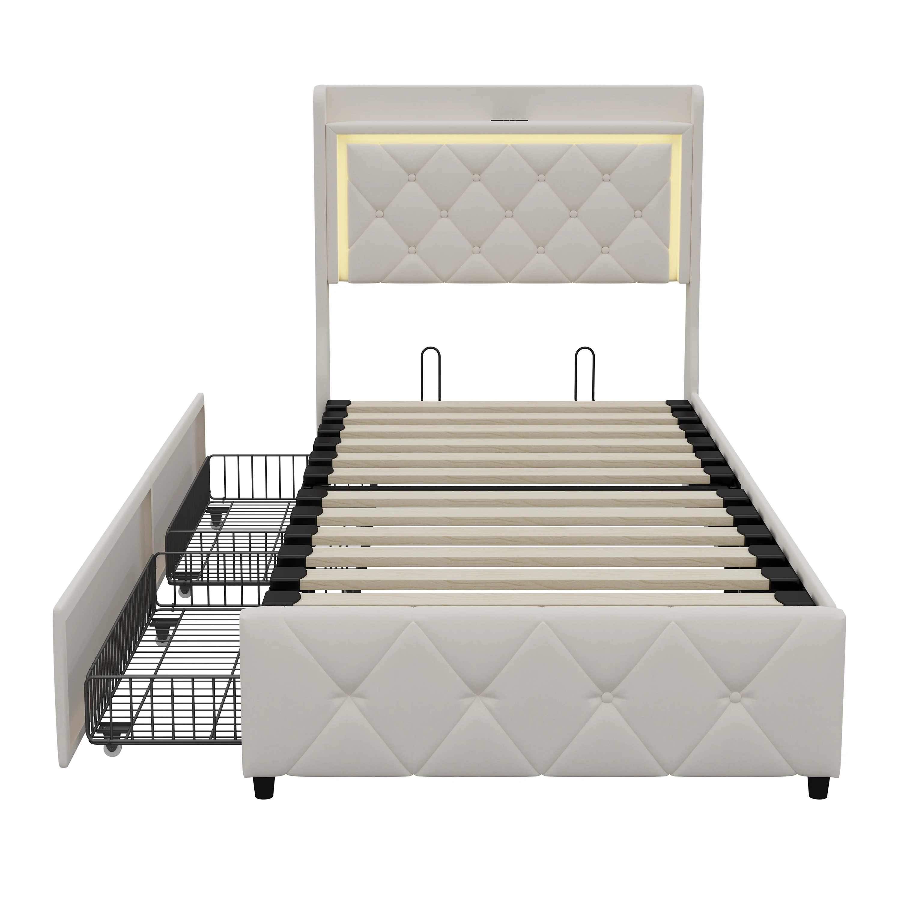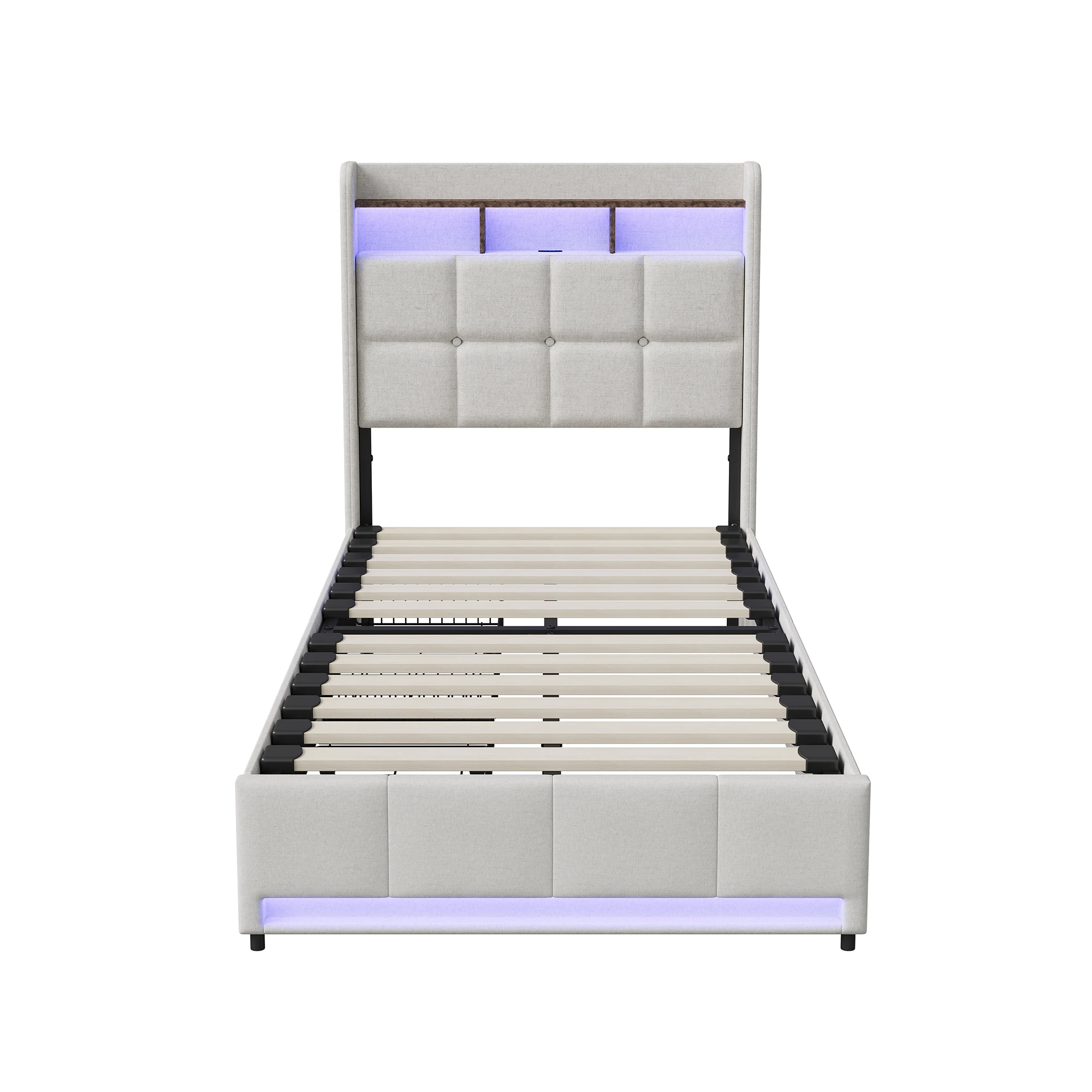 Comanlai Letto singolo a LED 90x200 cm, letto per bambini con 2 cassetti, struttura letto imbottita con vani portaoggetti nella testiera