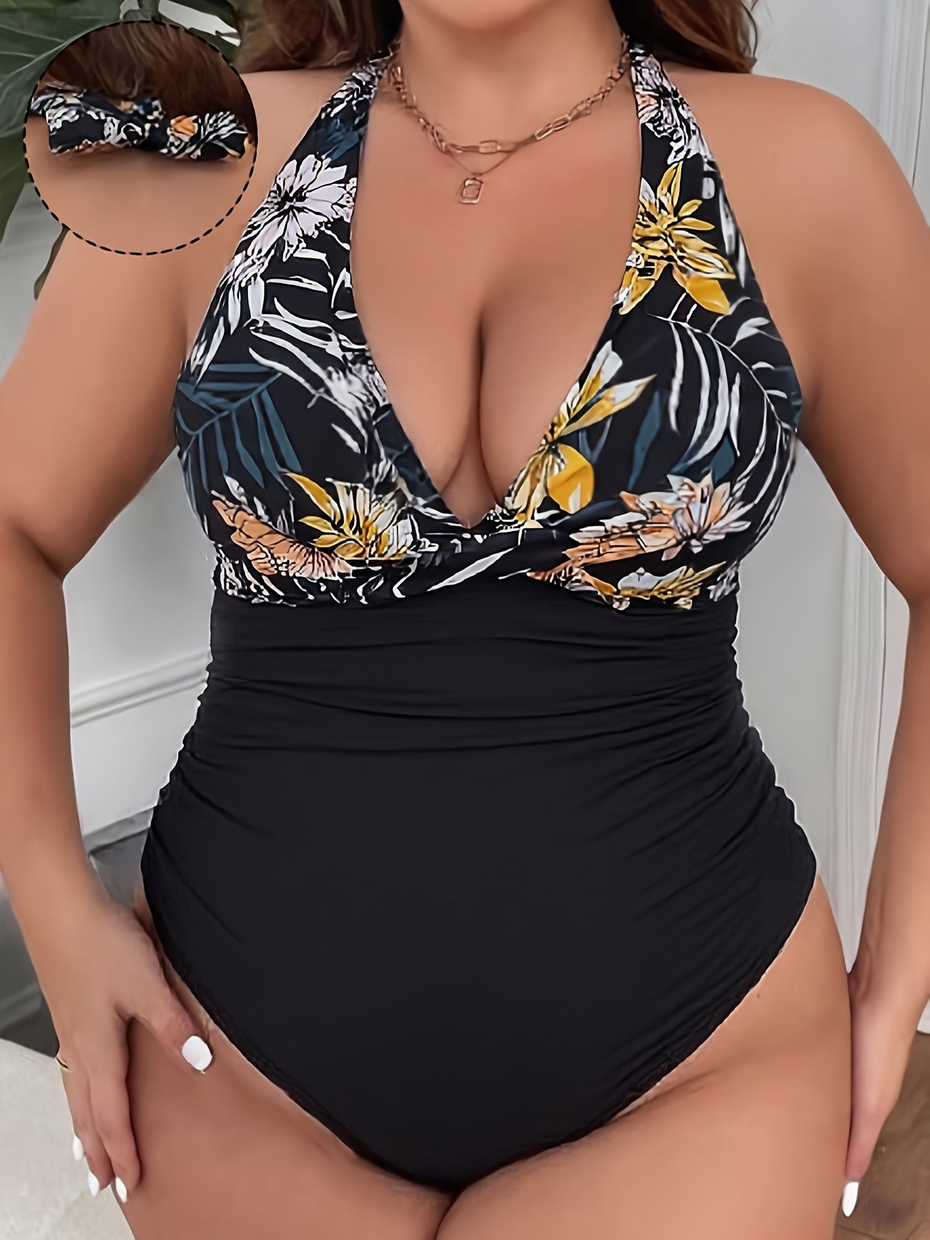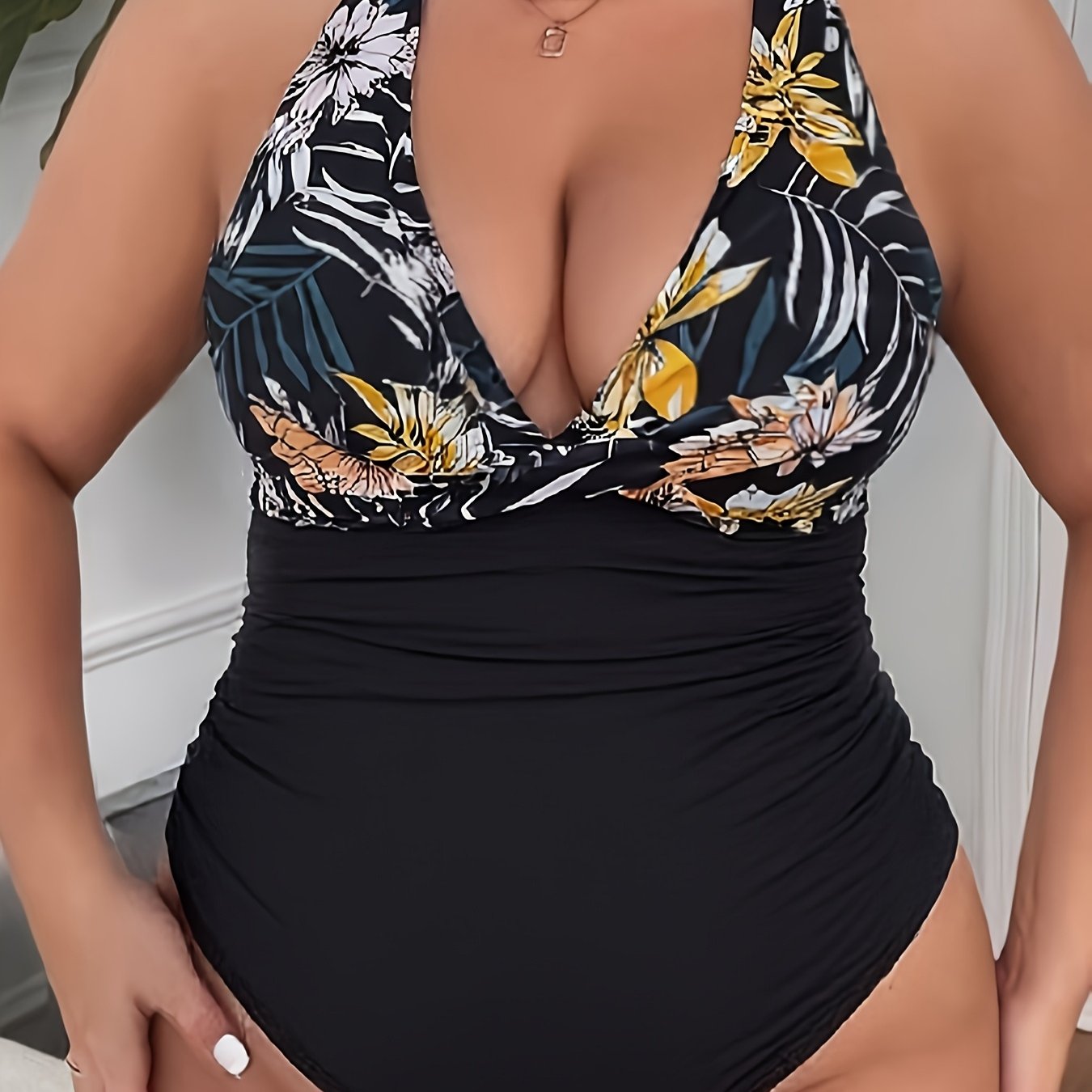 Costume da bagno floreale Plus Size - Sexy V-Neck con imbottitura rimovibile, poliestere ad alta elasticità, ideale per spiaggia e piscina, costume da bagno da spiaggia | Costume da bagno floreale | Tessuto elasticizzato