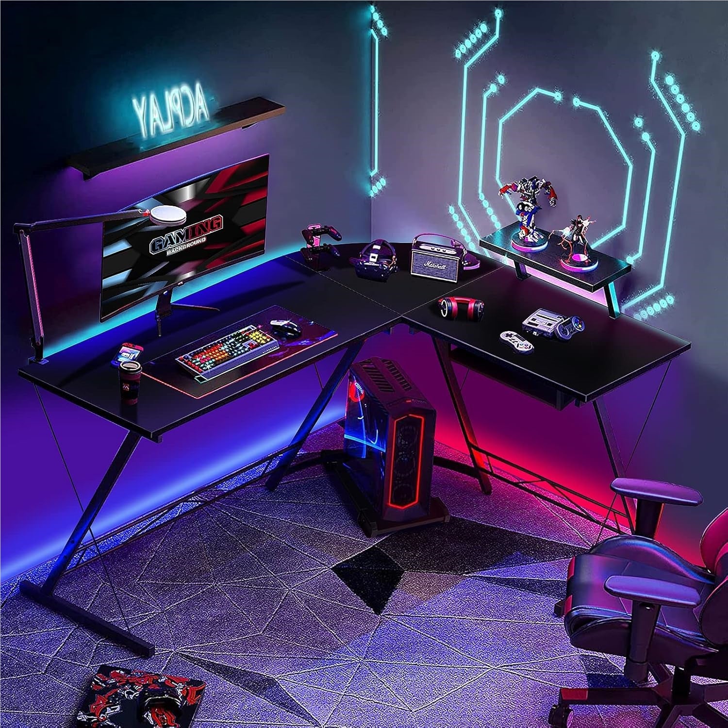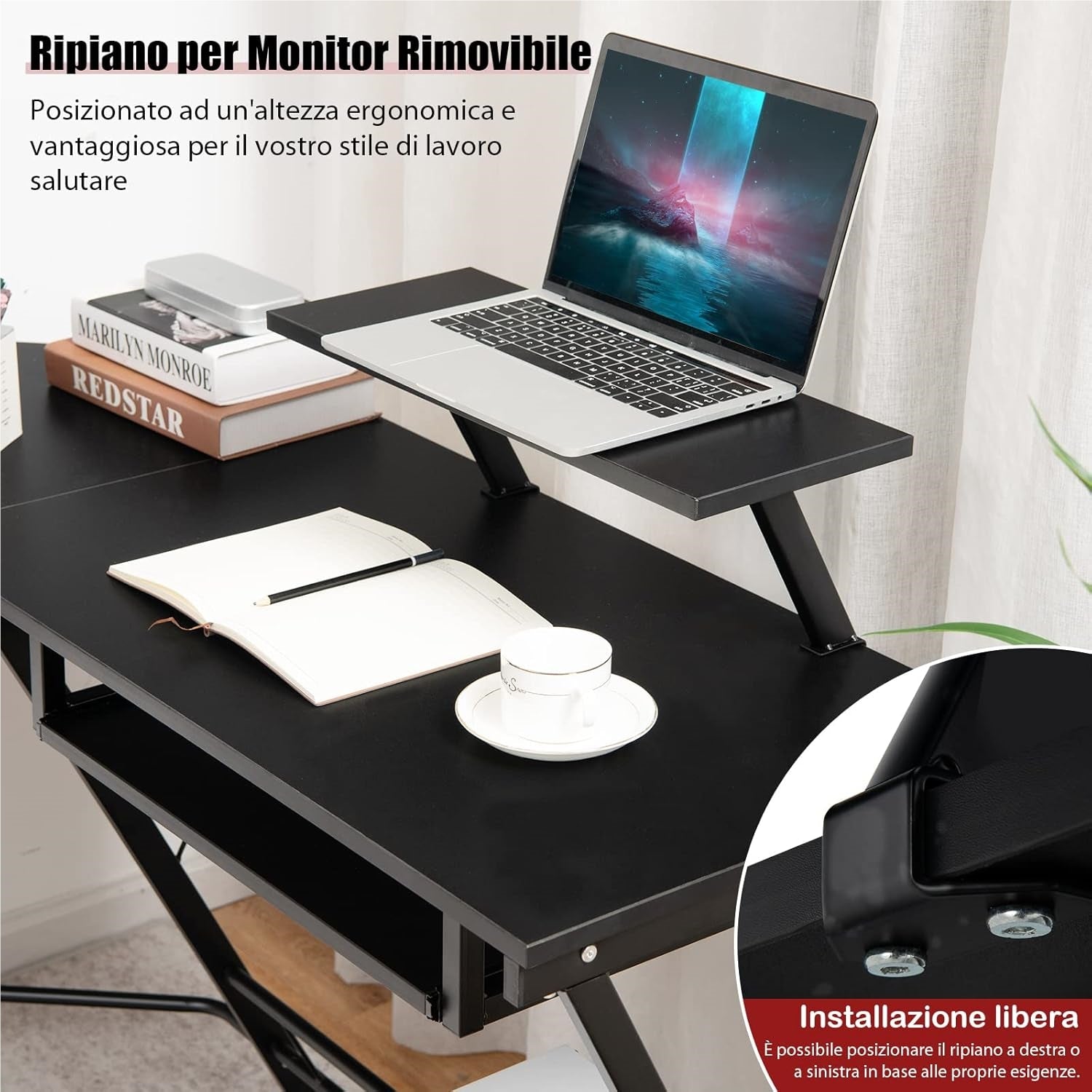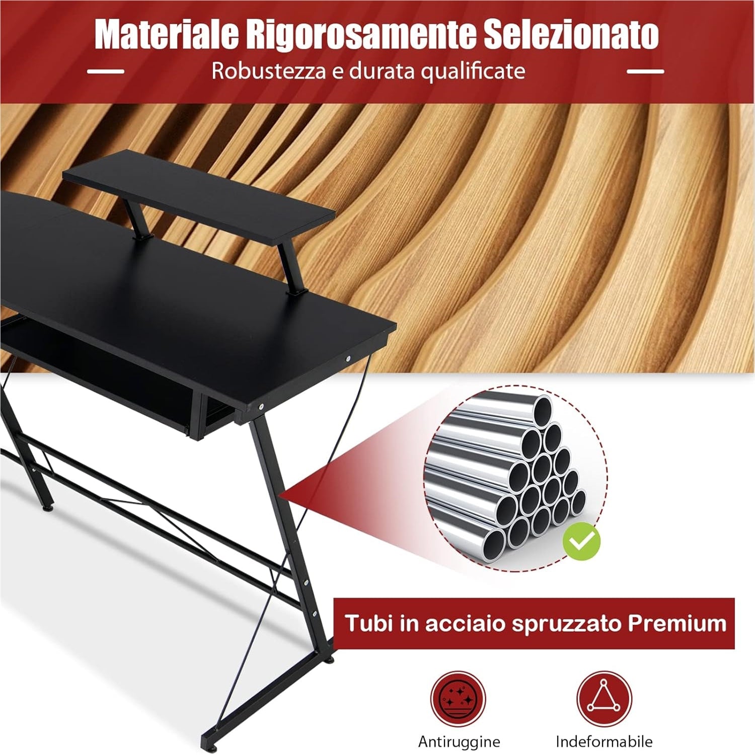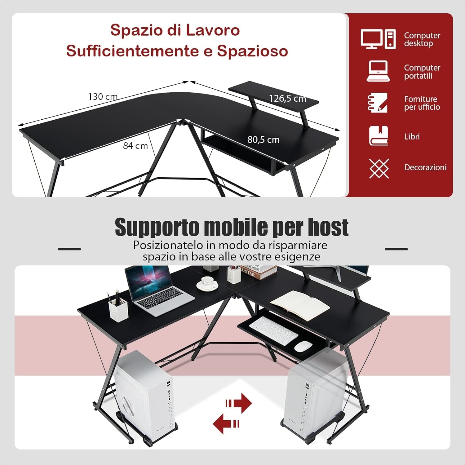 COSTWAY Scrivania Angolare in Legno, Scrivania Porta PC con Supporto Monitor Rimovibile e Vassoio Estraibile per Tastiera, Scrivania Salvaspazio per Studio e Ufficio, 126,5 x 130 x 94 cm, Nero