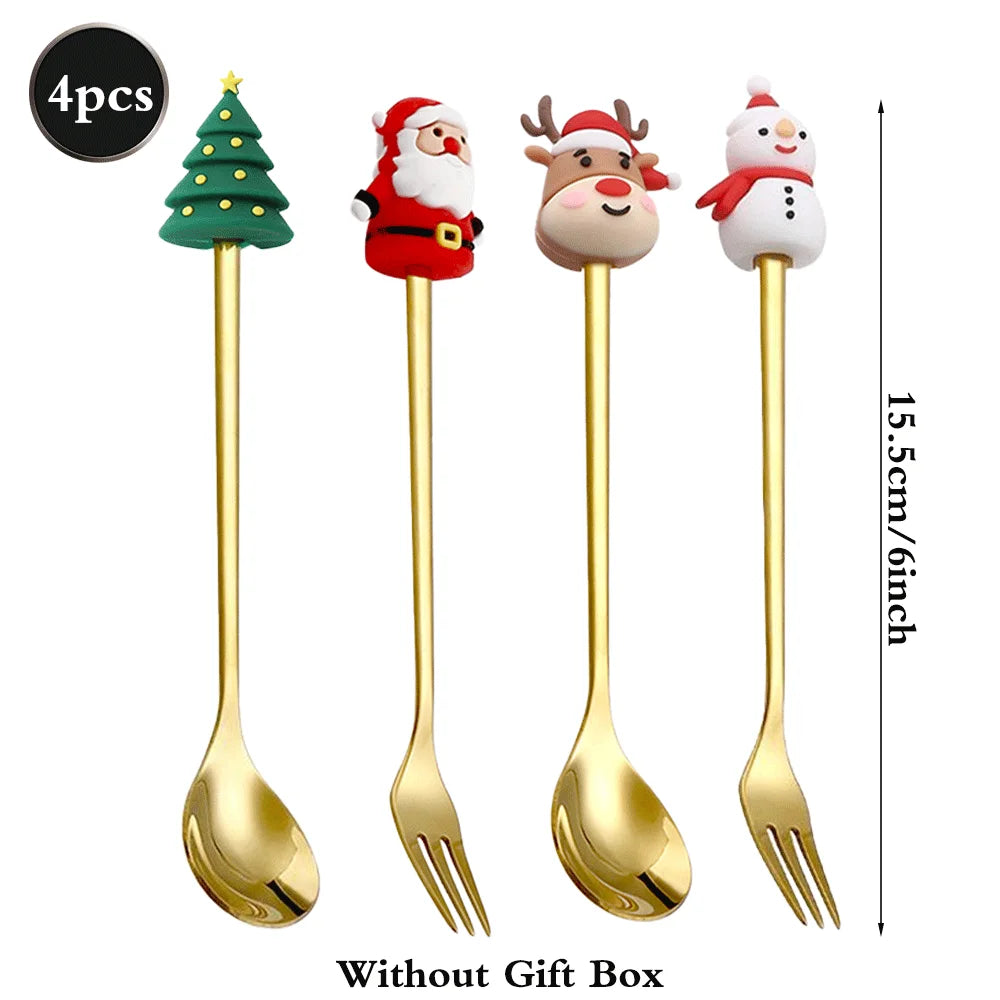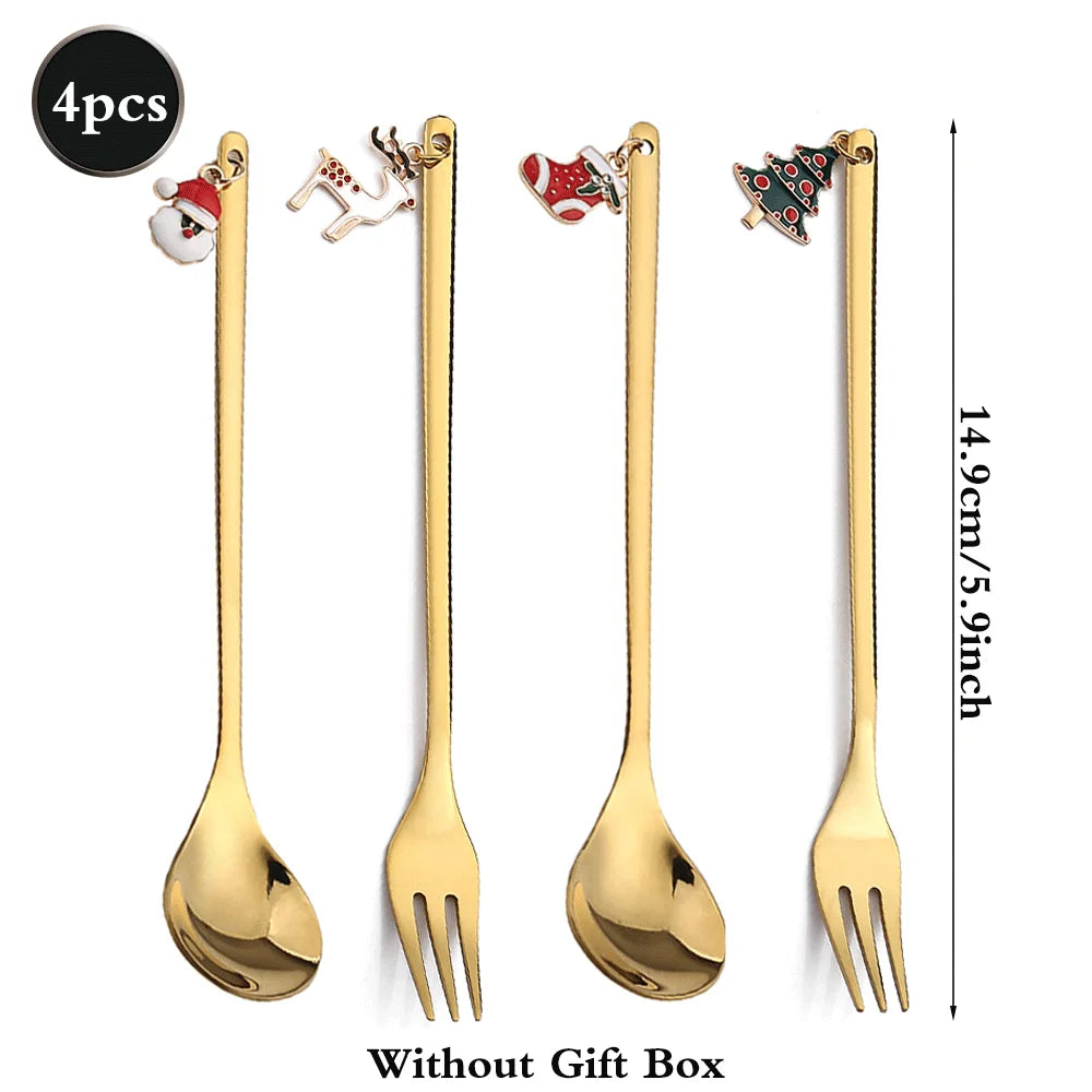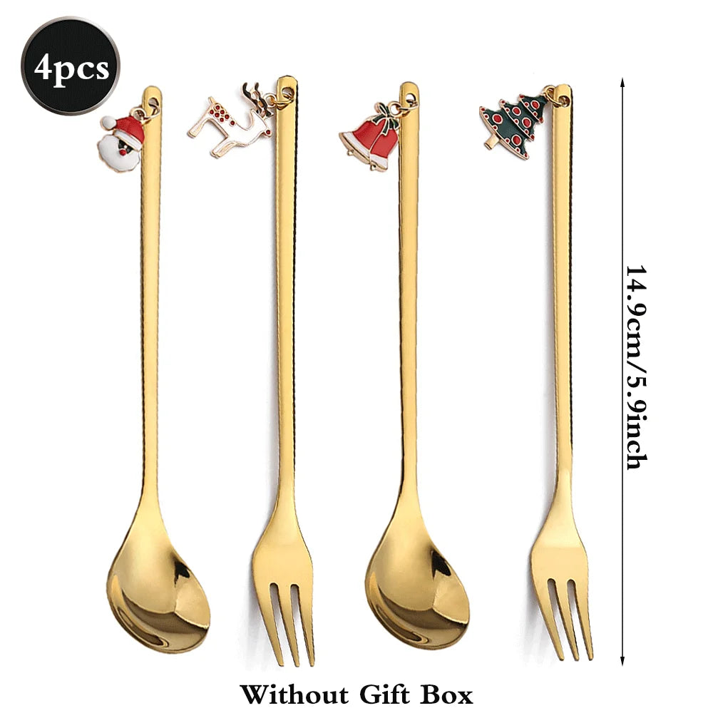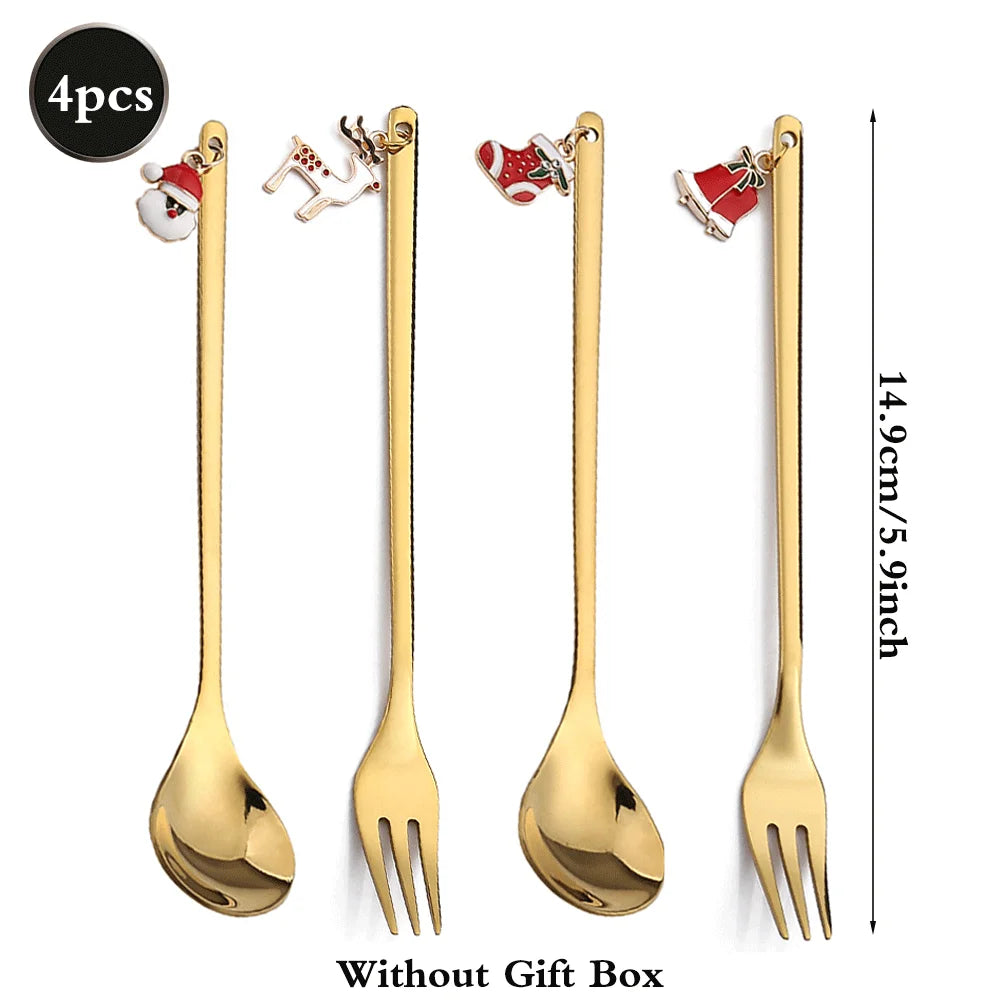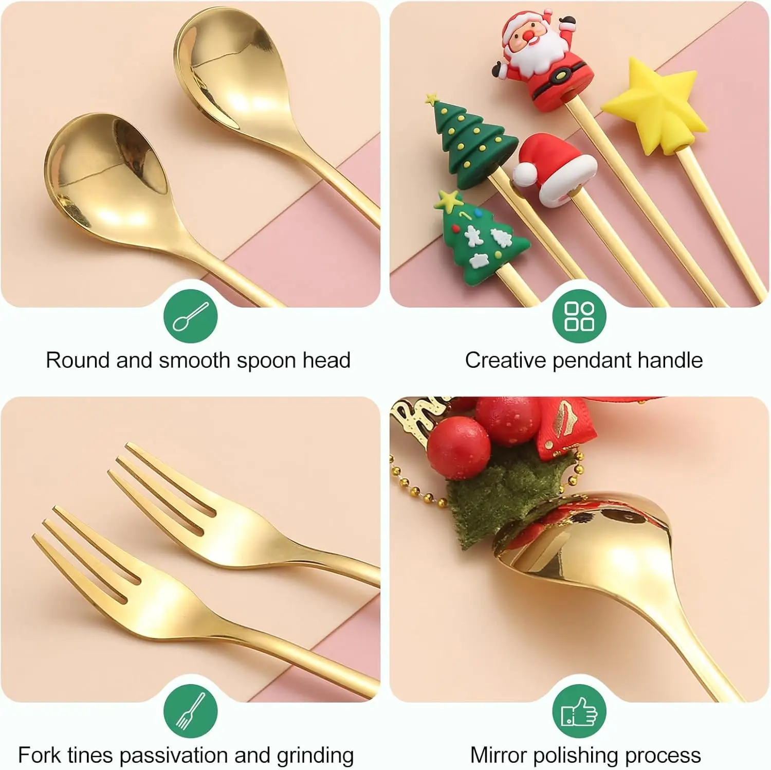 Cucchiaini da caffè e forchette per torte con decorazioni natalizie da 4 pezzi con ornamenti per bambole di Natale, set di posate in metallo dorato, forniture per feste
