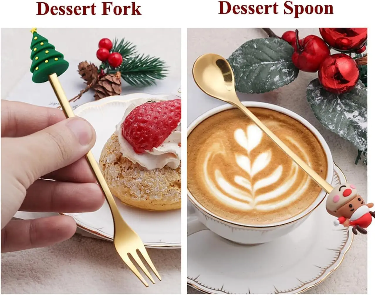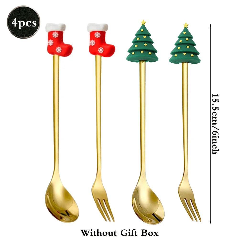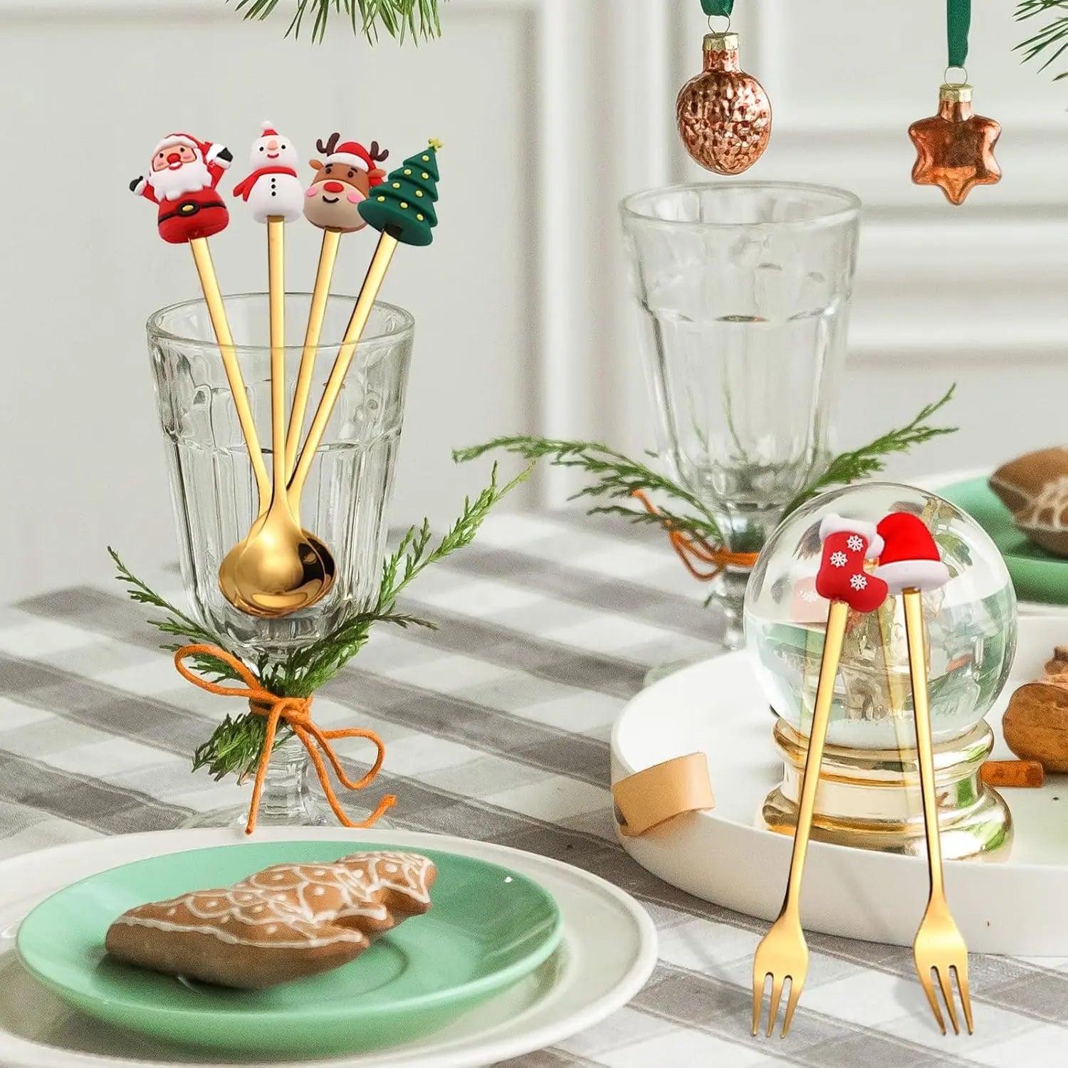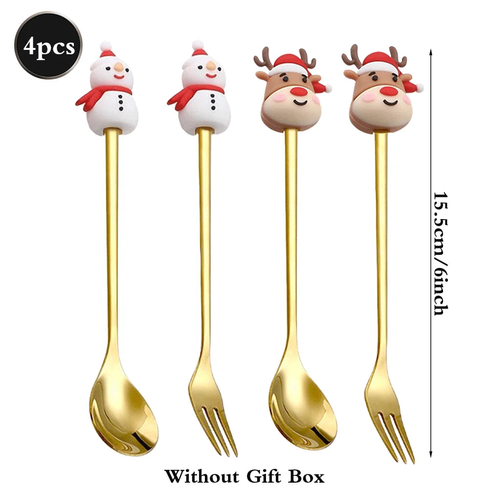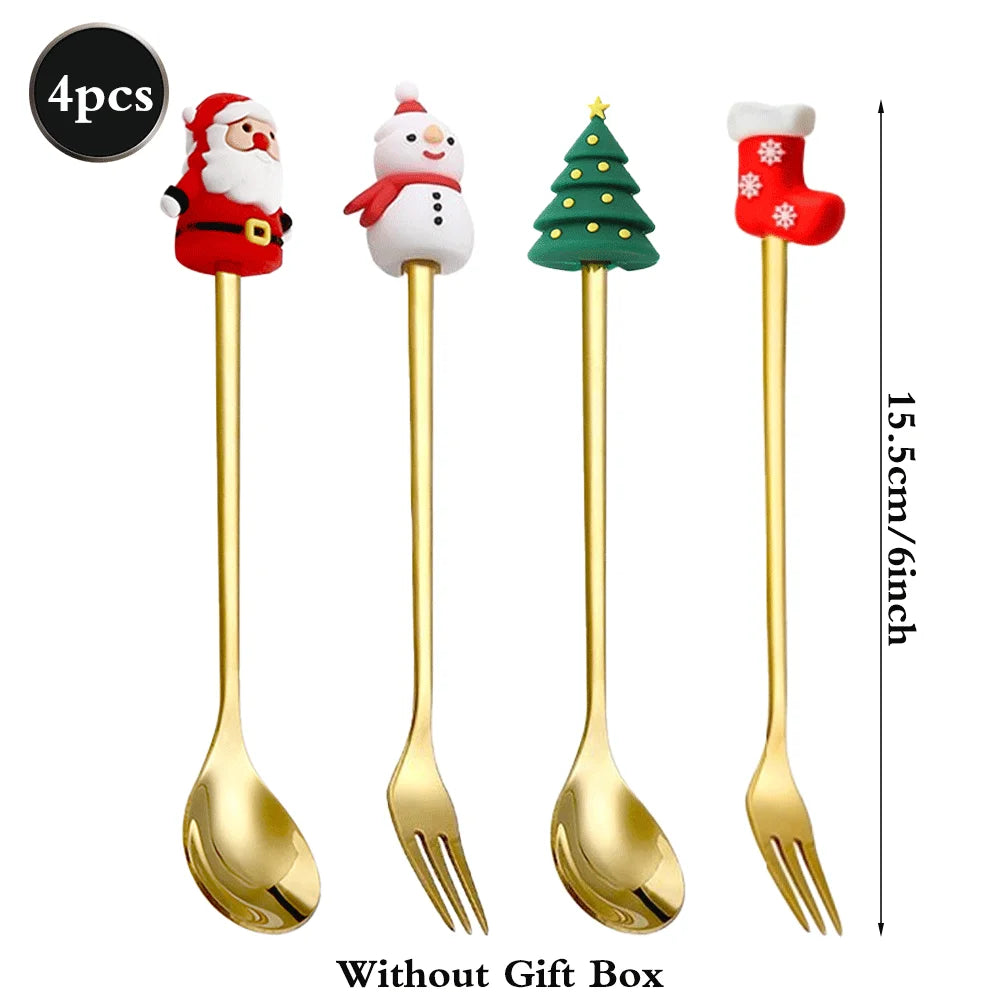 Cucchiaini da caffè e forchette per torte con decorazioni natalizie da 4 pezzi con ornamenti per bambole di Natale, set di posate in metallo dorato, forniture per feste