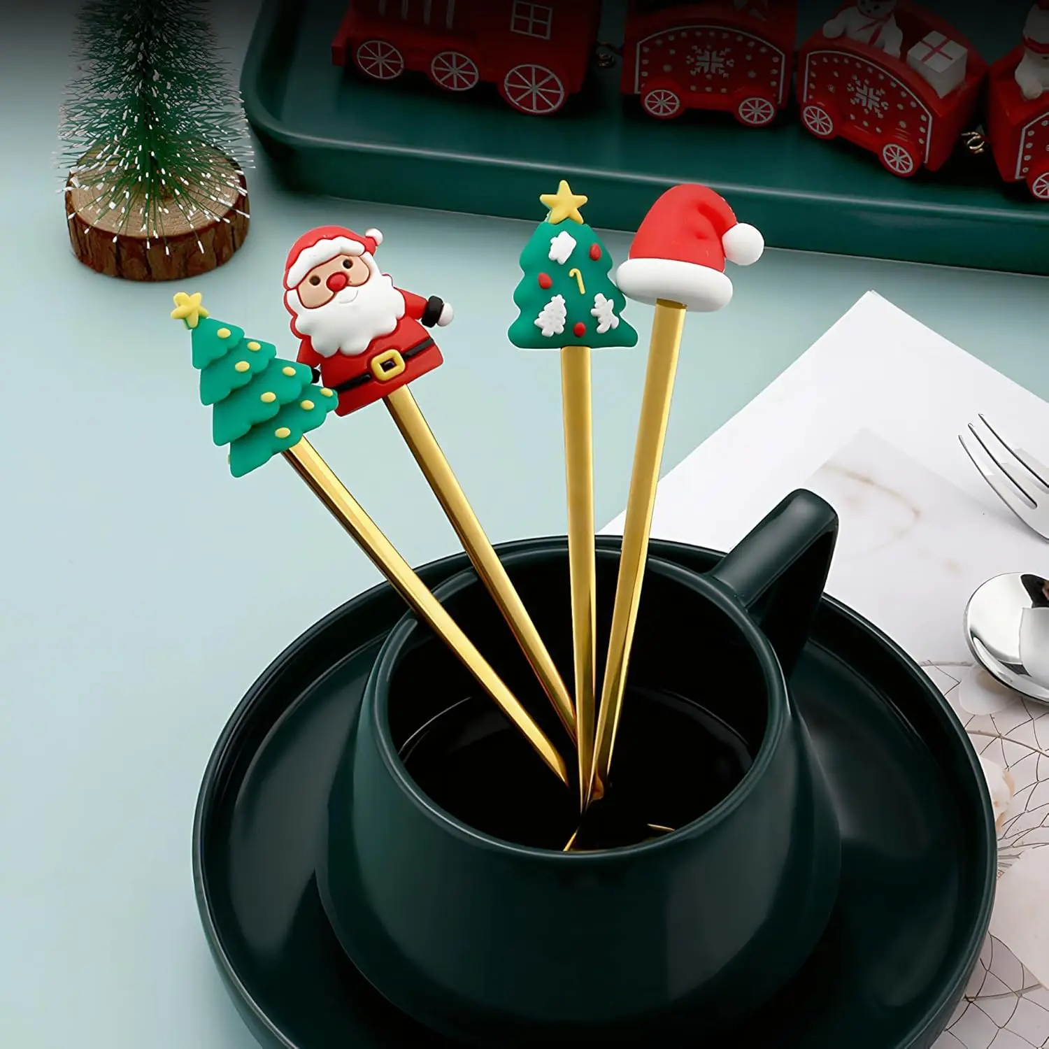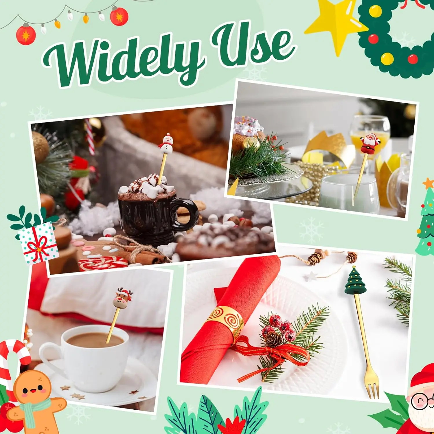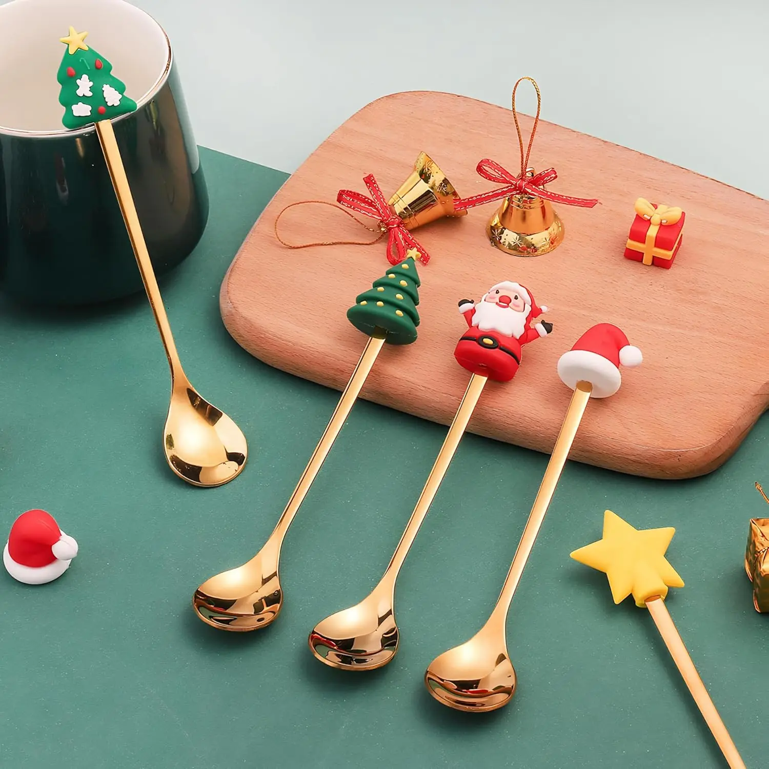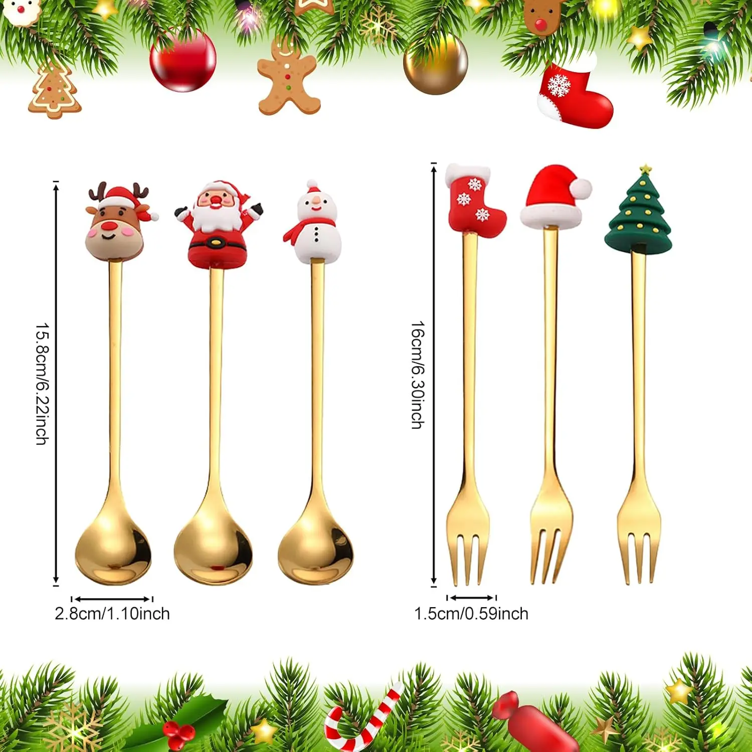 Cucchiaini da caffè e forchette per torte con decorazioni natalizie da 4 pezzi con ornamenti per bambole di Natale, set di posate in metallo dorato, forniture per feste