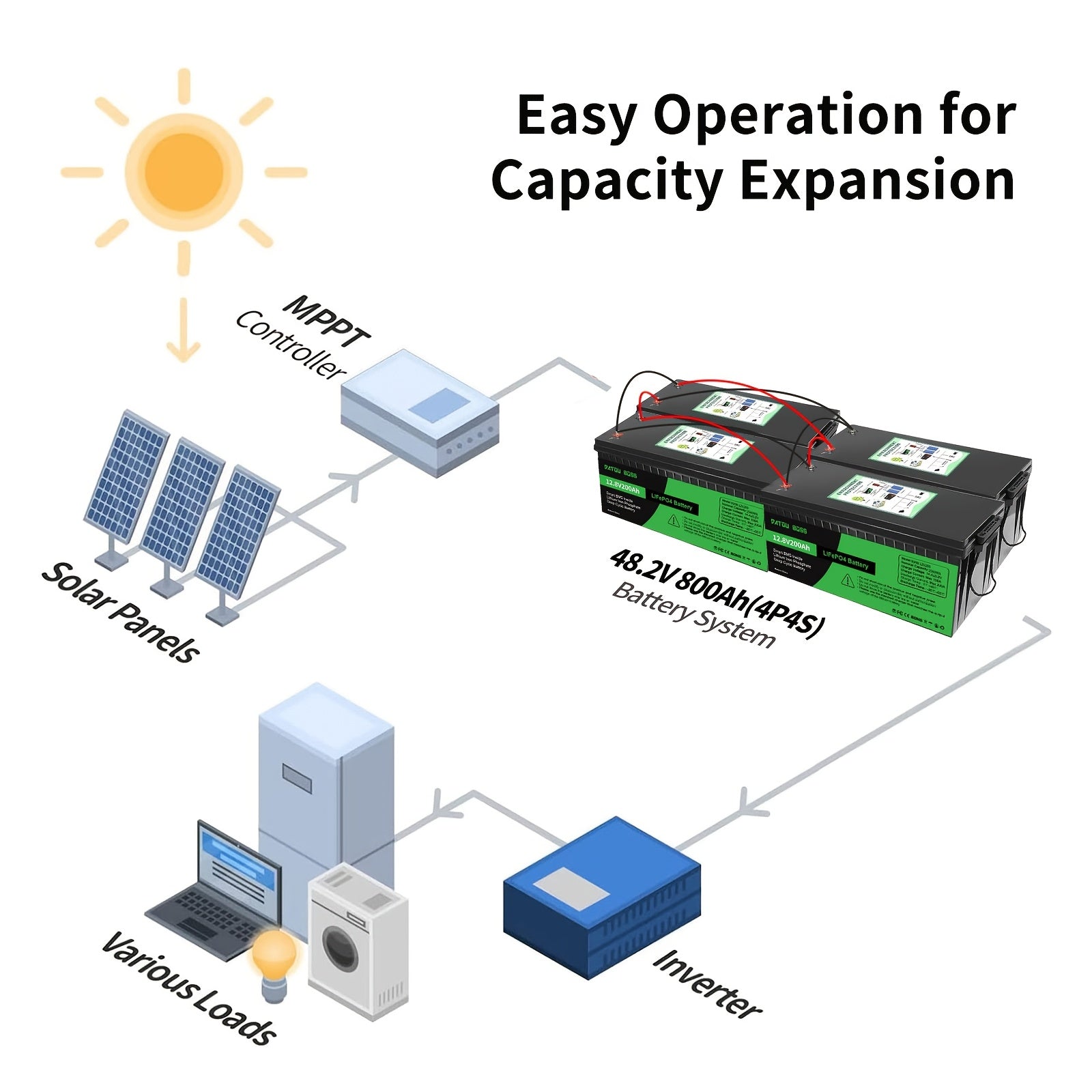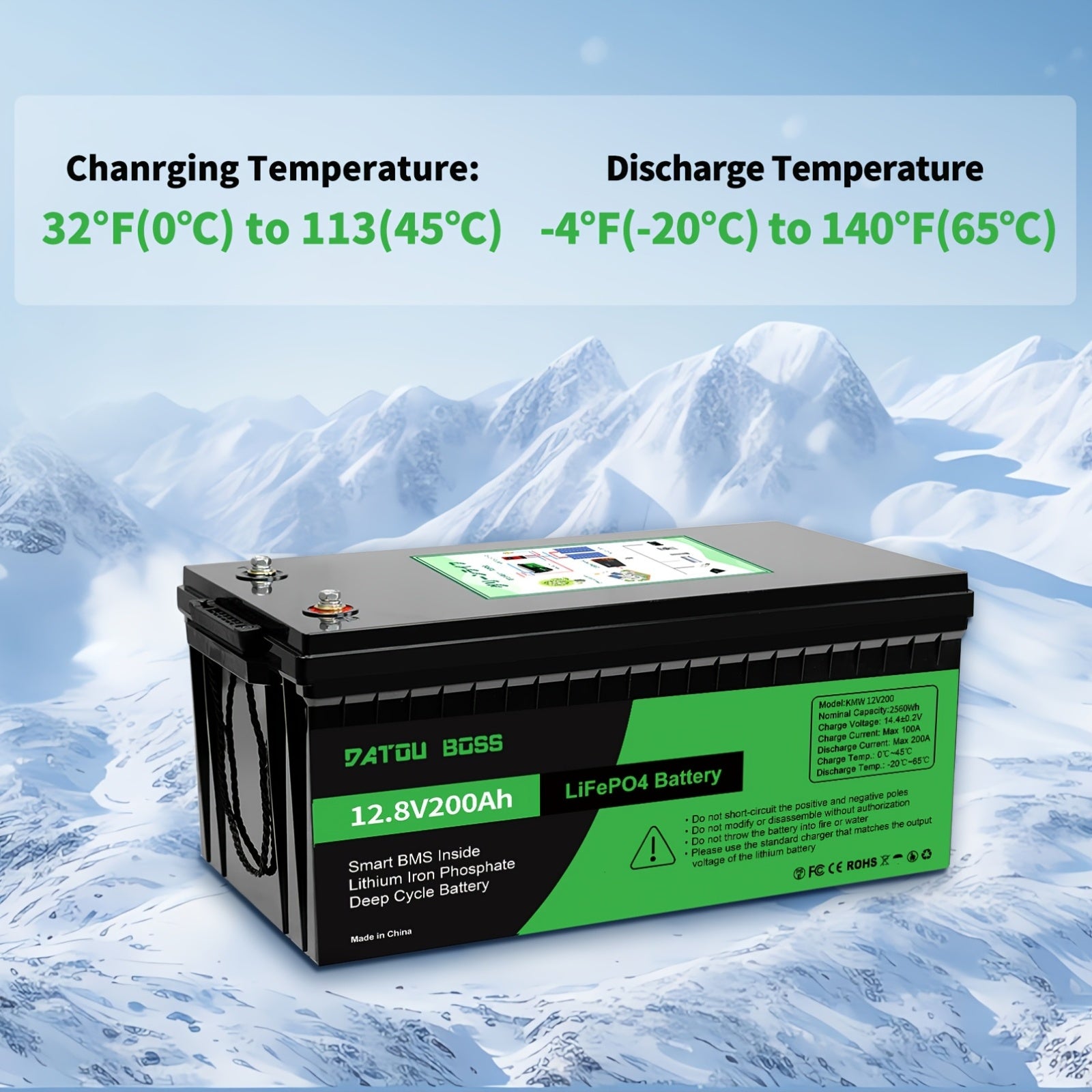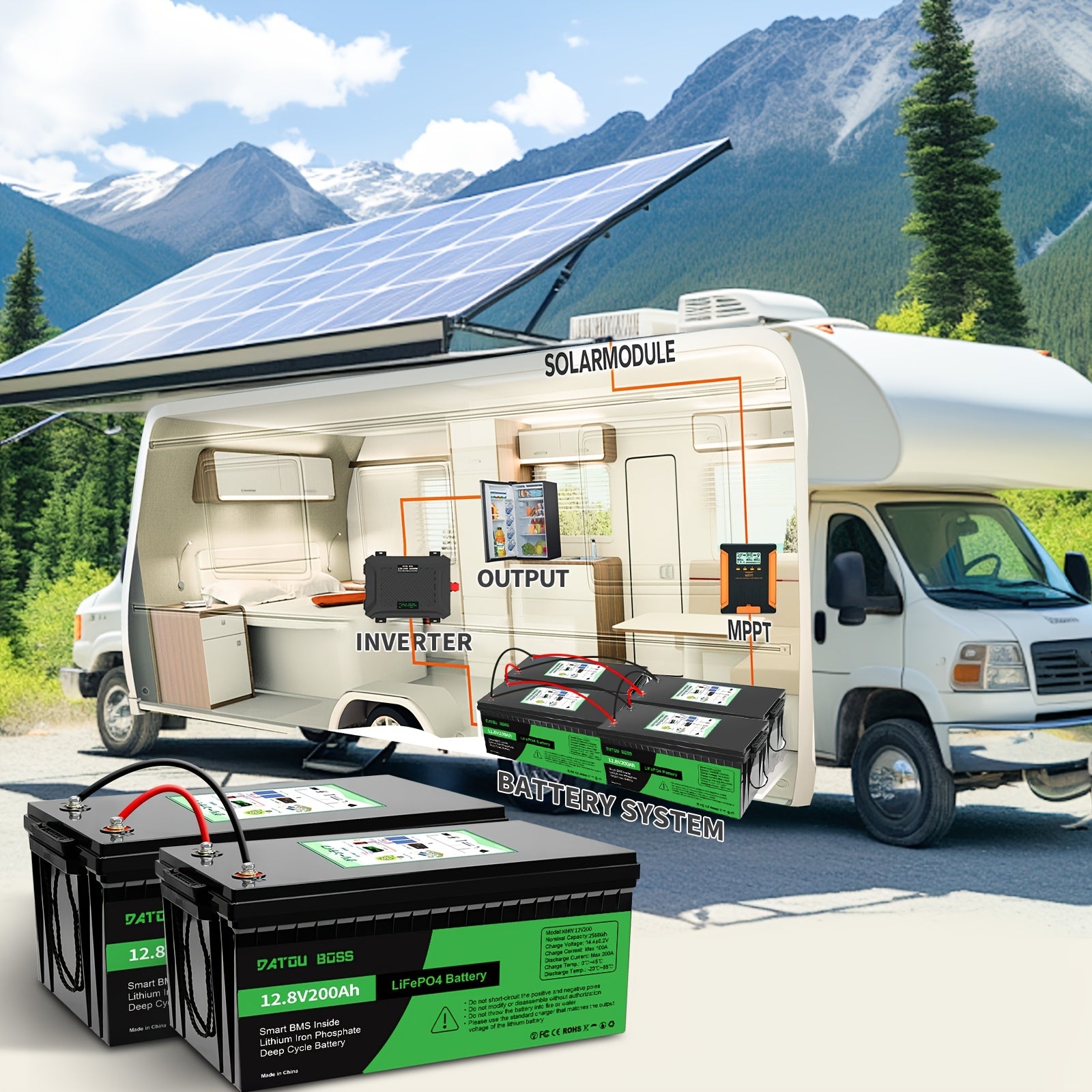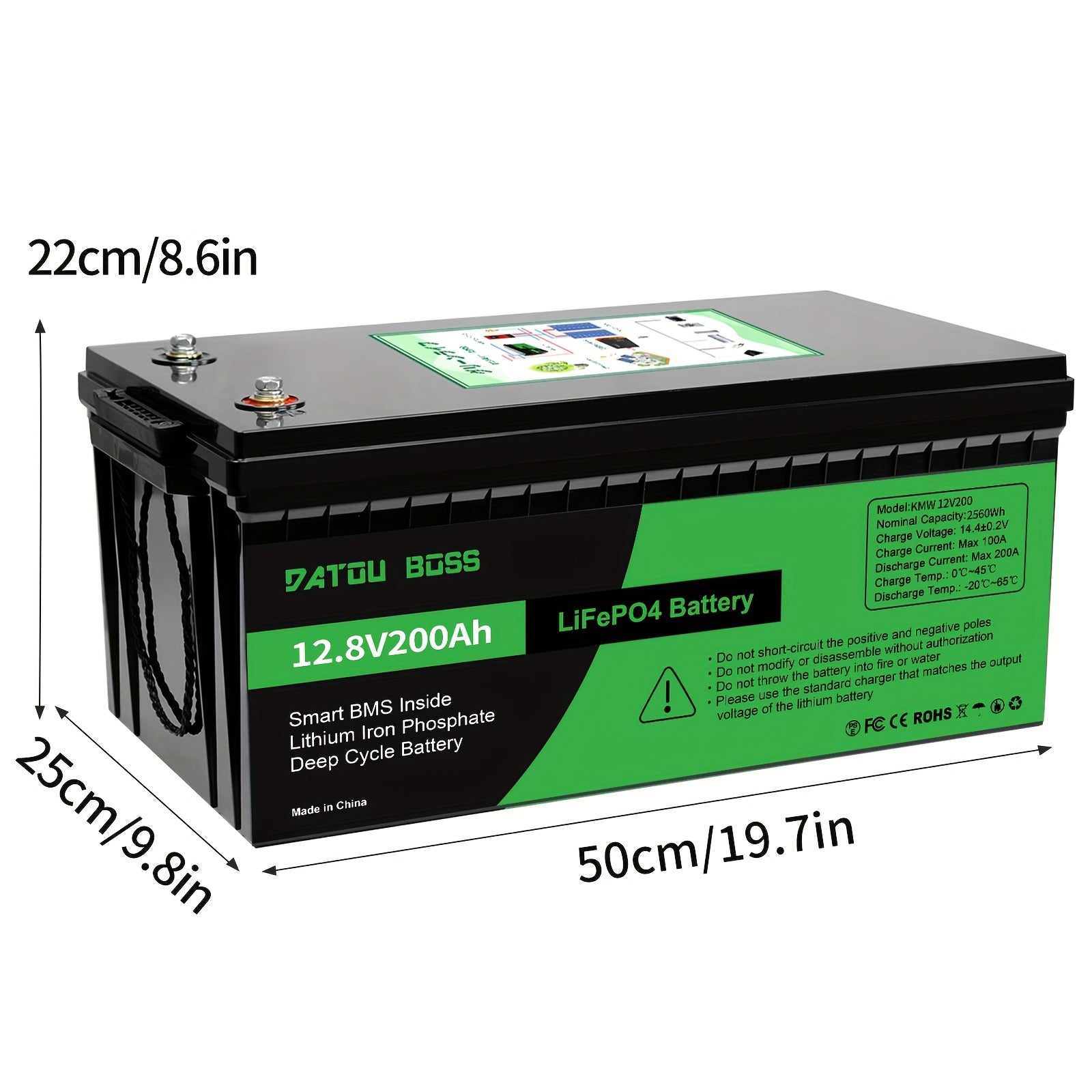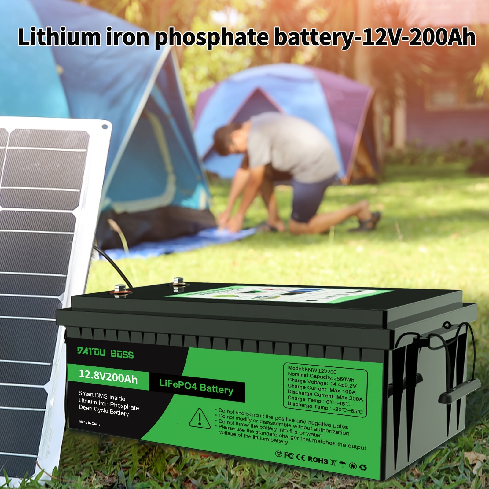 DATOUBOSS Batteria al Litio LiFePO4 12V 200Ah - BMS Integrato 200A, Ciclo Profondo di 8000+ Cicli, Supporto Potenza MAX 2560W, RMS Intelligente Interno, Sicuro e Durevole per Solare, Camper, Uso Fuori Rete, Batterie Ricaricabili