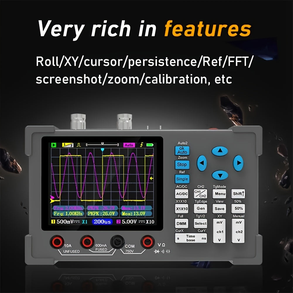 DSO3D12 Oscilloscopio Digitale da Tavolo 3 in 1 3,2 Pollici 120MHz di Banda Doppio Canale 250MSa/s Multimetro Integrato + Display Generatore di Segnale