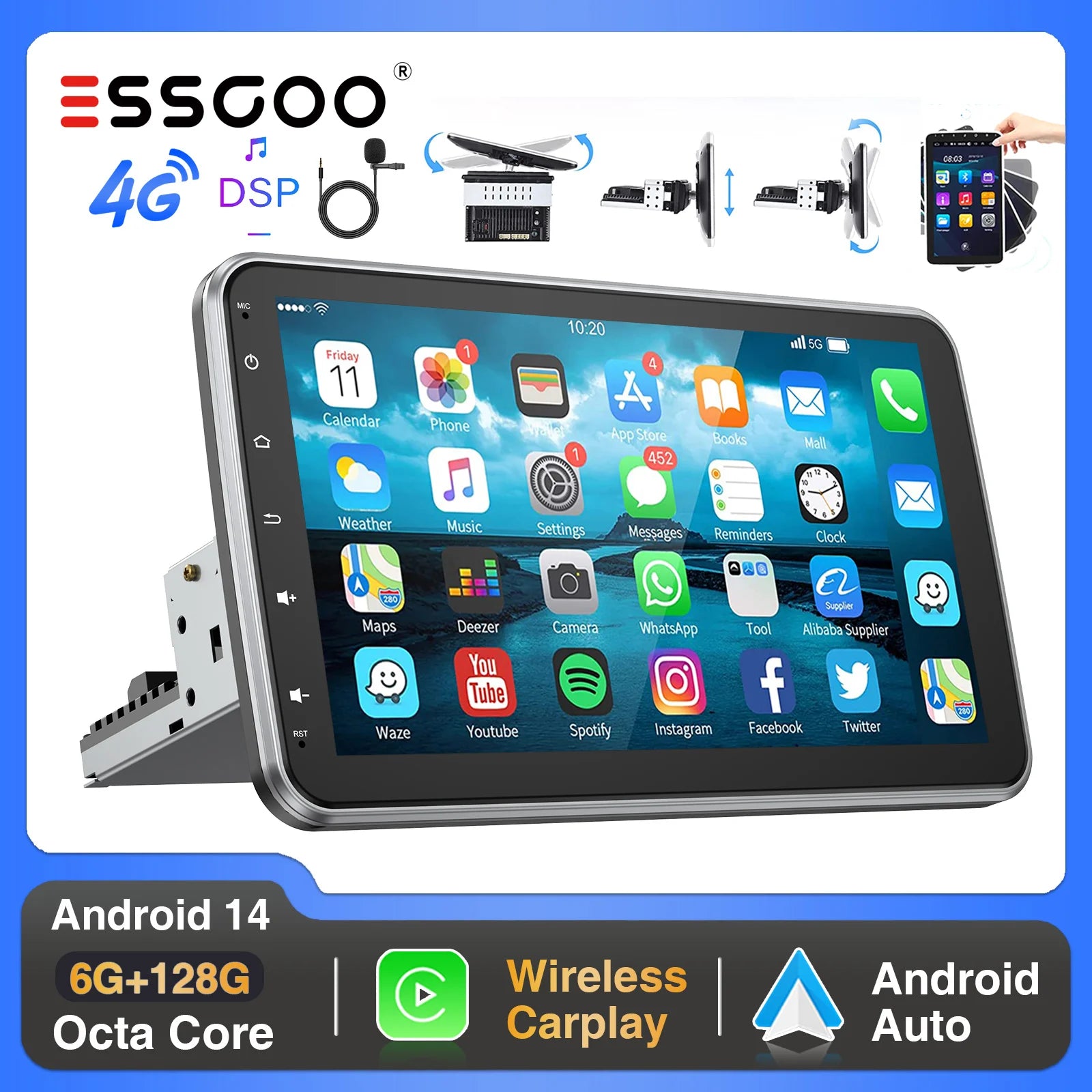ESSGOO 10.1 Inch 8 Core 6G+128G Carplay 4G Android 14 Car Radio 1 DIN Rotatable Screen GPS NAVI AM DSP USB Wifi with Microphone