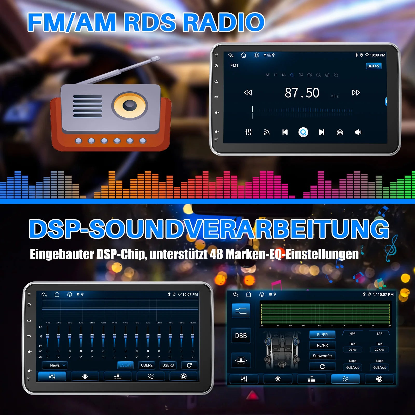 FM/AM/RDS-Radio und Bluetooth und DSP-Sound:  Unterstützt Bluetooth 5,0, mit integriertem Mikrofon, damit Sie während der Fahrt freihändig telefonieren können. Unterstützt den Zugriff auf das Telefonbuch, die Musikwiedergabeschnittstelle usw.  RDS unterstützt. Sie können 18 FM und 12 AM Radiosender speichern. Eingebauter DSP-Chip. Unterstützt 48-Band-EQ-Einstellung, Mit der DSP-Funktion können Sie den Klang jedes Lautsprechers mithilfe verschiedener Entzerrungsmethoden individuell anpassen: Jazz, Rock, Pop, Klassik usw., um einen außergewöhnlichen Höreffekt für Sie zu erzielen!, die nach Ihren persönlichen Vorlieben eingestellt werden kann. 4 x 45W Verstärker, Surround-Sound und Subwoofer-Ausgang.