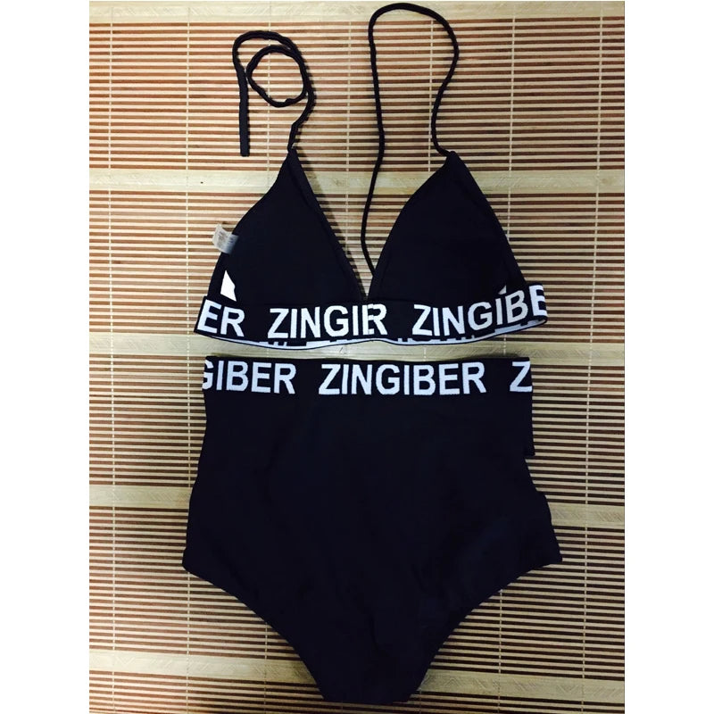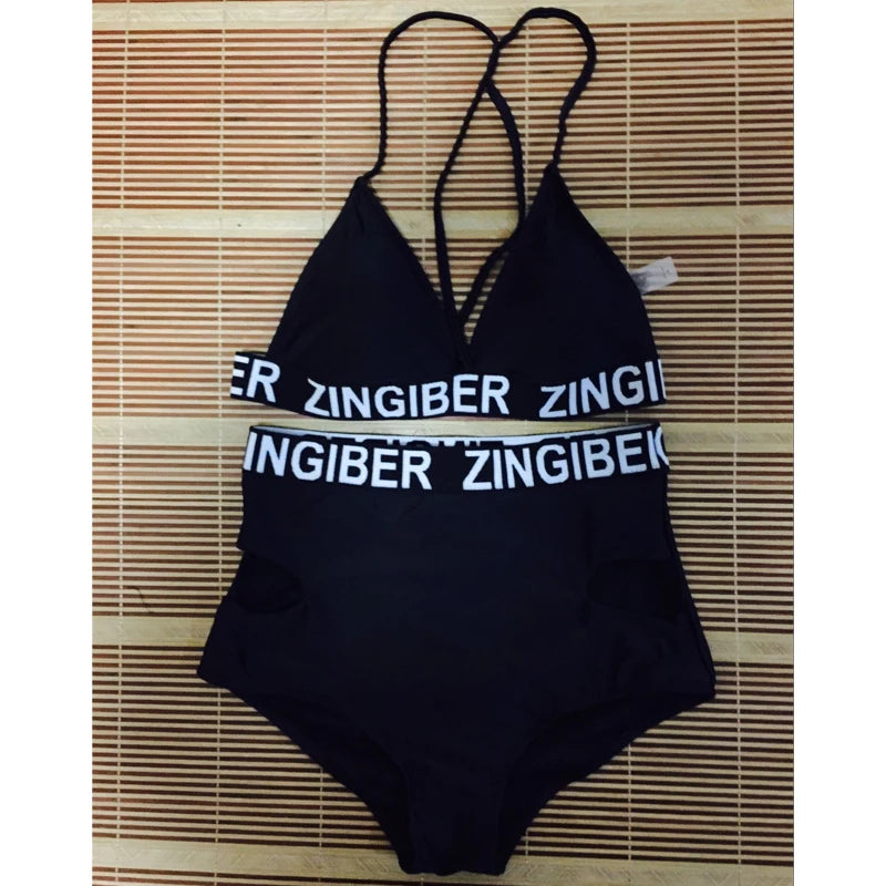 FS High Cut Bikinis Set Black Letter Zingiber Halter Top Bandage High Waist Bathing Suit Swimsuit Plus Size Swimwear Beach Women
