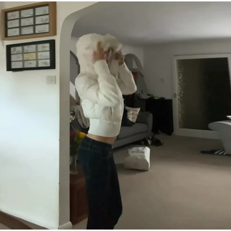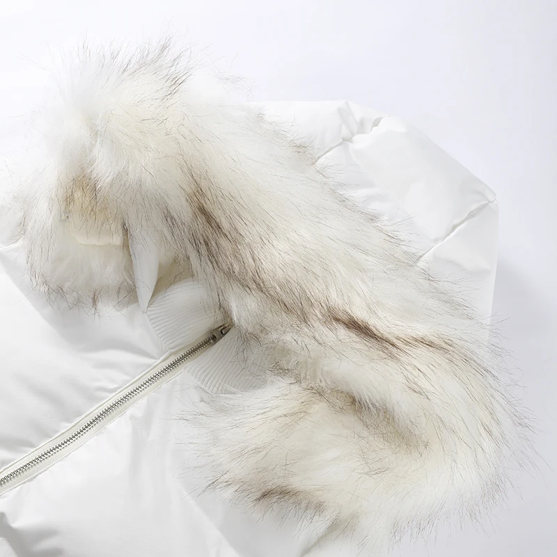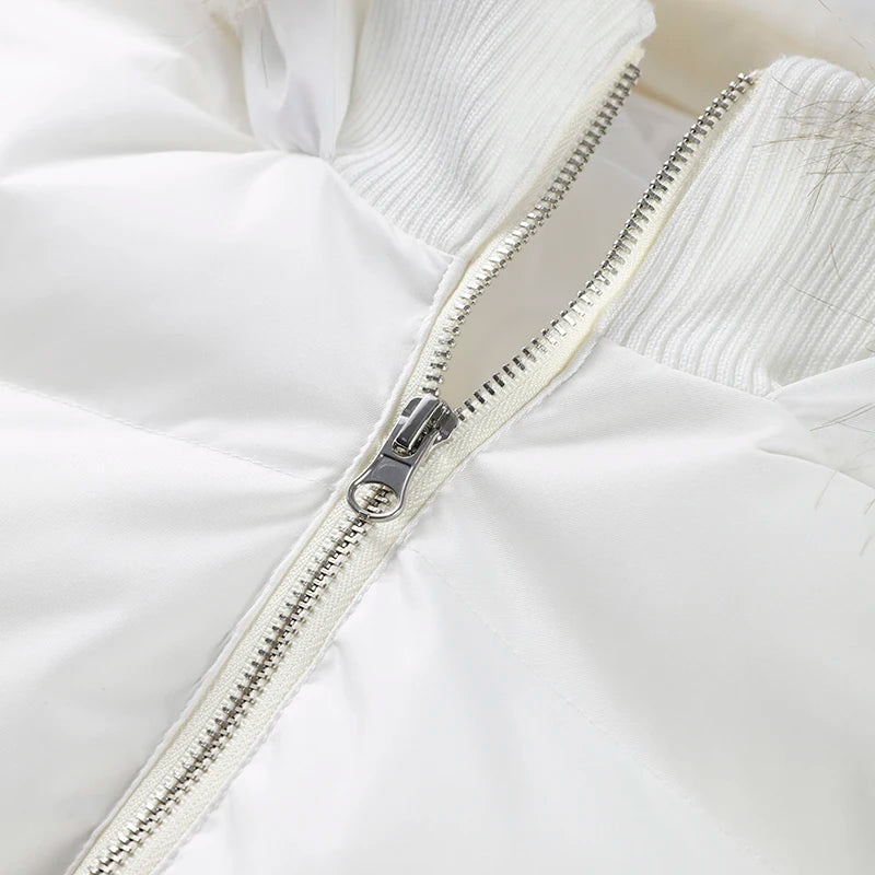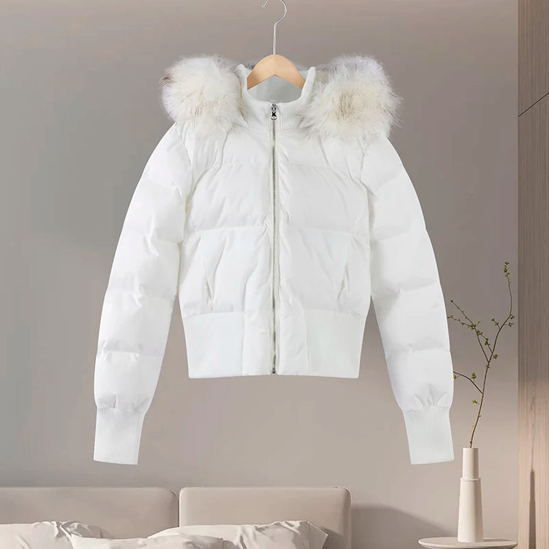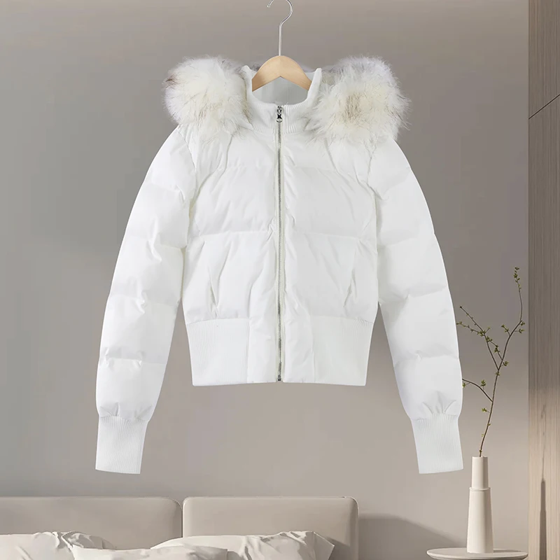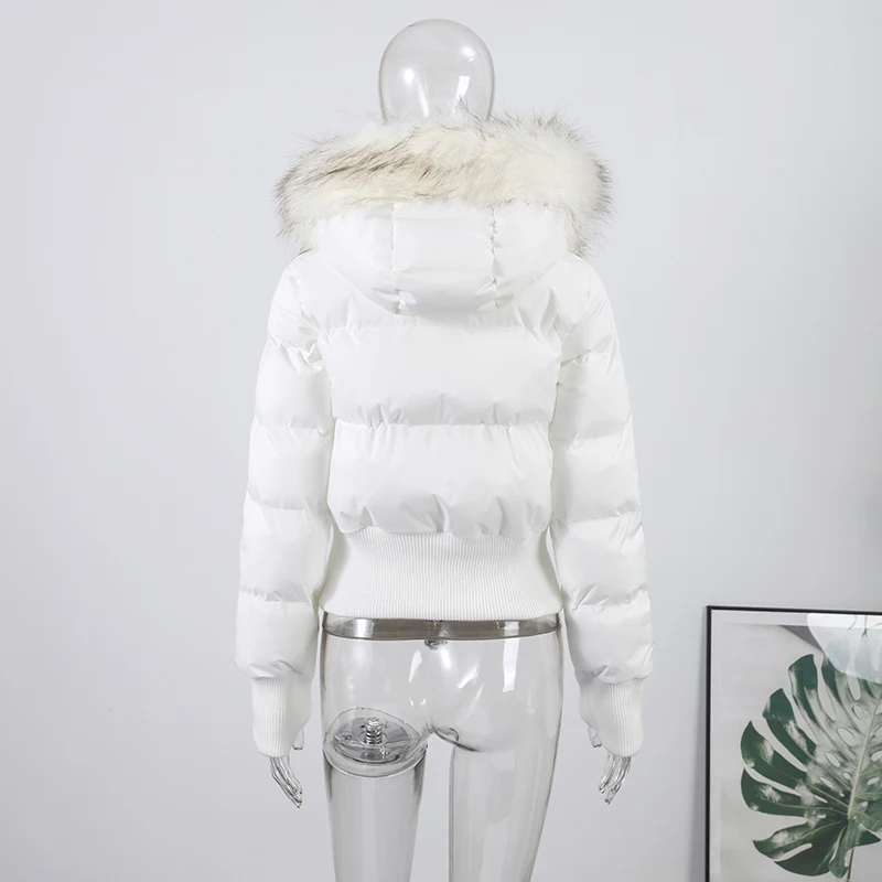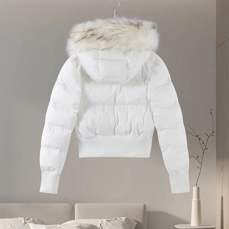 Giacca corta chic con tasca con cerniera a maniche lunghe Cappotto trapuntato con cappuccio in pelliccia sintetica da donna di moda 2025 Capispalla imbottito invernale New Lady
