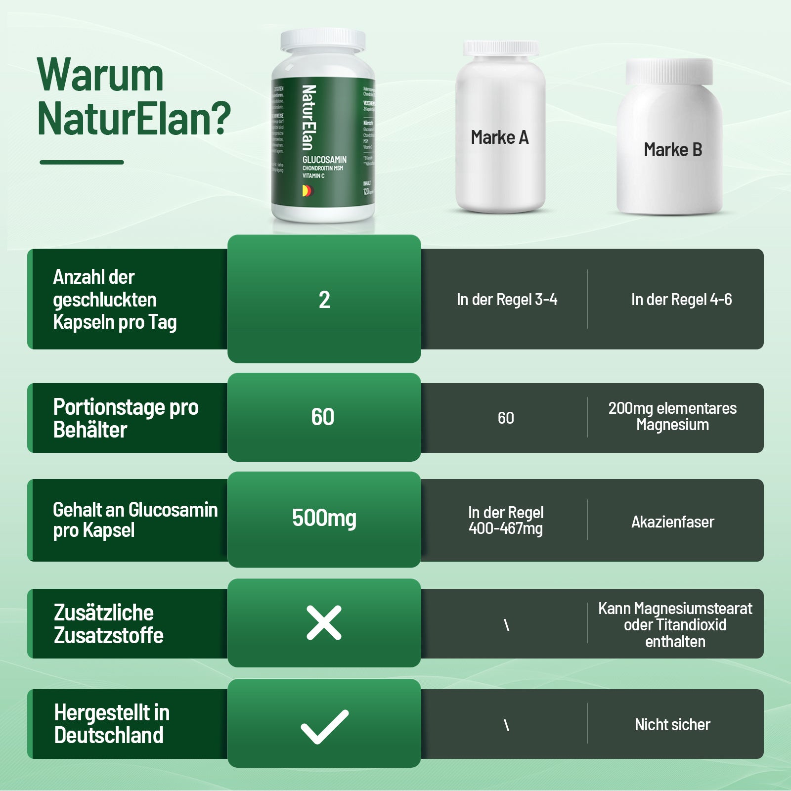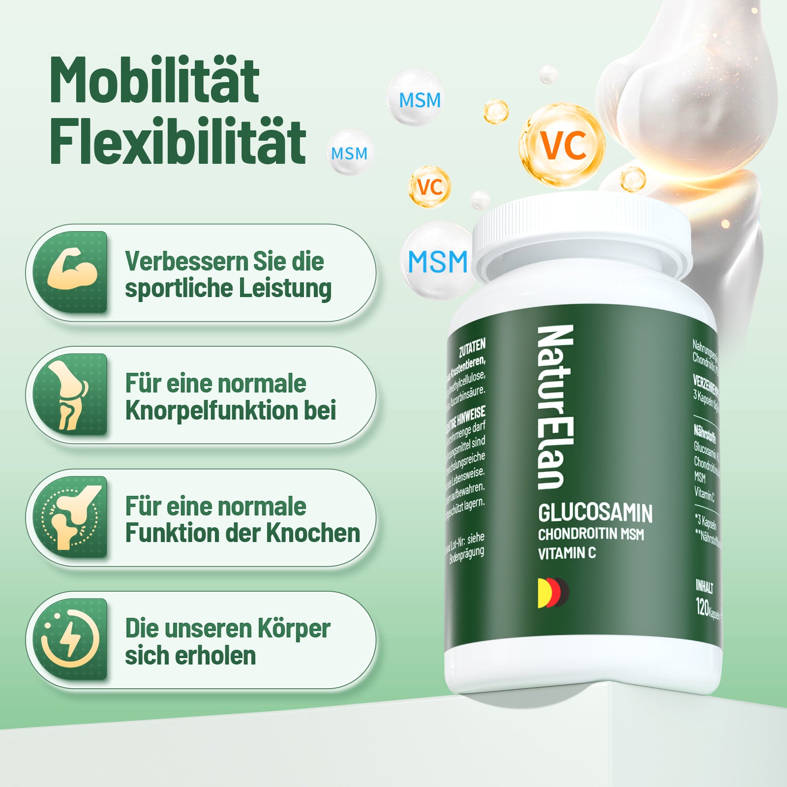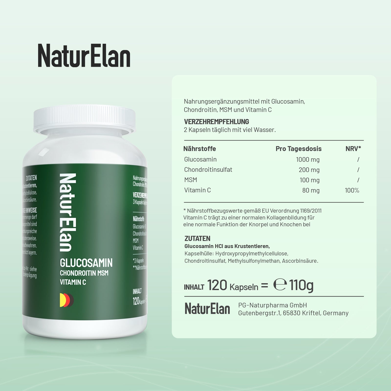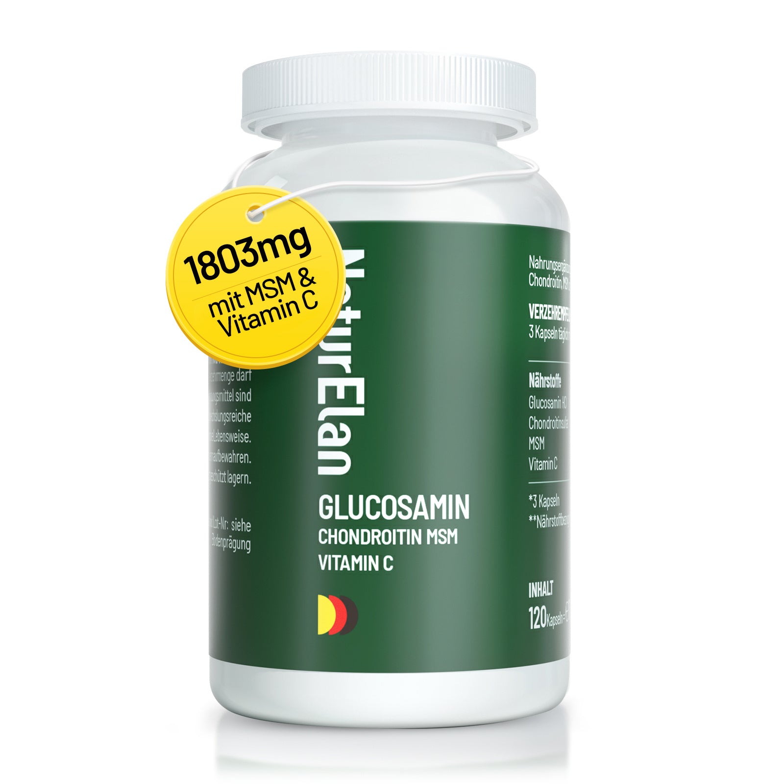 Glucosamina e condroitina ad alta dose - 1803 mg di glucosamina a dose giornaliera con MSM e vitamina C, testato in laboratorio, senza additivi, 120 capsule, prodotto in Germania