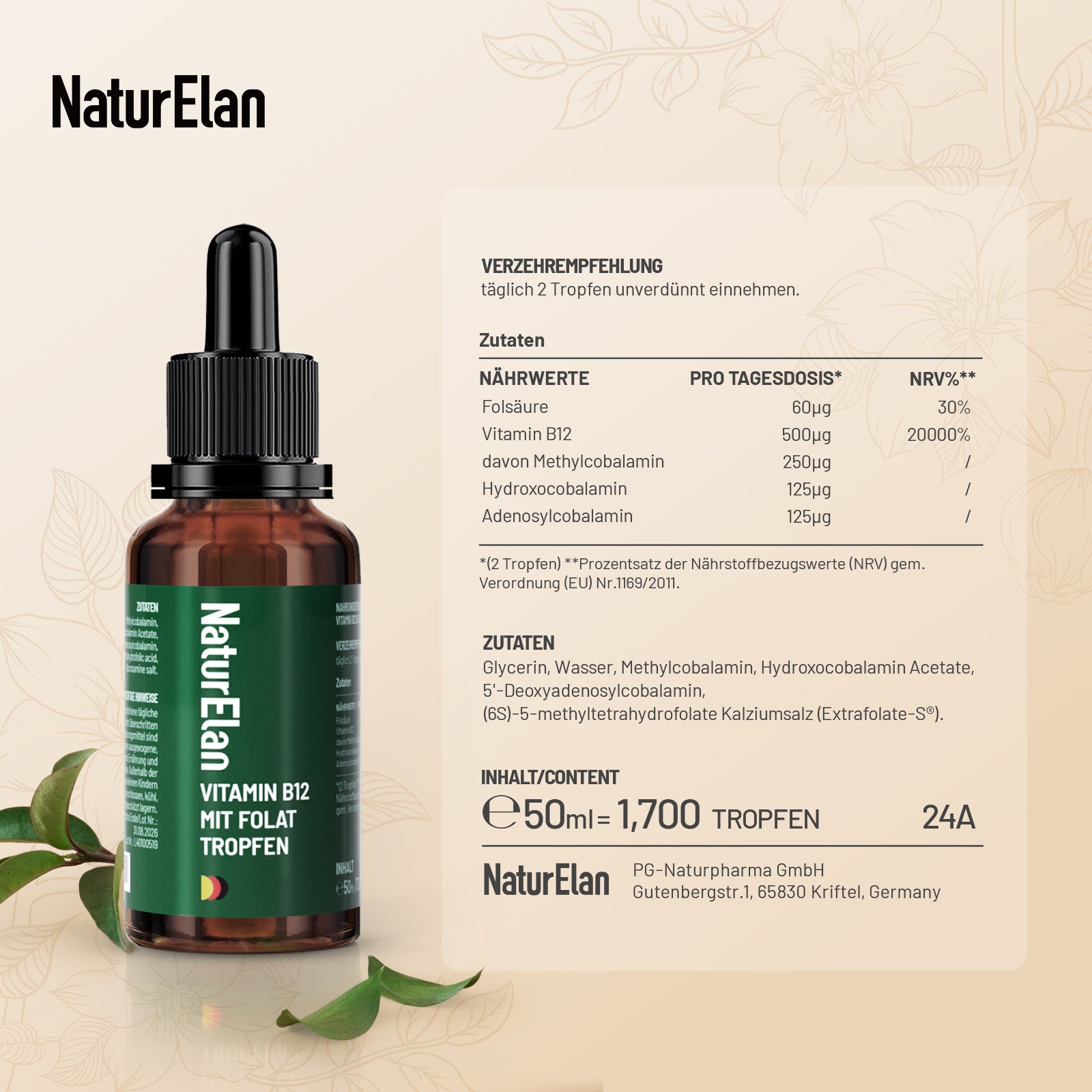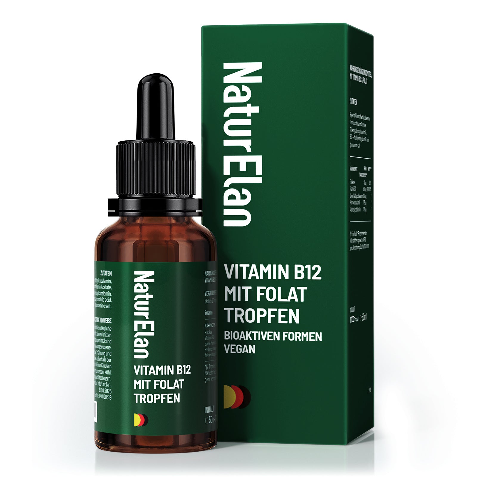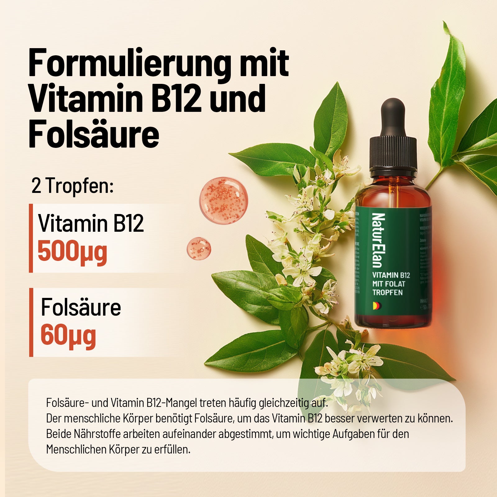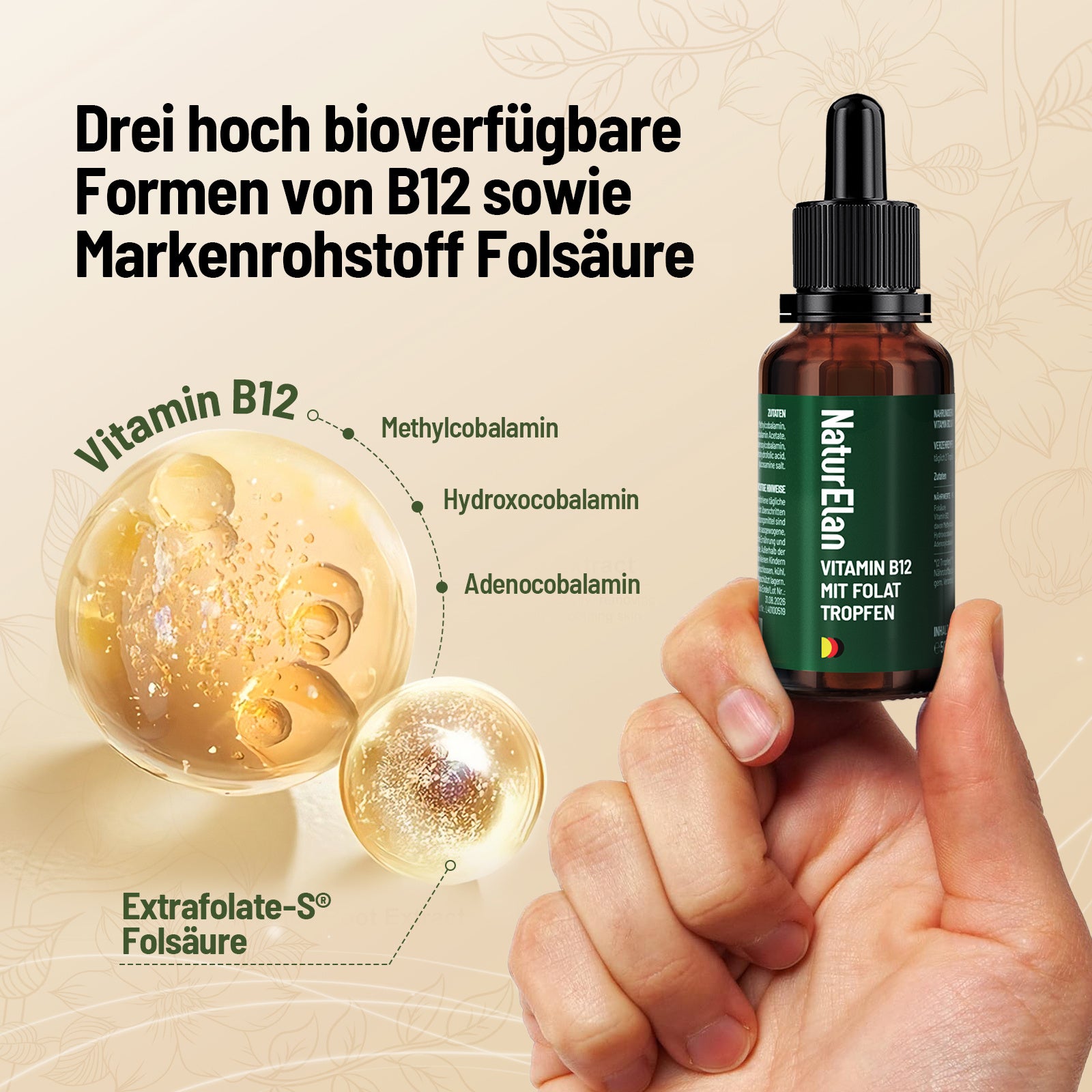 Gocce di vitamina B12 ad alta dose 50 ml - 500 mcg di B12 e 60 mcg di acido folico per dose quotidiana, 3 forme attive di B12 e acido folico bioattivo, senza additivi sintetici, vegano, prodotto in Germania