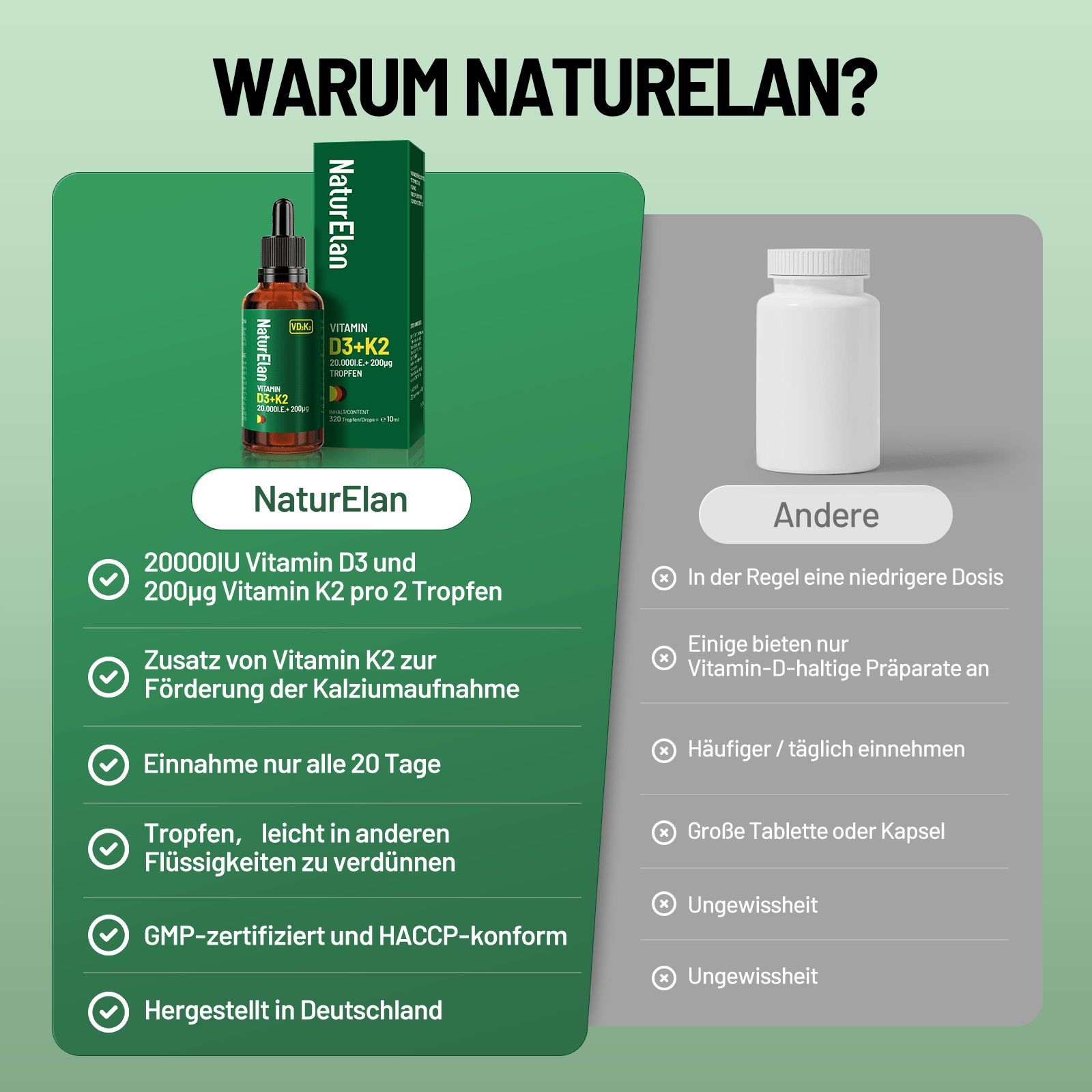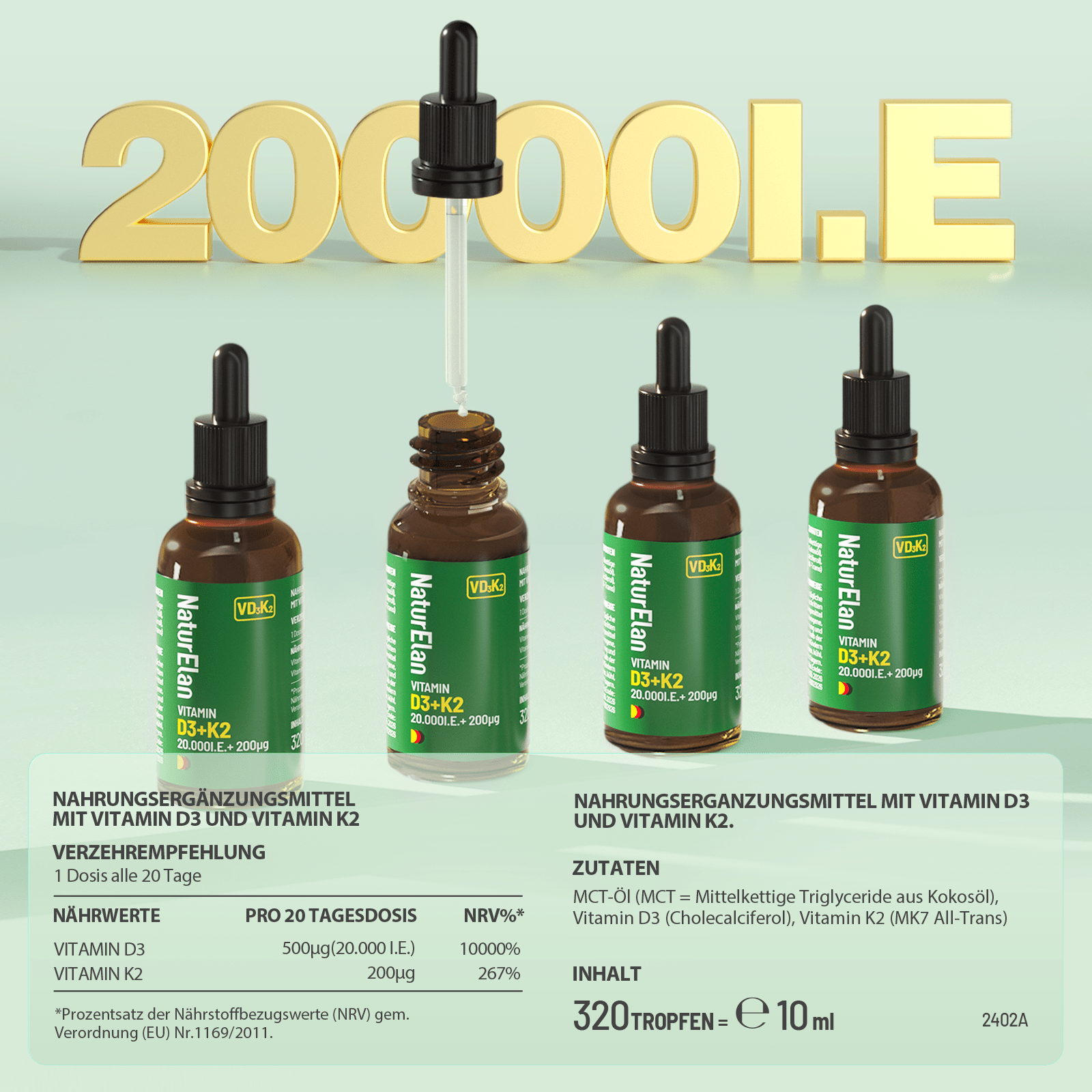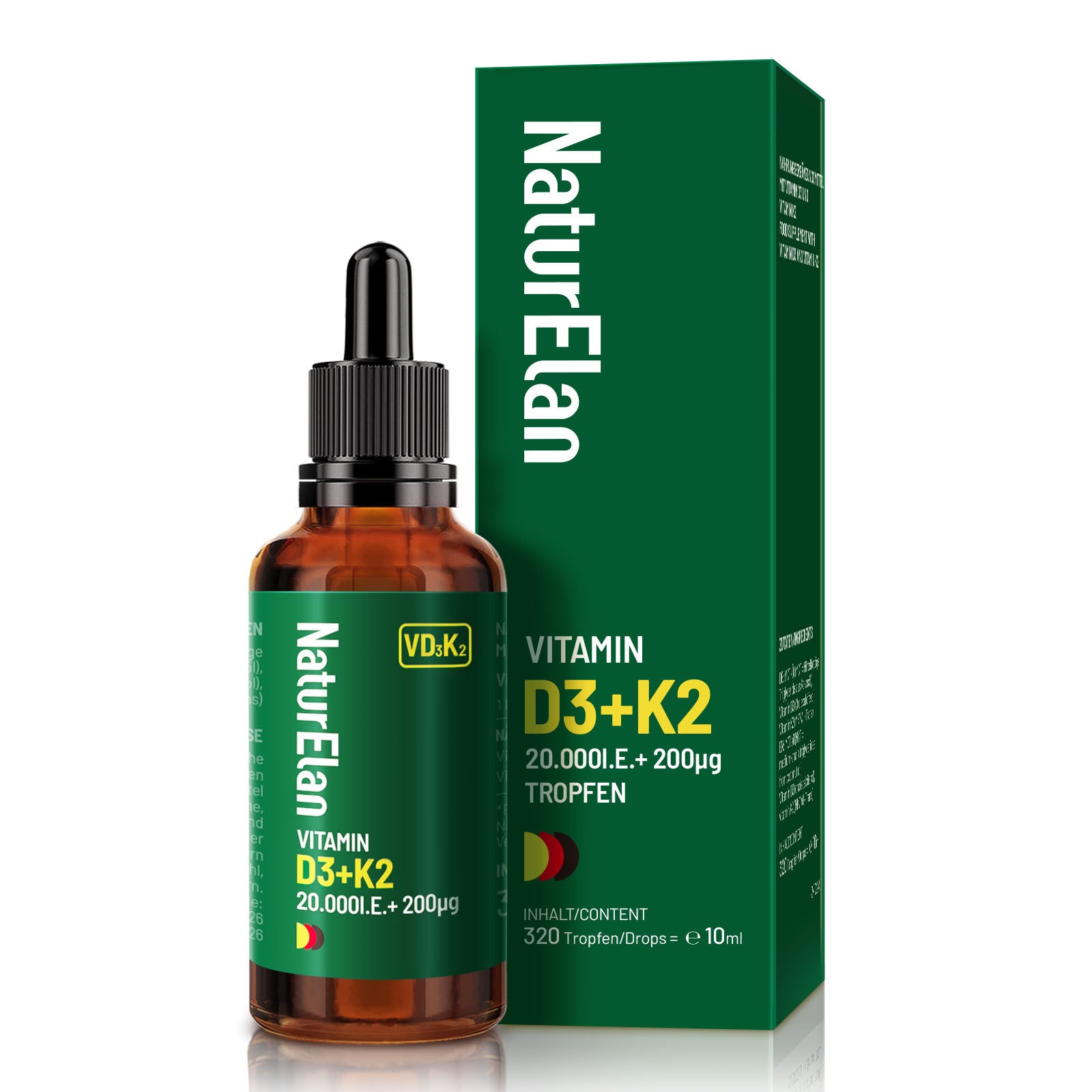 Gocce di vitamina D3 K2 ad alta dose - 20.000 IU + vitamina K2 MK7 200 mcg per dose, 2 gocce per dose ogni 20 giorni, 1000 IU di vitamina D al giorno. Vegetariano, senza additivi, prodotto in Germania.