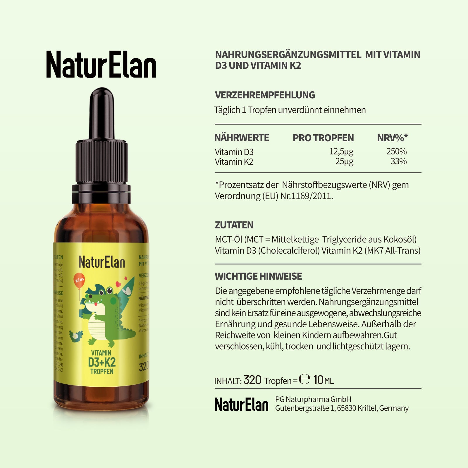 Gocce per Bambini di Vitamina D3 K2 per 320 Giorni - 500 UI di Vitamina D & 25μg di Vitamina K2, vegetariane, senza additivi, prodotte in Germania