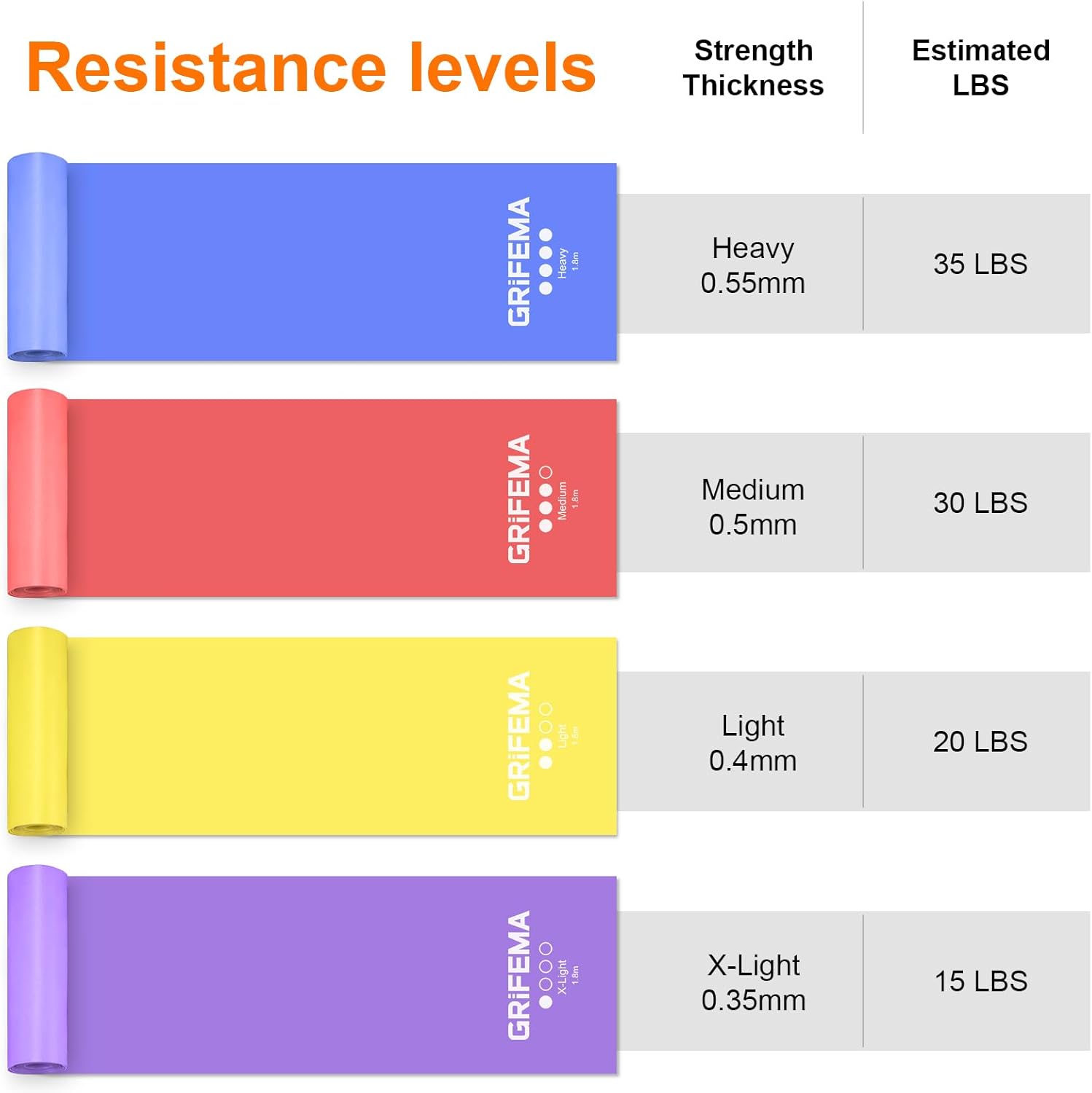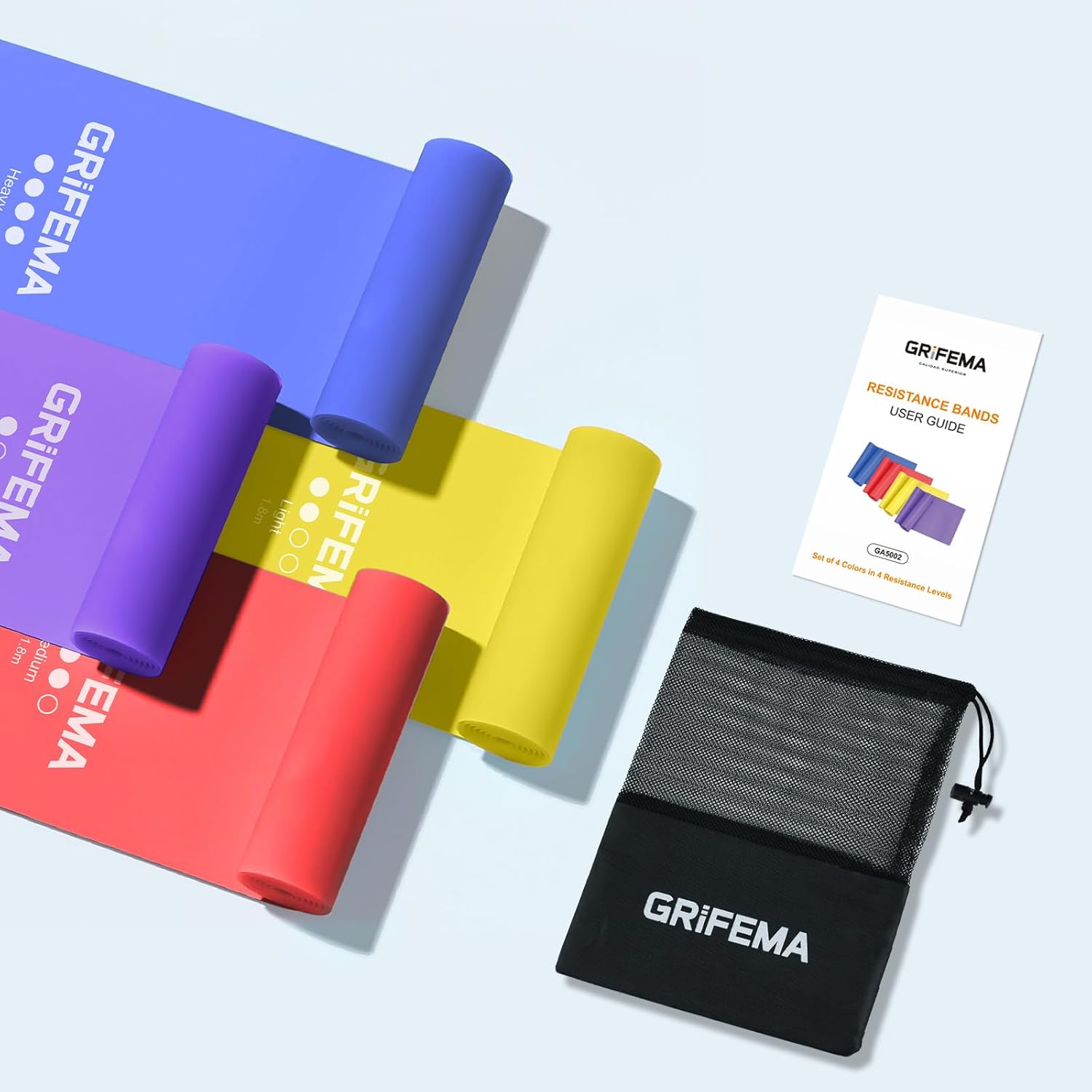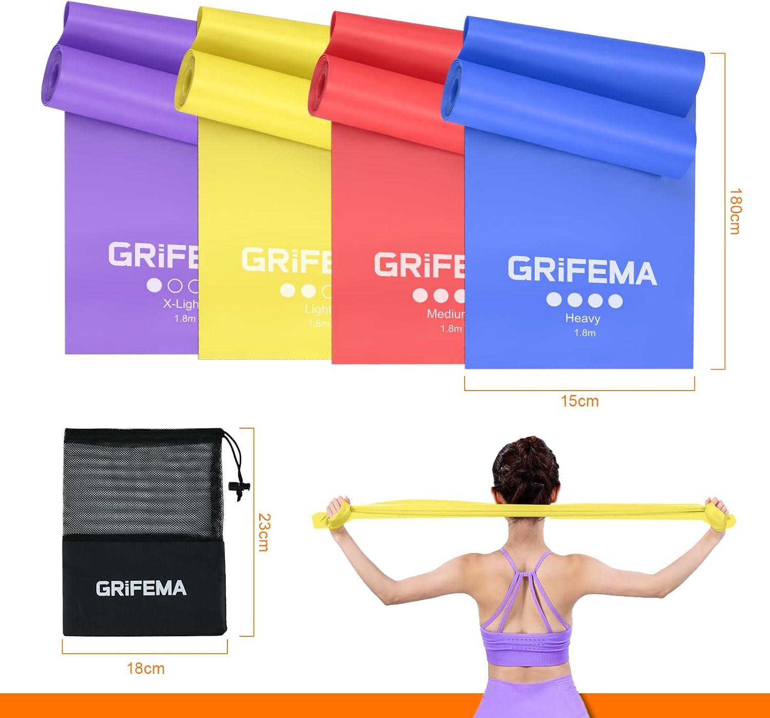 GRIFEMA GA5002 Fasce elastiche fitness [set da 4] 1,8 m, fasce elastiche con 4 livelli di resistenza per allenamento della forza, yoga, pilates