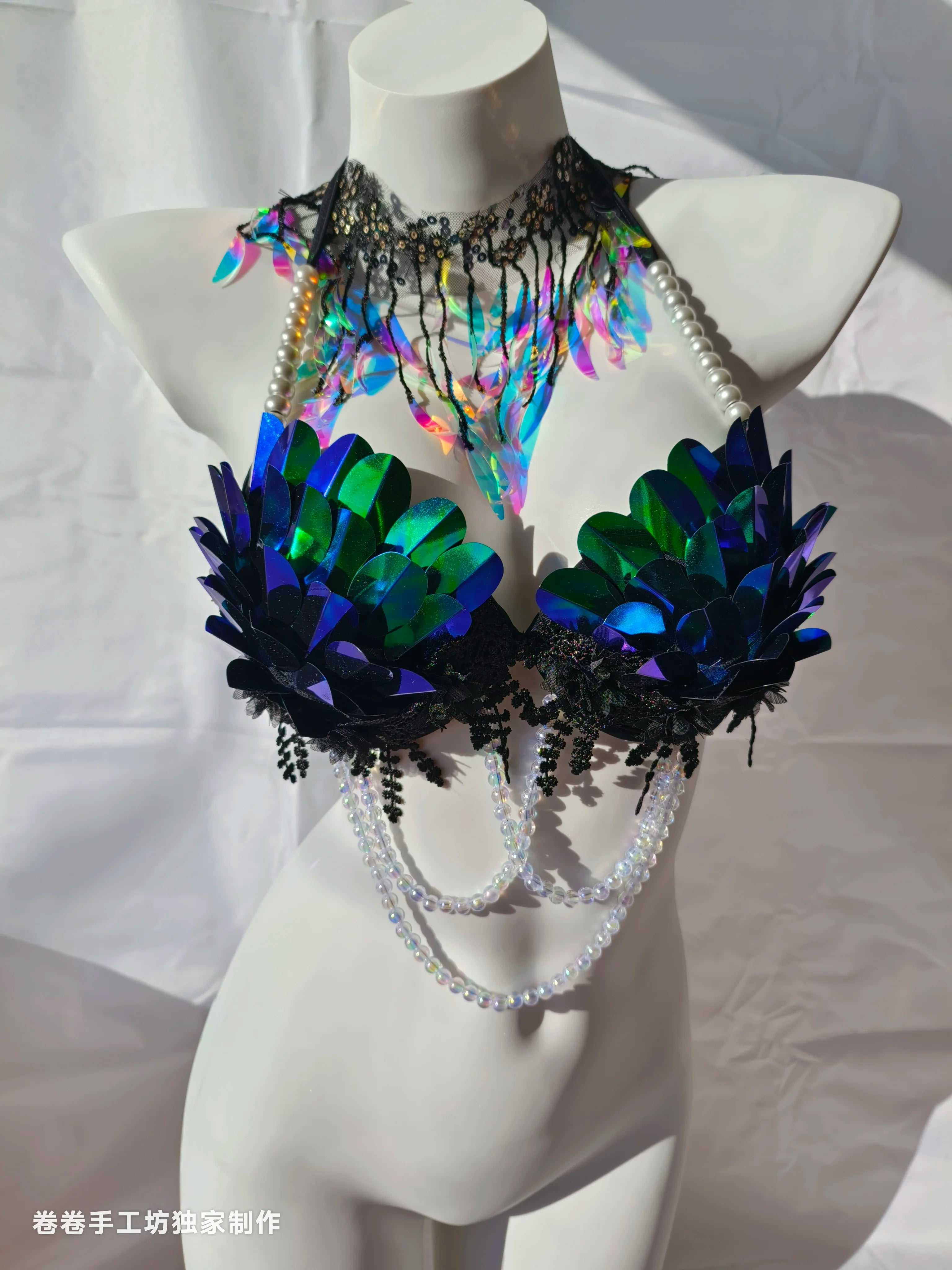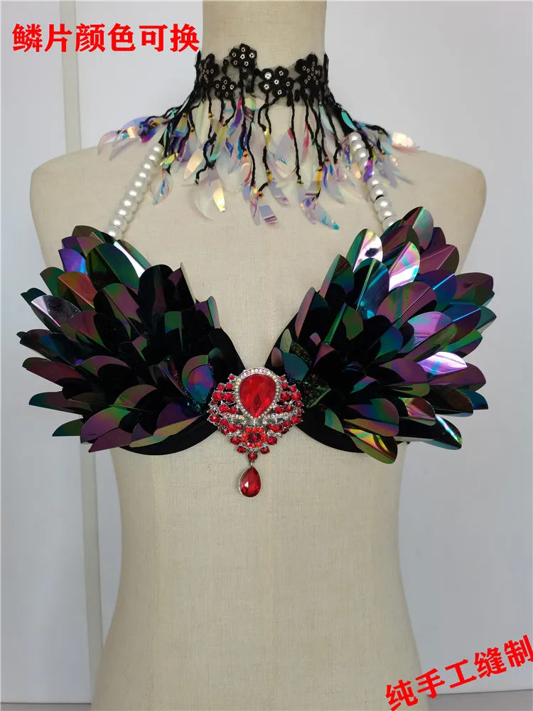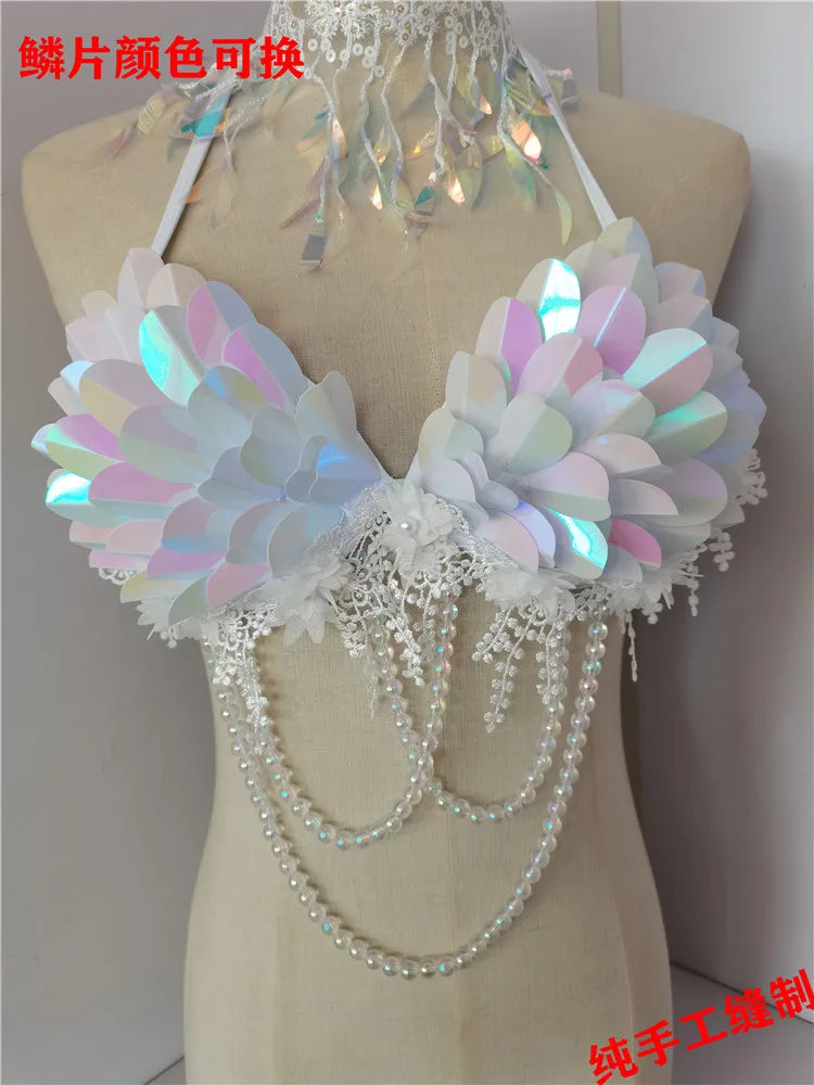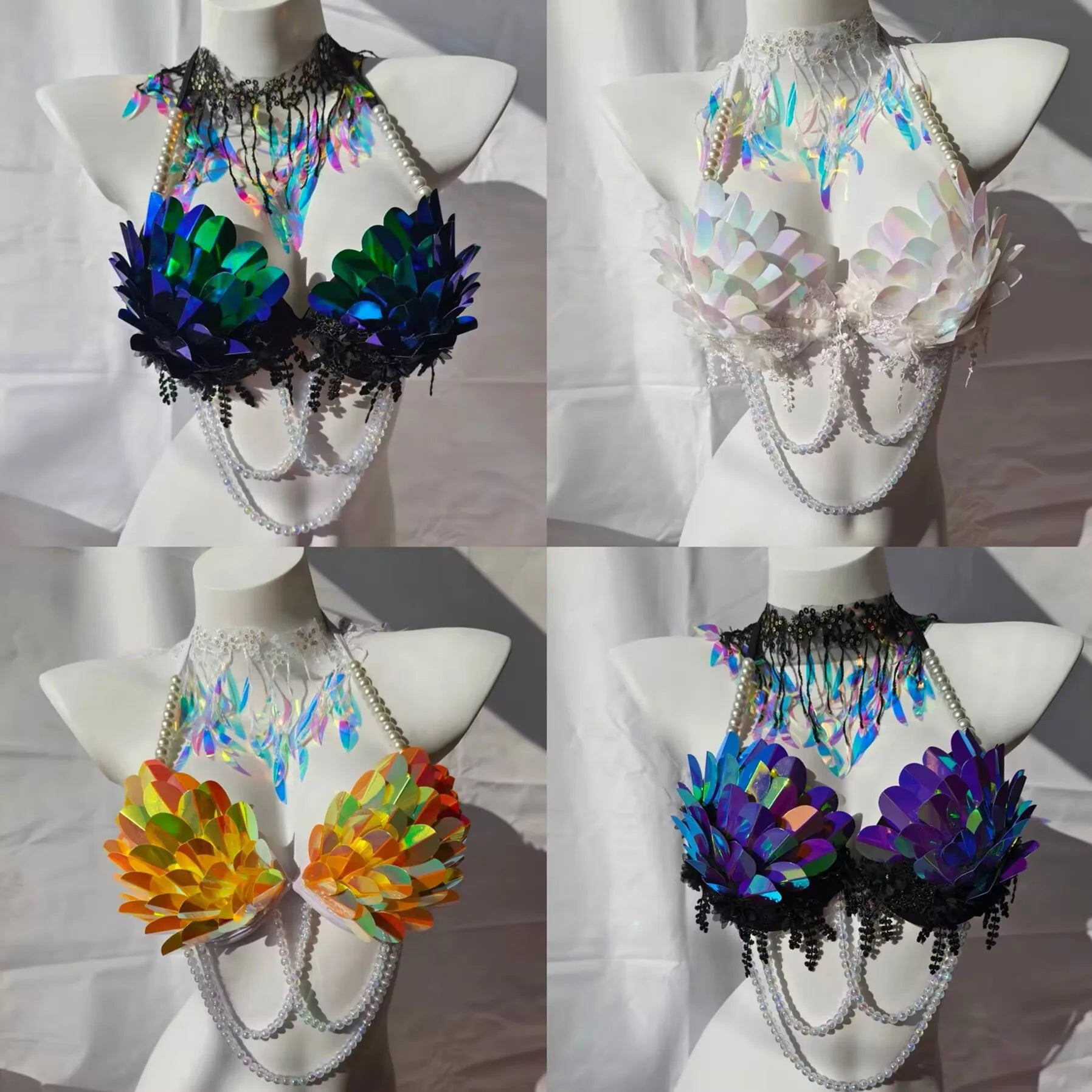 Handmade Big Fishscales Sequins Sexy Bikini Bra with Pearl Neckband Sparkle Fish Scales Swimwear Top For Night Club Dancing Show