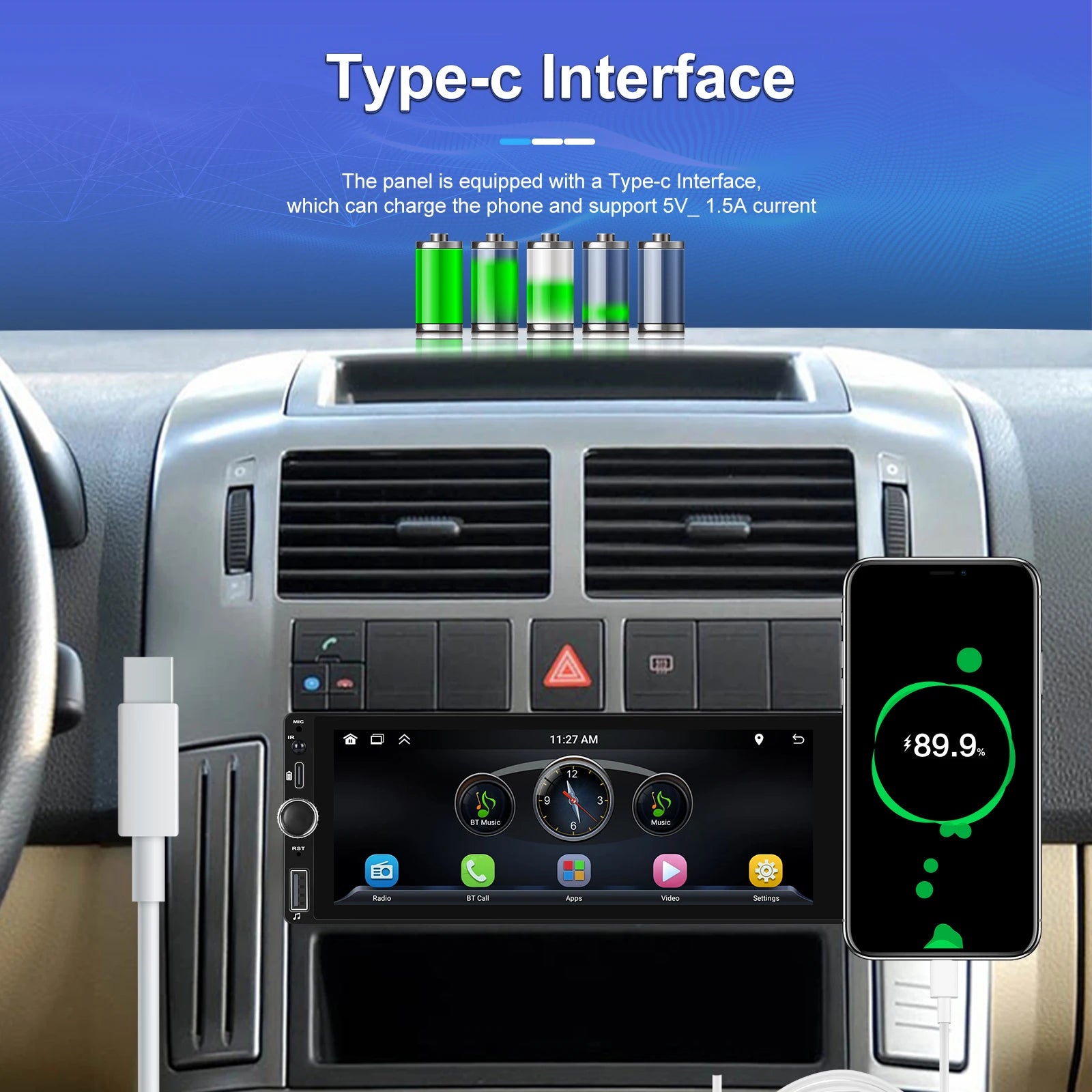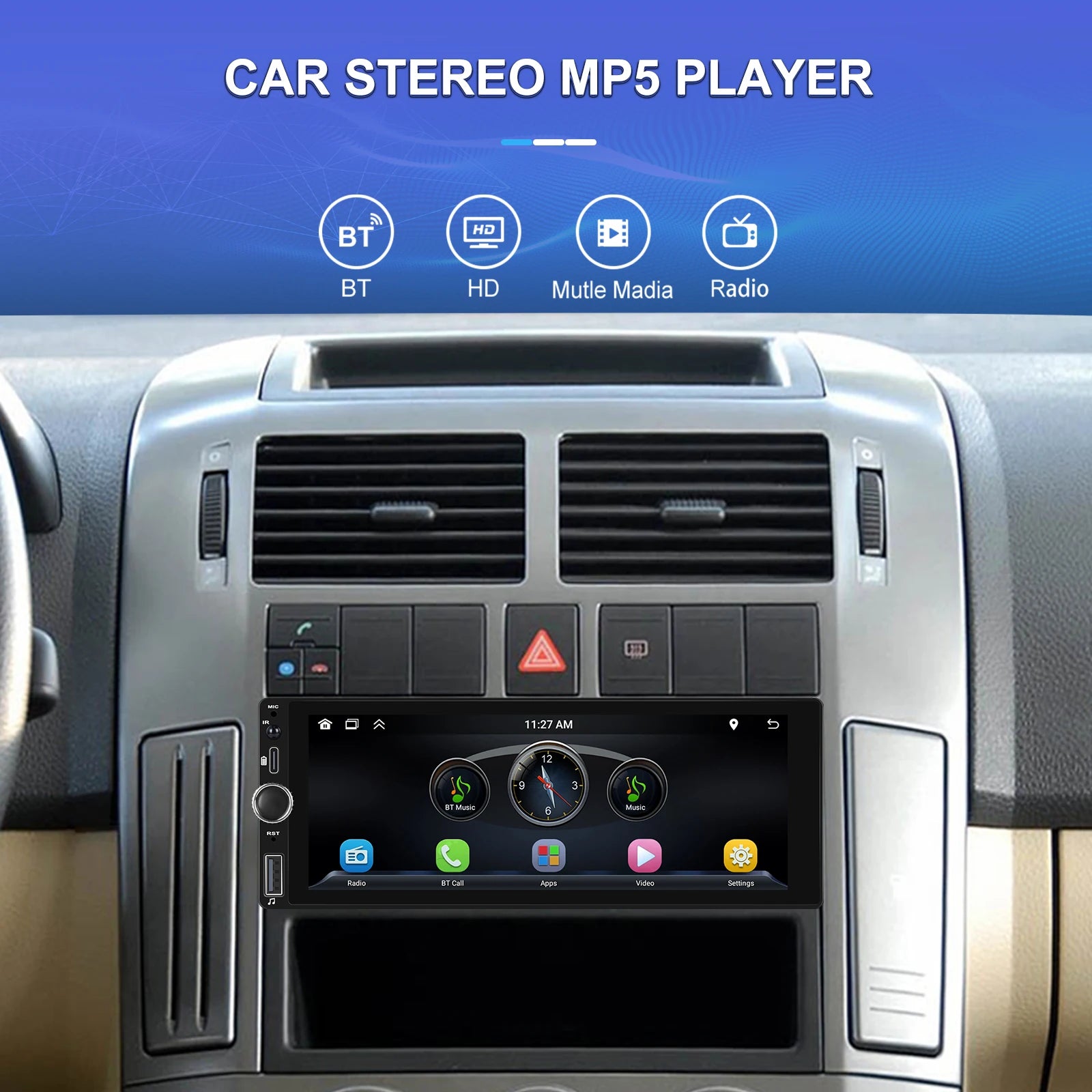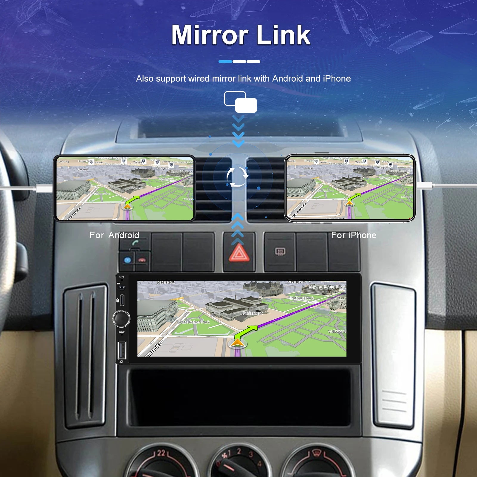 ● Mirror Link: Support Android/ Iphone Mirror Link through phone's original USB line synchronized to the on-board screen.