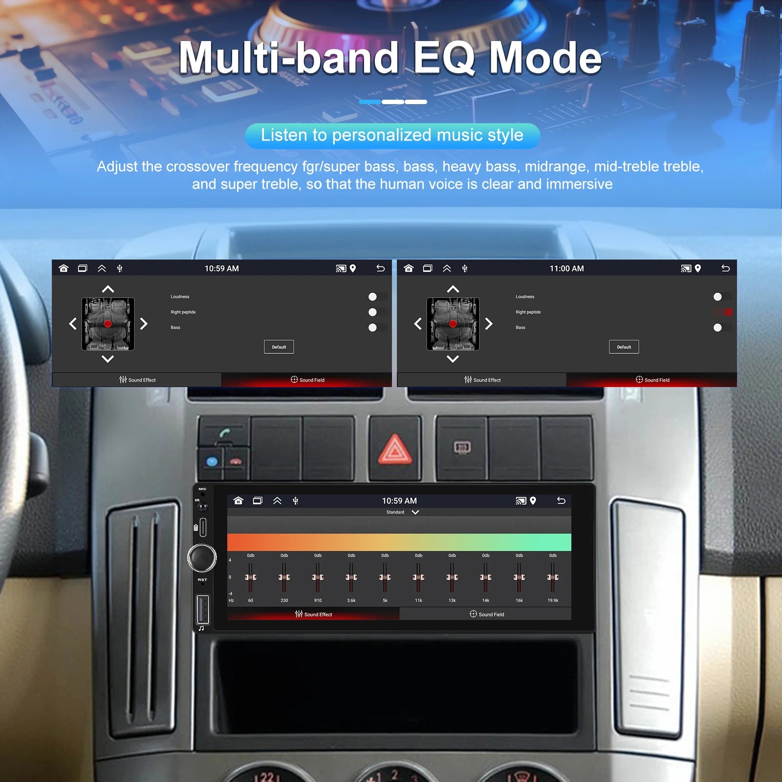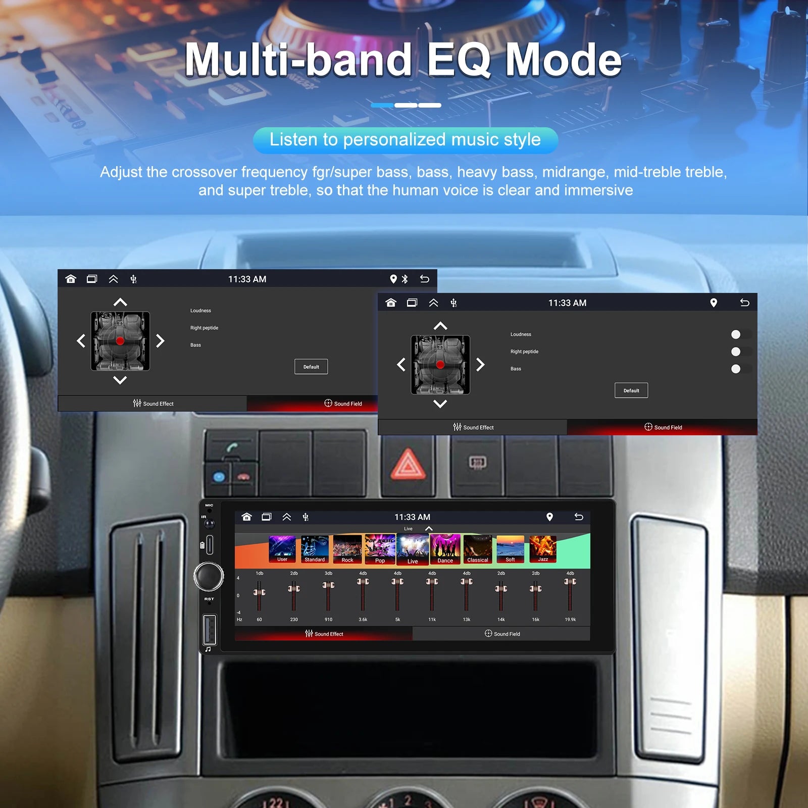 ● Hardware electronic sounds (EQ) processing, multiple EQ modes, treble and bass can be adjusted.