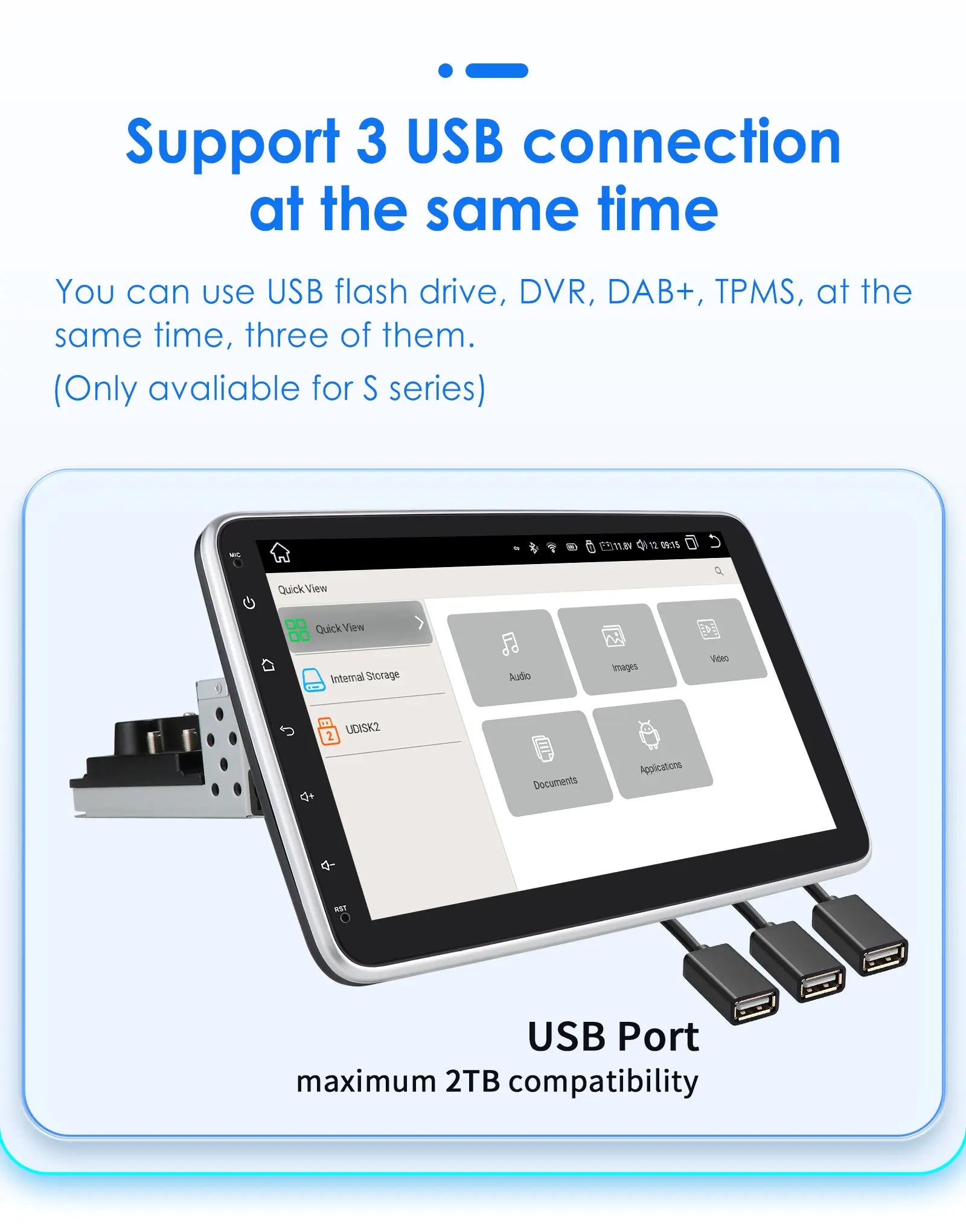 You can use USB flash drive,DVR,DAB+,TPMS at the same time,three of them. (Only avaliable for S series)