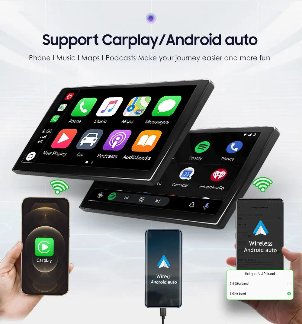 Support wireless Carplay, wired Android Auto, and wireless Android Auto(which needs to set your phone WiFi hotspot's AP Band as 5 GHz band).