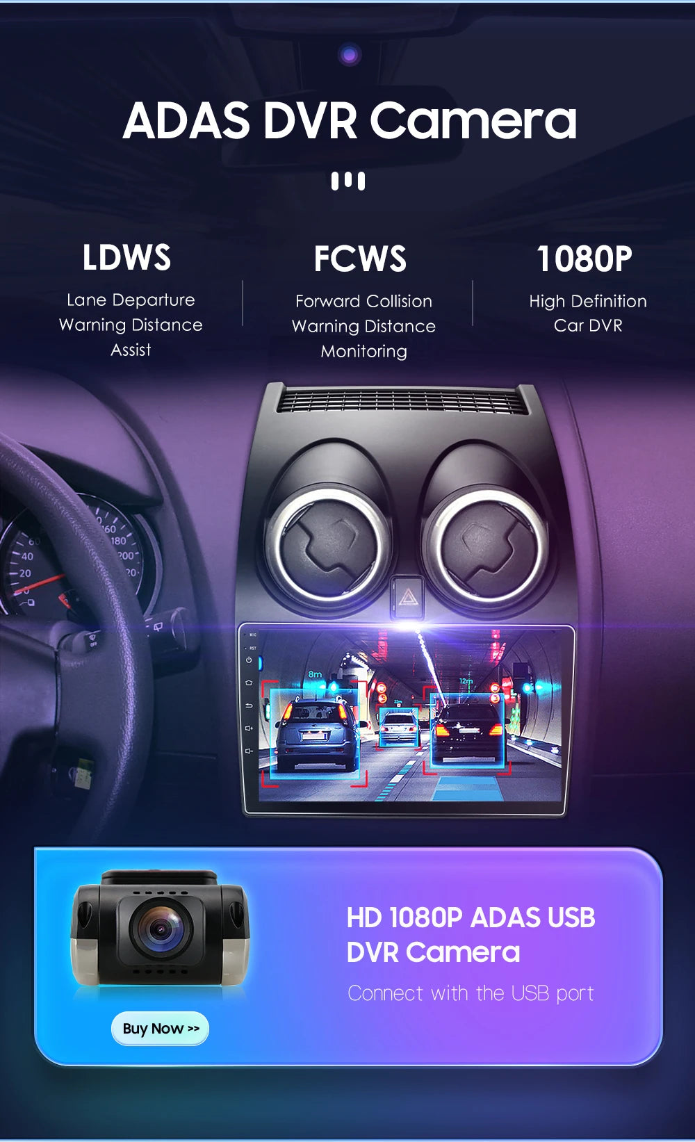 HD 1080P ADAS DVR Camera(Needs to order separately) --connect with the USB port:  LDWS(Lane Departure Warning Distance),FCWS(Forward Collision Warning Distance), 1080P(High Definition Car DVR).