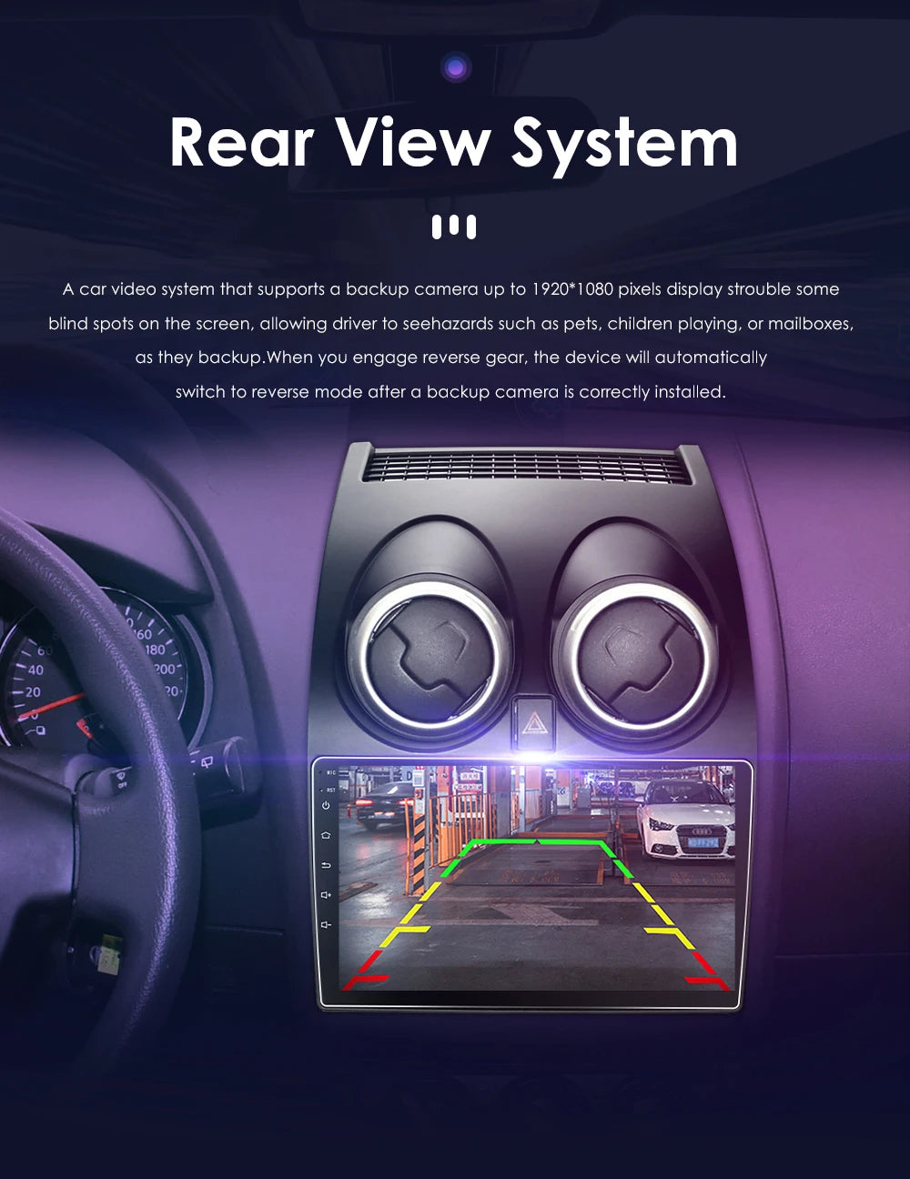 Rear View System(Rear View Camera needs to order separately):  A car video system that supports a backup camera displays troublesome blind spots on a monitor , allowing a driver to see hazard such as pets ,children playing ,or mailboxes ,as they backup.