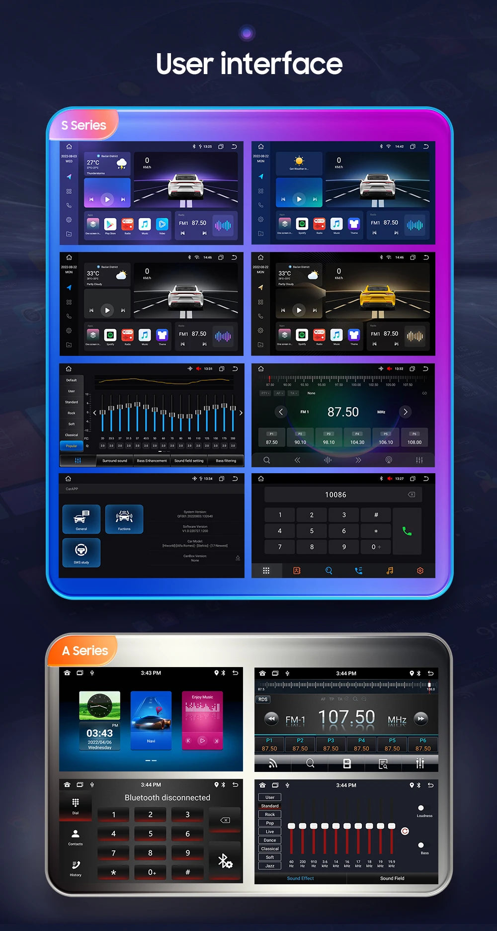 User interface: S Series(can set as 4 color type: Purple/ Dark blue / Black / Golden) included S8/ S7/ S6/ S5/ S4/ S3/ S2/ S1 version; and A Series included AC1 / AC2 version.
