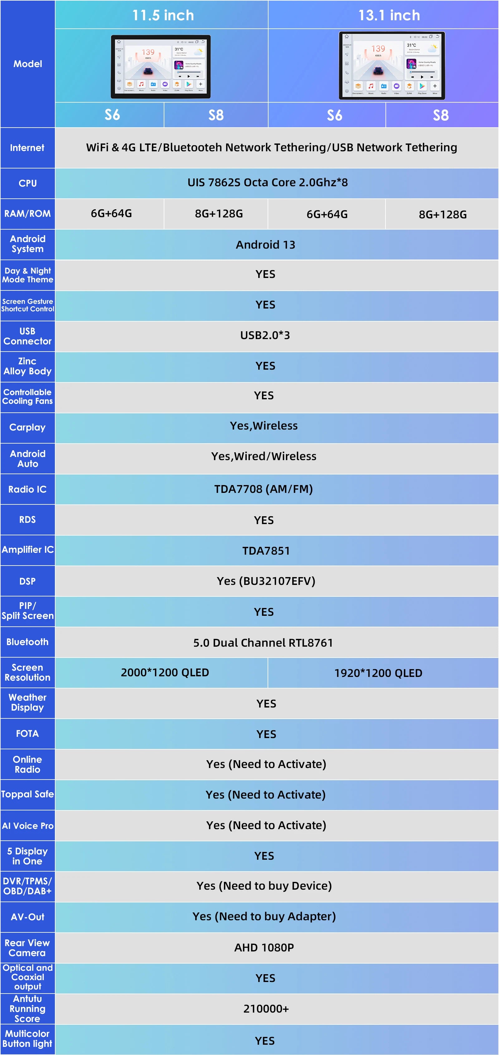 Small cooling fan ( Needs to order separately) : Note: the product comes standard without a fan , and the S series can be purchased as an option.GPS Navigation: Supports Online and Off line Google map, Navitel, Waze, Herewego To avoid congestion choose lanes recently , the way of voice complement sensory information.Optical and coaxial digital audio output : This function is only supported by S5/S6/S7/S8 seriesSupports AV-OUT: AV OUT box ( Needs to order separately) Split Screen : You can use 2 apps at the same time (such as: Navigation + Music , ADAS Camera + Music ,etc.)