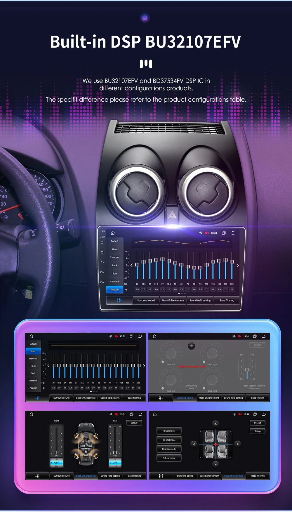 Built-in DSP BU32107EFV: We use BU32107EFV and BD37534FV DSP IC in different configurations products. The specifit difference please refer to the product configurations table.
