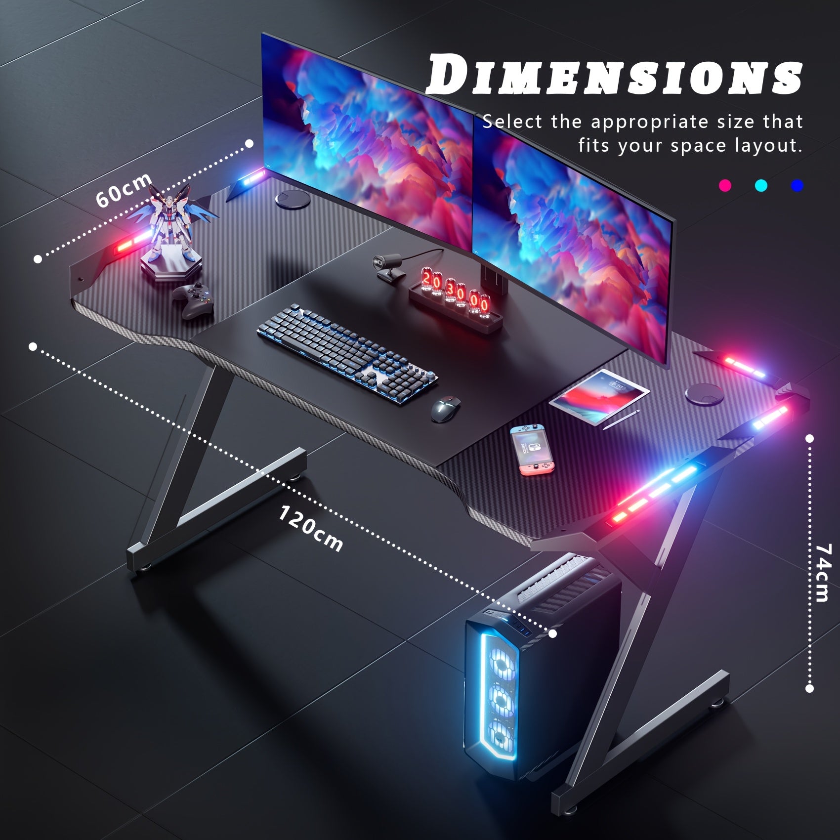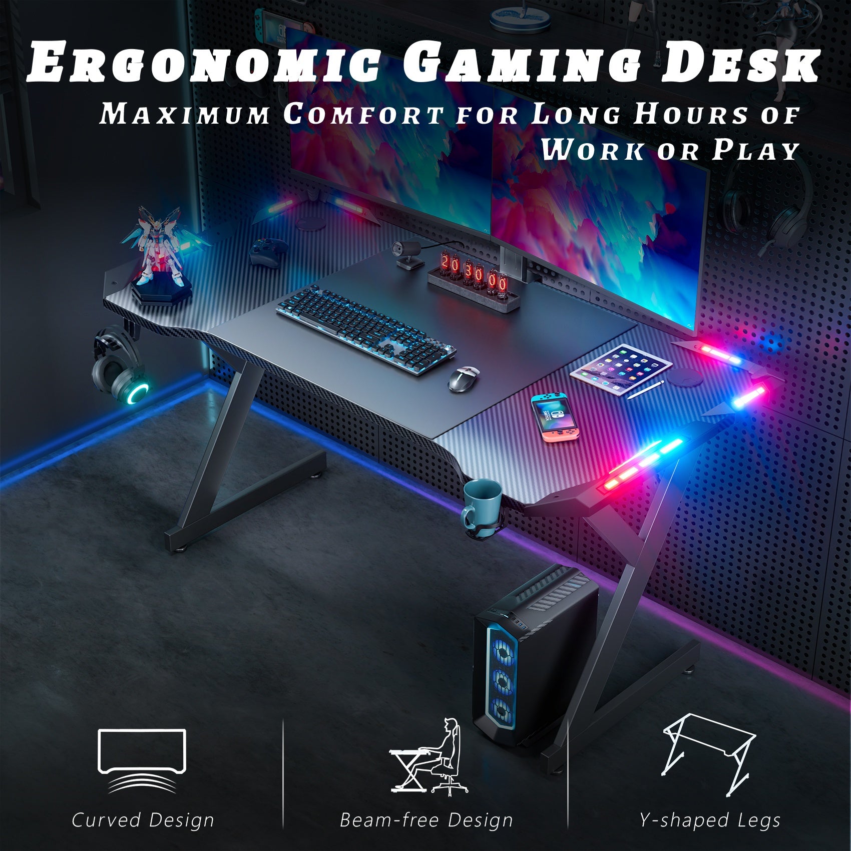 HLONONE Scrivania da Gaming LED 120 x 60 cm, Tavolo pz Robusto con Rivestimento in Fibra di Carbonio, Porta Bicchieri e Ganci per Cuffie, Nero