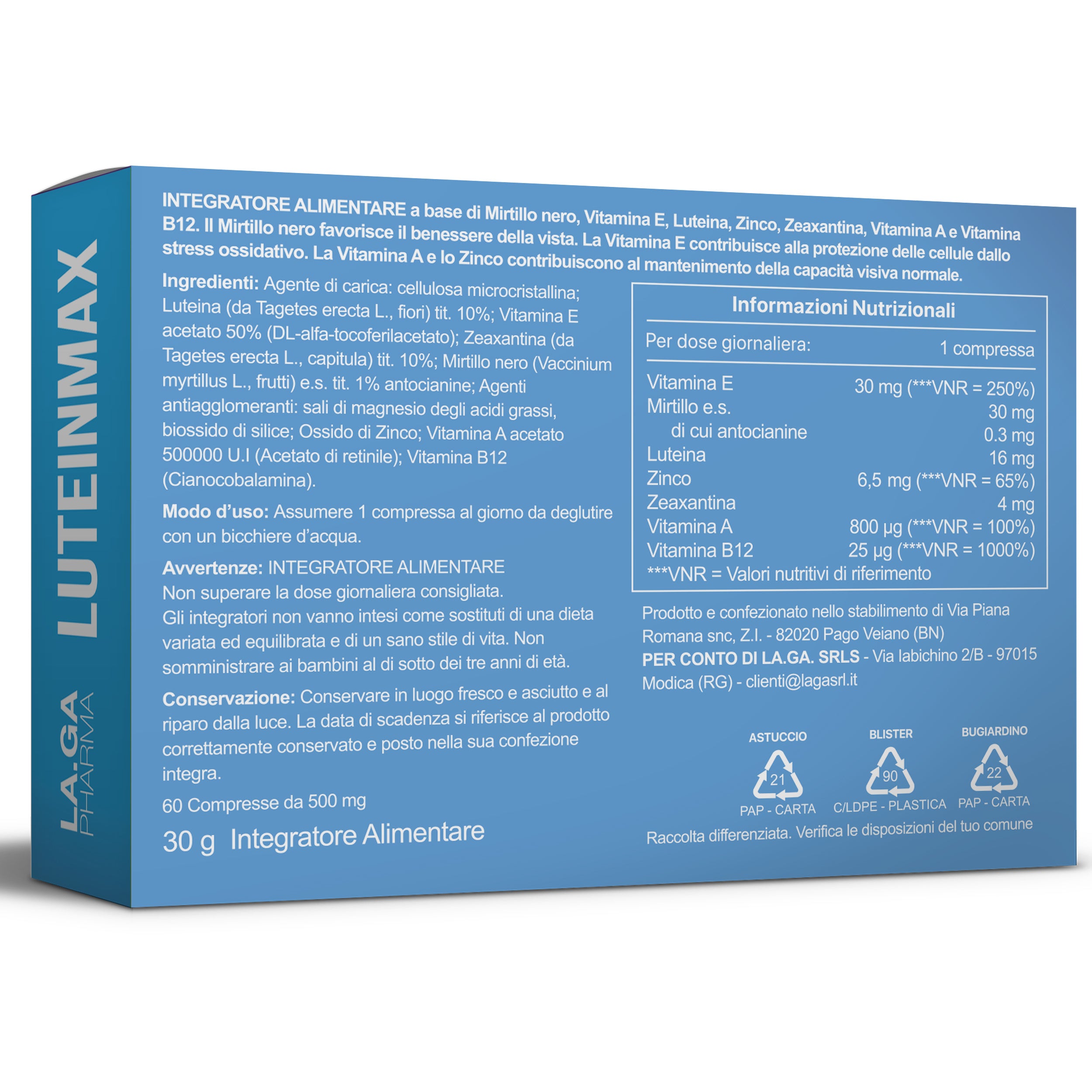Integratore Occhi con Luteina e Zeaxantina Alto Dosaggio. 60 Compresse con Mirtillo, Vitamine A, E, B12, Zinco. Antiossidanti Integratori Occhi Vista. Protegge da Stress Ossidativo e Maculopatia