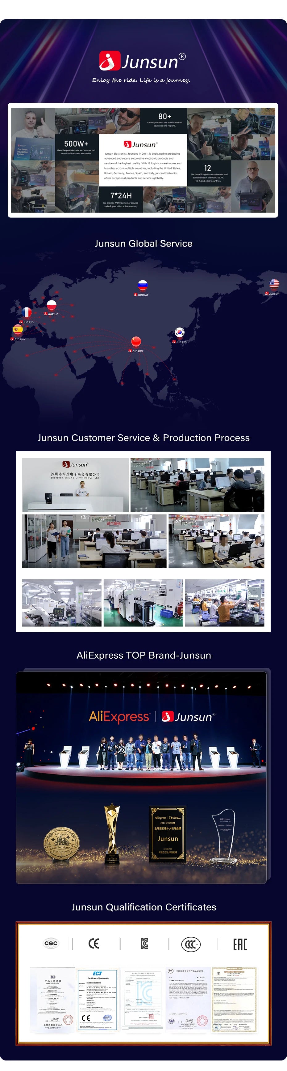 4. Junsun brand introduction:AliExpress Top 10 Brands, Junsun has 2000K+ fans, Over the past decade, we have served over 5 million users worldwide, popular among customers.Our goal is to keep working hard to make innovative hardware & software of the Car Multimedia player radio to give you that personalized experience. We provide updates for Firmware, Software, UI, Navigation maps for FREE.