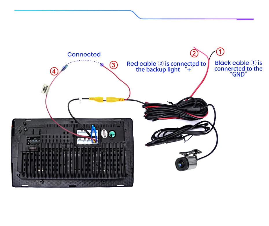 3)The reversing detection cable ④(Brown color) is connected to the red cable ③ which extending from the video input cable, please follow the picture below to connect.