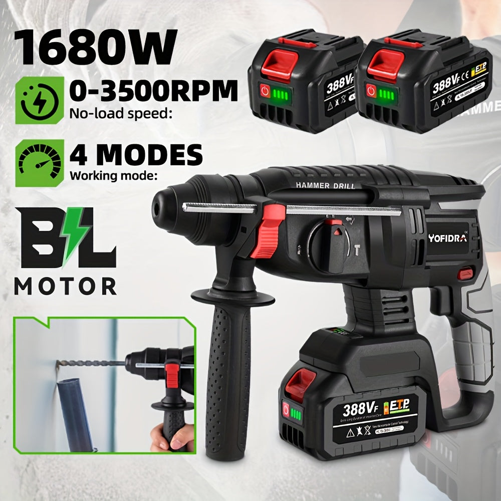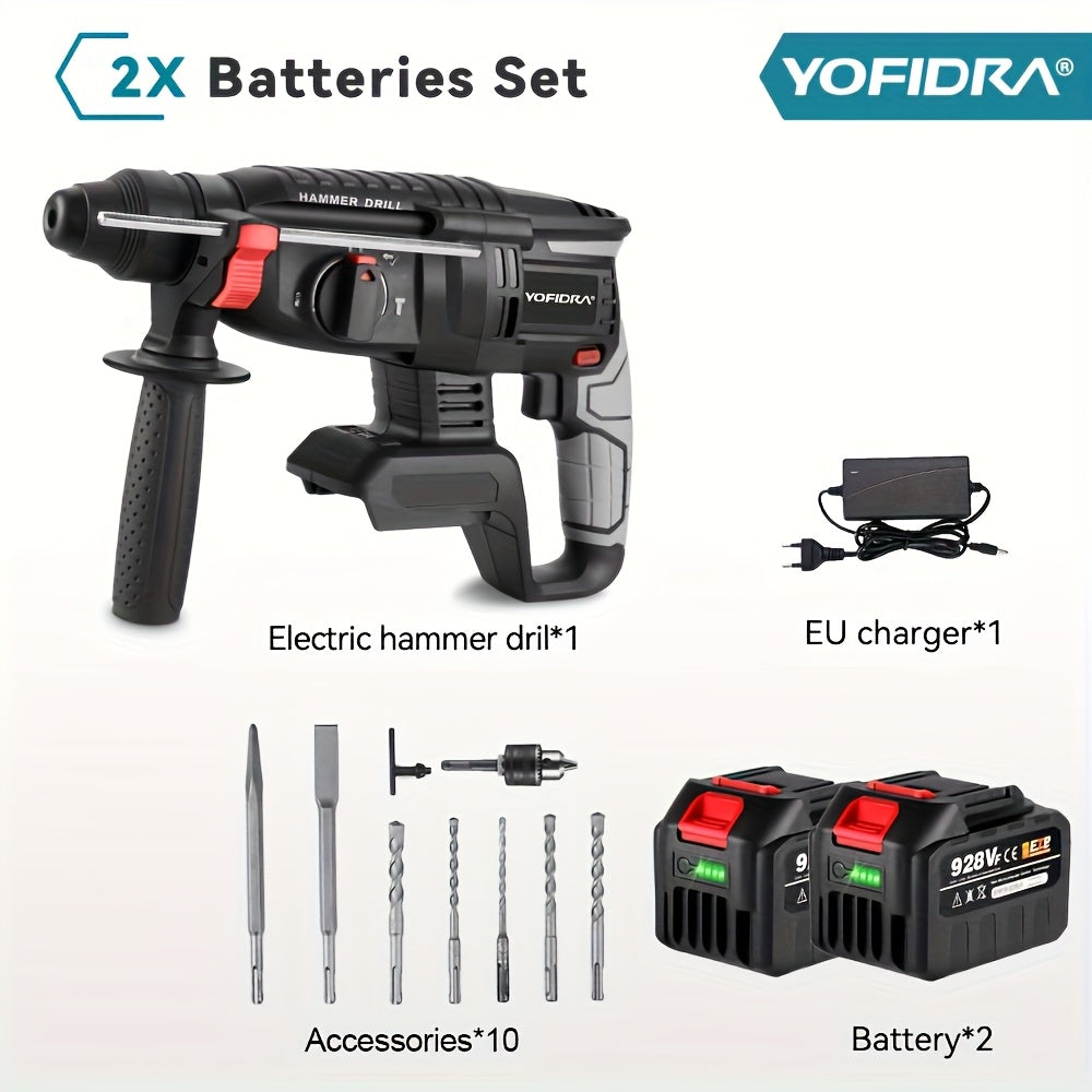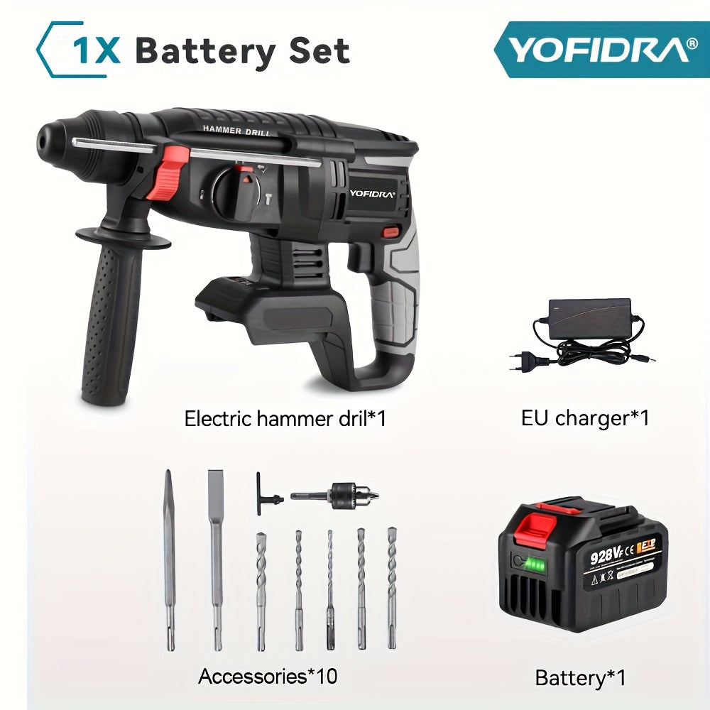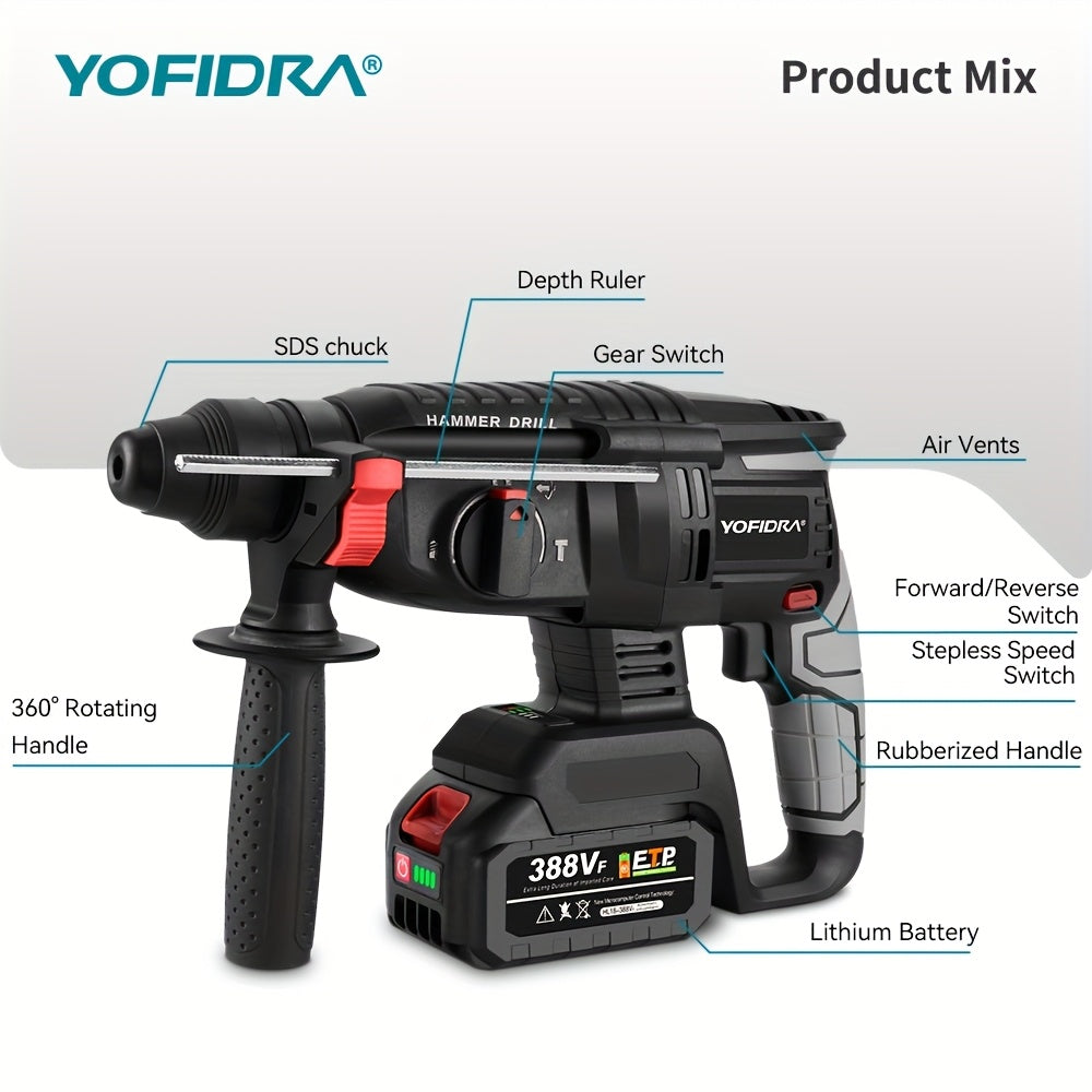 Kit Martello Senza Spazzole, Trapano a Percussione Senza Filo con Ricarica 4 Velocità, Adatto per Calcestruzzo, Acciaio e Legno, Batteria YOFIDRA